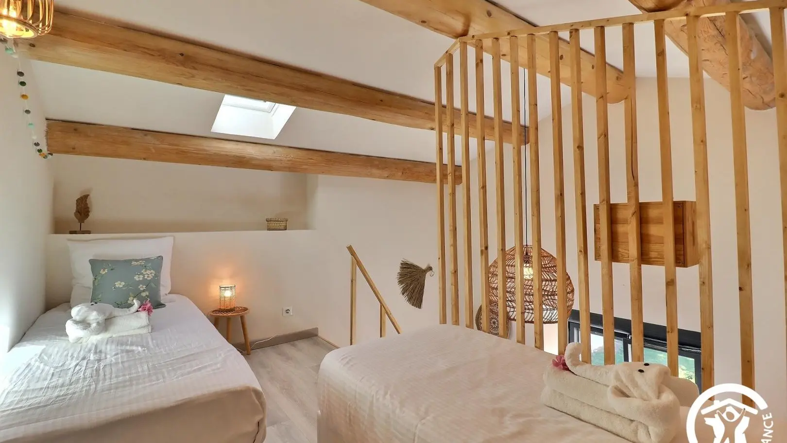 - un primer dormitorio para 4 personas con techos altos: 2 camas individuales de 80x200 cm, armario, altillo con 2 camas individuales de 80x200 cm. Baño privado con WC.
