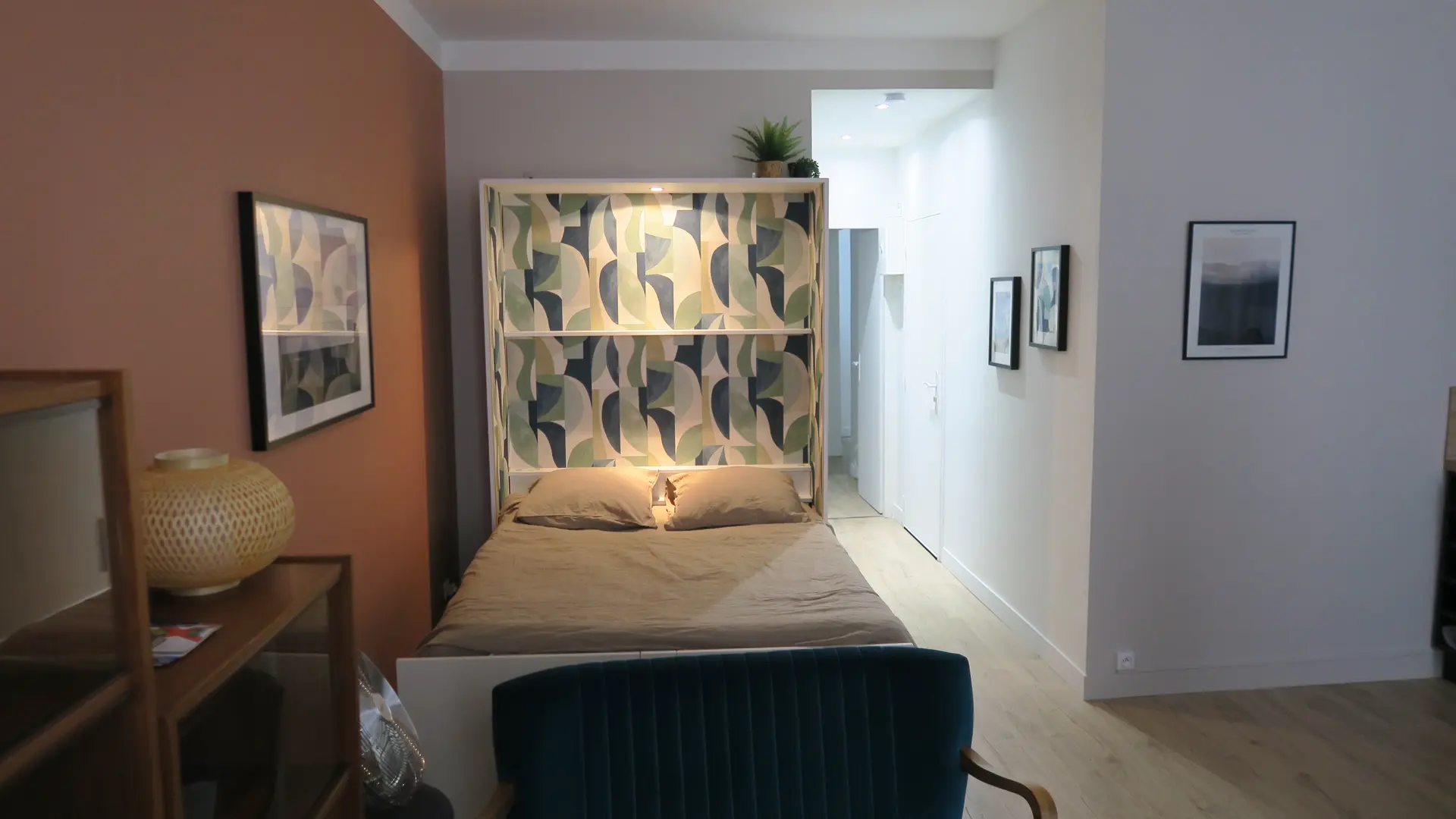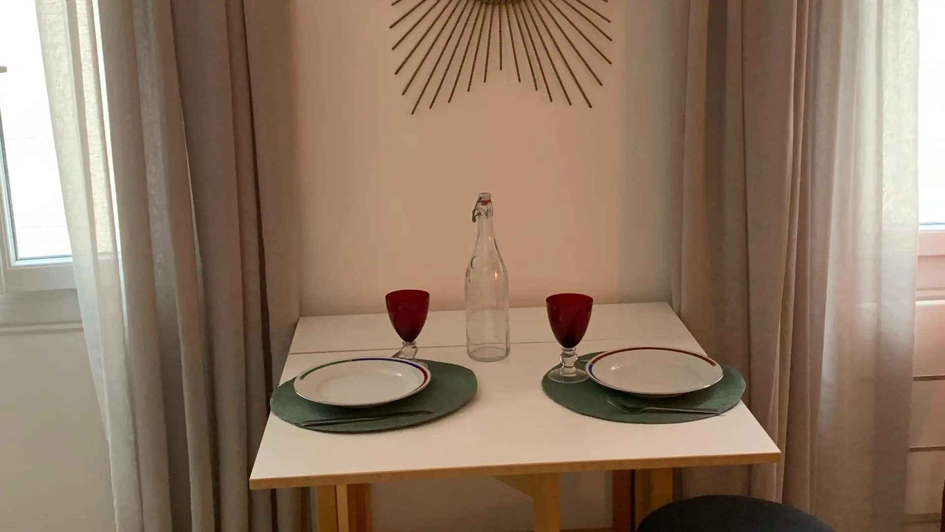 el dormitorio independiente (cama de 140 cm) contiguo a un cuarto de baño con WC y vestidor. La segunda cama es una cama plegable de 140 cm en el salón. Ropa de cama y toallas, servicio de limpieza incluido. Conexión a Internet.