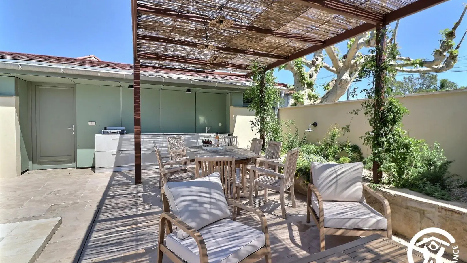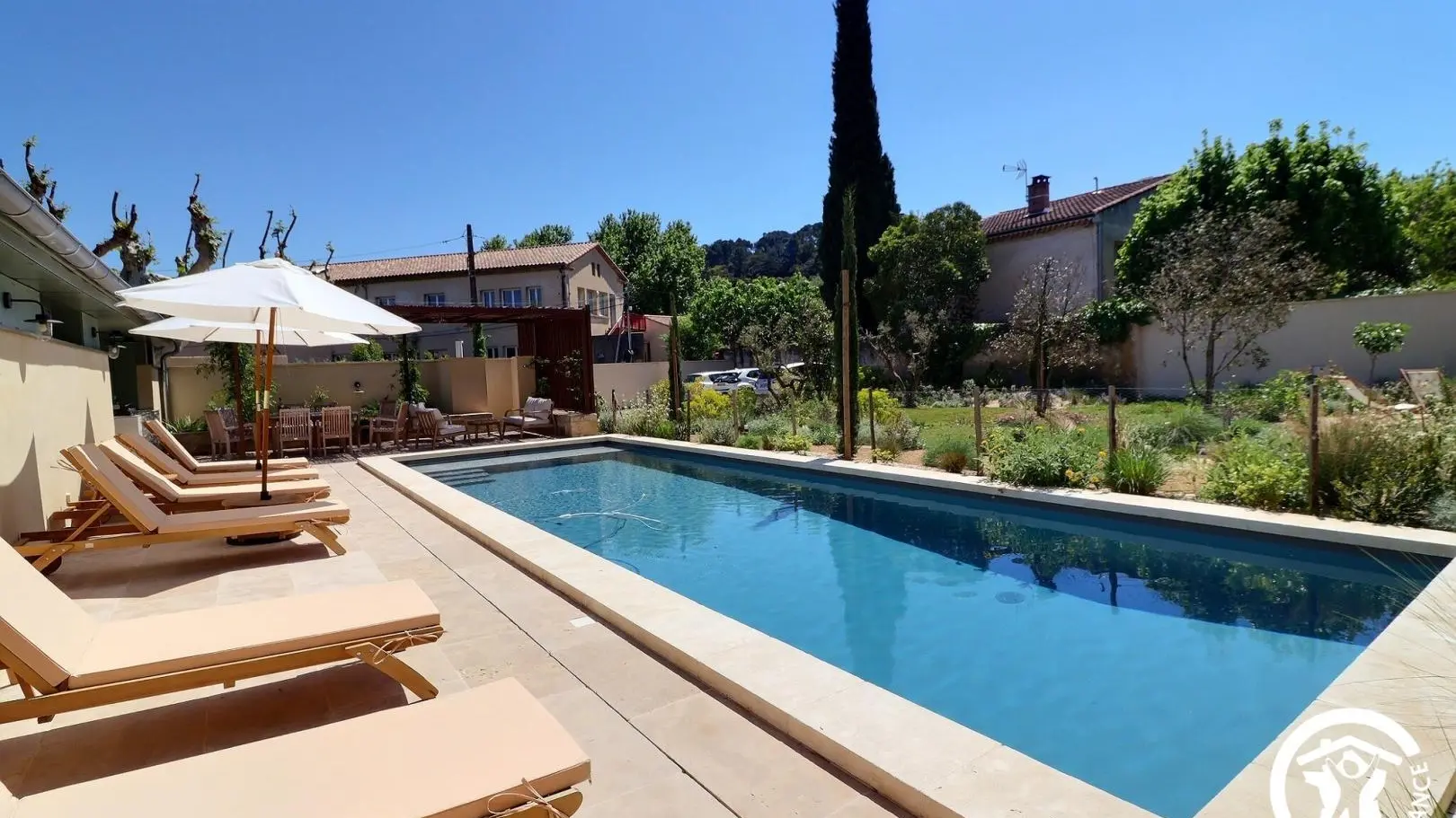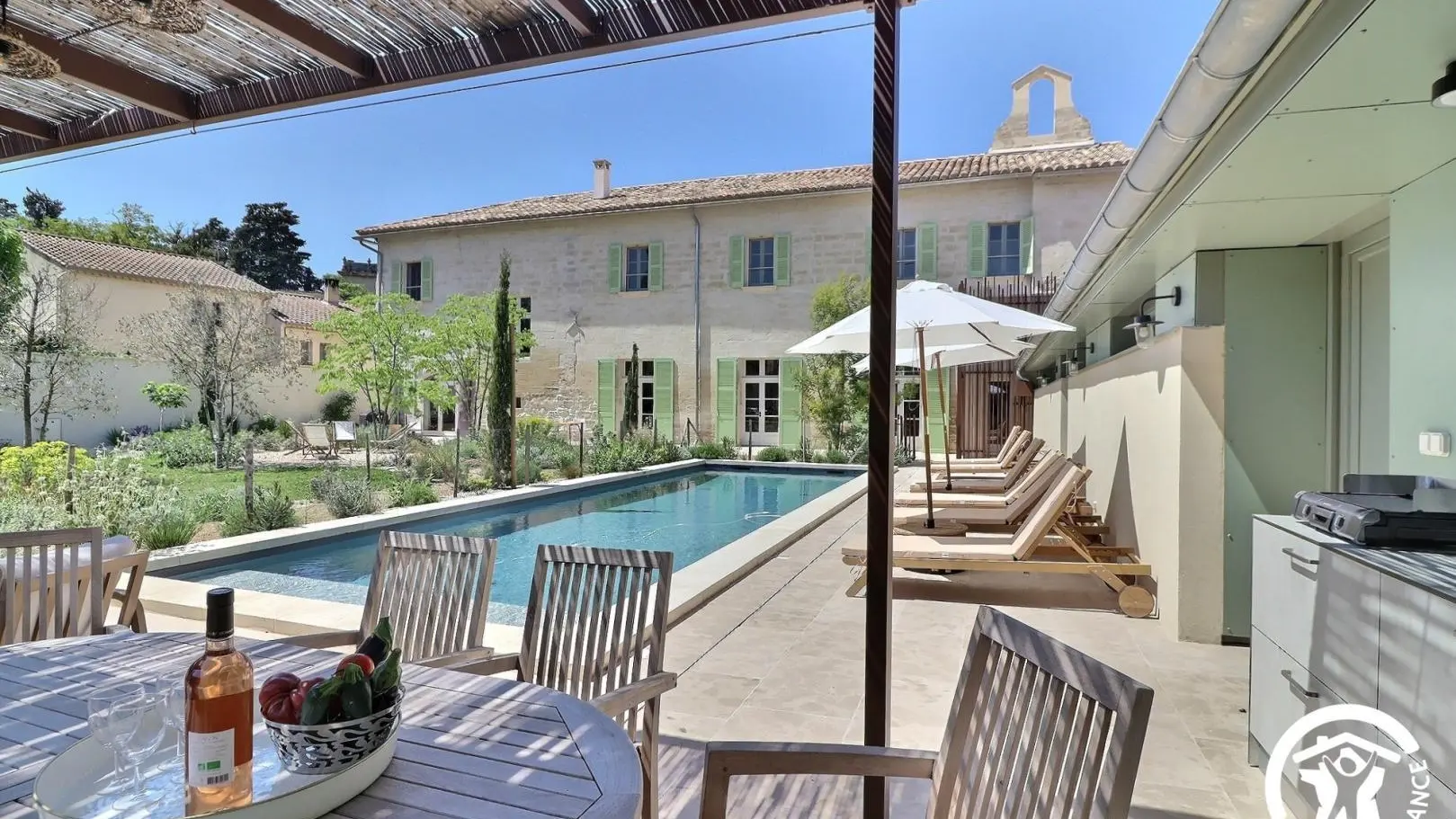 Podrá disfrutar del jardín con paisajismo provenzal compartido, su gran piscina (de sal) de 12x4 accesible de 8 a 22 horas y su cocina de verano.