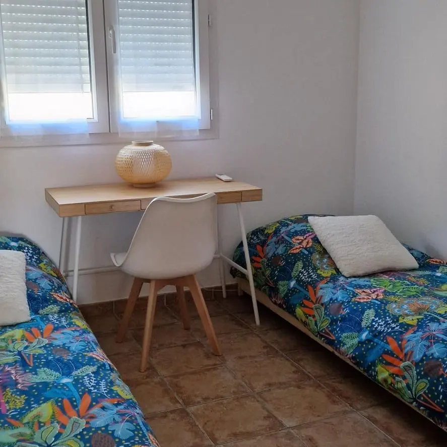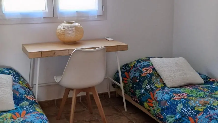 El dormitorio más grande tiene una cama de 160 cm, un escritorio y un sillón, una silla, dos mesillas de noche con lámparas y un amplio vestidor, mientras que el dormitorio más pequeño tiene 2 camas contiguas de 80 cm, un escritorio, una silla, una lámpara de noche y una cómoda.