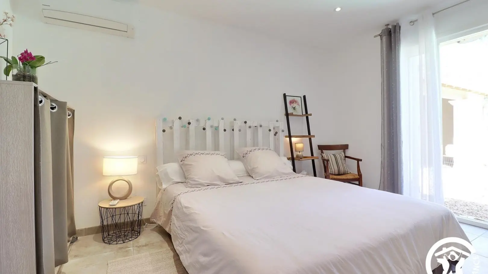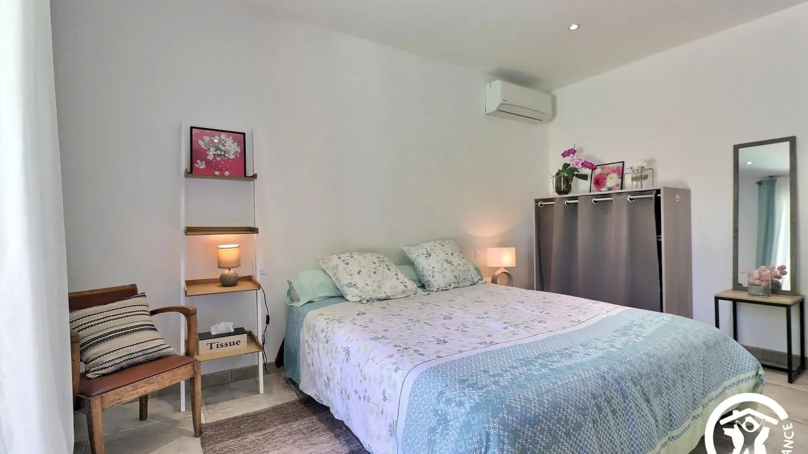 El acceso a los dos dormitorios se realiza a través de una sala común: un área de cocina y comedor con microondas, refrigerador, fregadero, mesa alta y taburetes. Es en esta sala o en la terraza donde podrá disfrutar del desayuno. Los dos dormitorios son simétricos y ambos tienen una cama de 160x200 cm, un armario, aire acondicionado reversible y un baño privado con ducha/WC. Cada uno da a la terraza ya la piscina. Los vehículos se pueden aparcar al lado de la carretera a 50 m de la casa. Todos los fuegos prohibidos.
