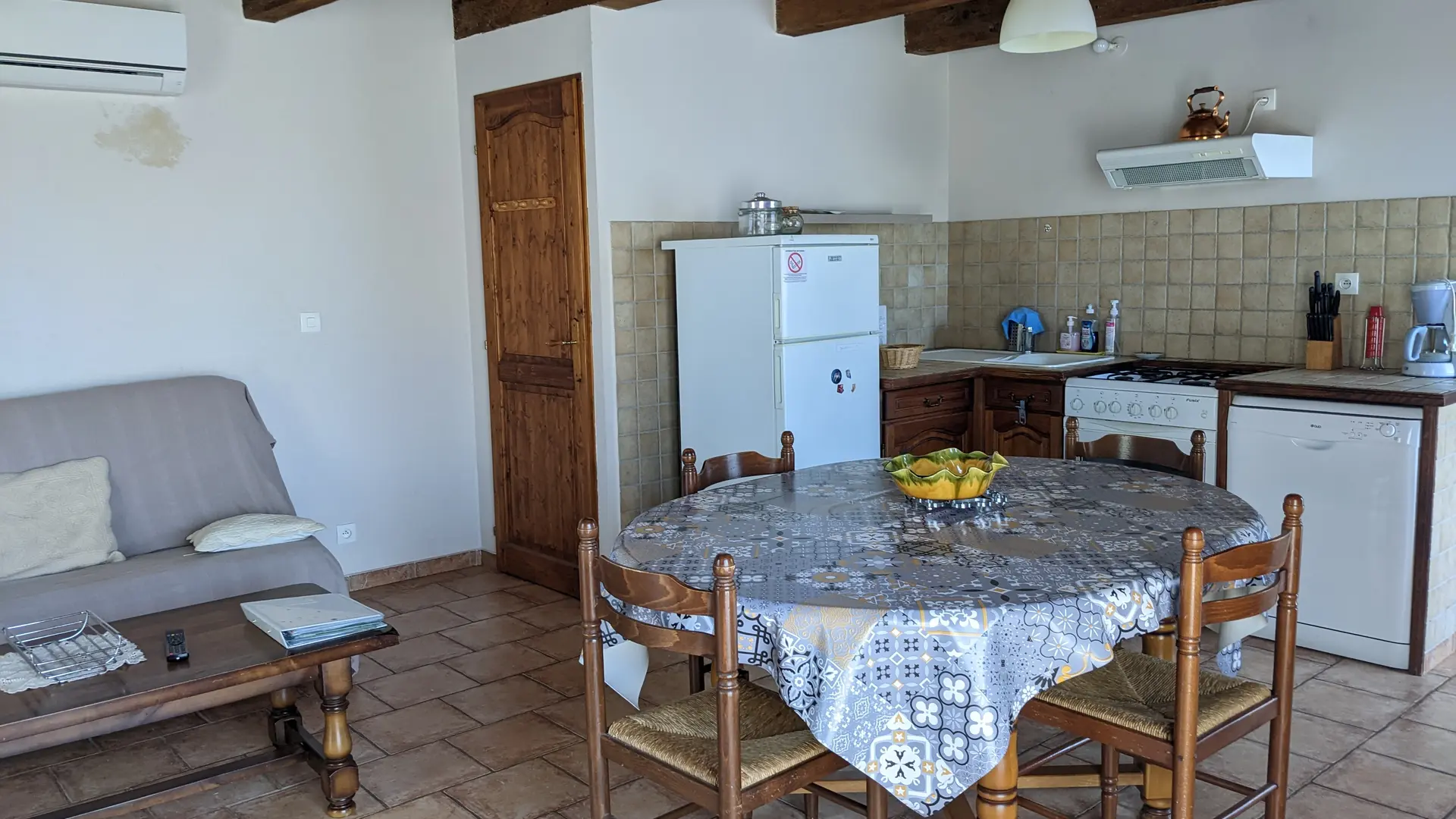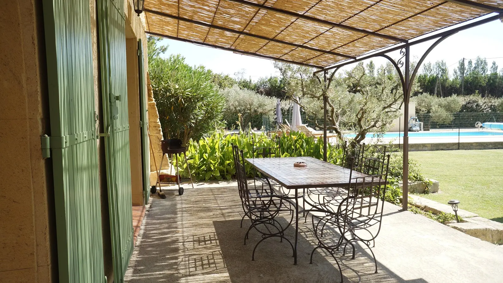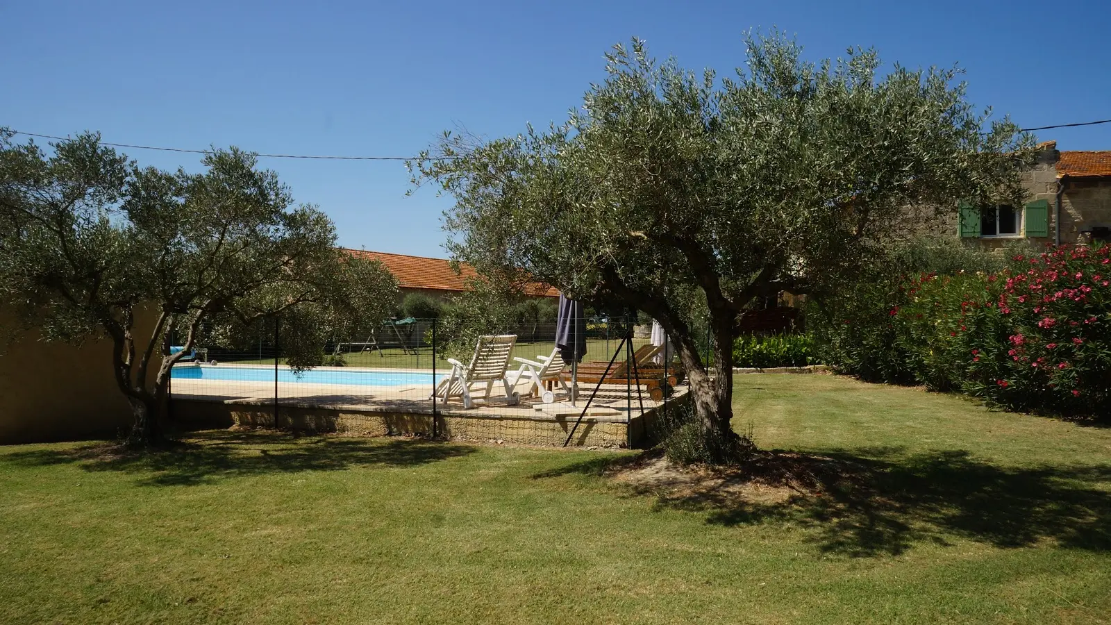 En la planta baja hay una cocina / sala de estar, arriba hay 2 dormitorios y fuera hay un gran jardín con terraza y piscina compartida (climatizada del 15/05 al 15/09).