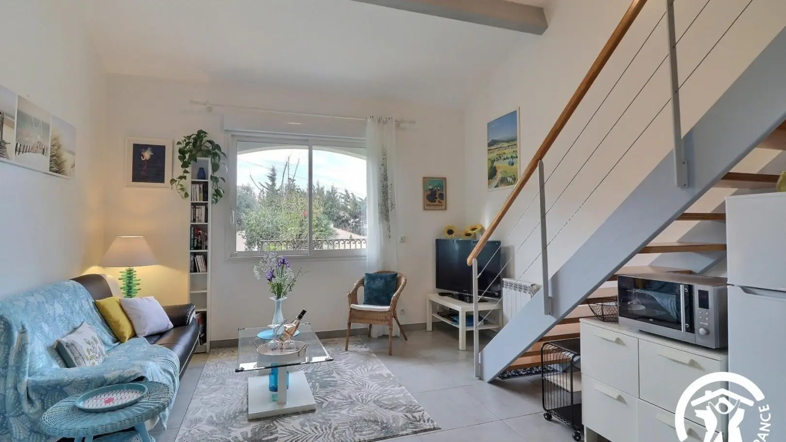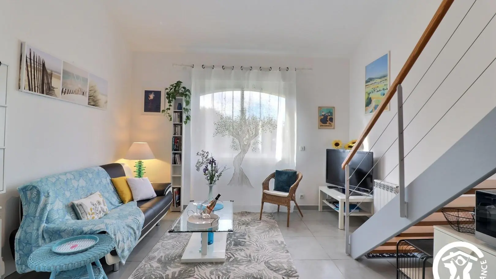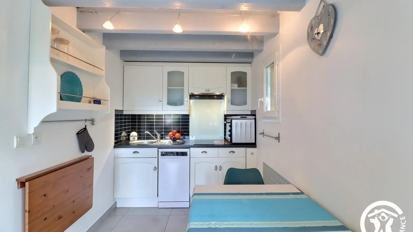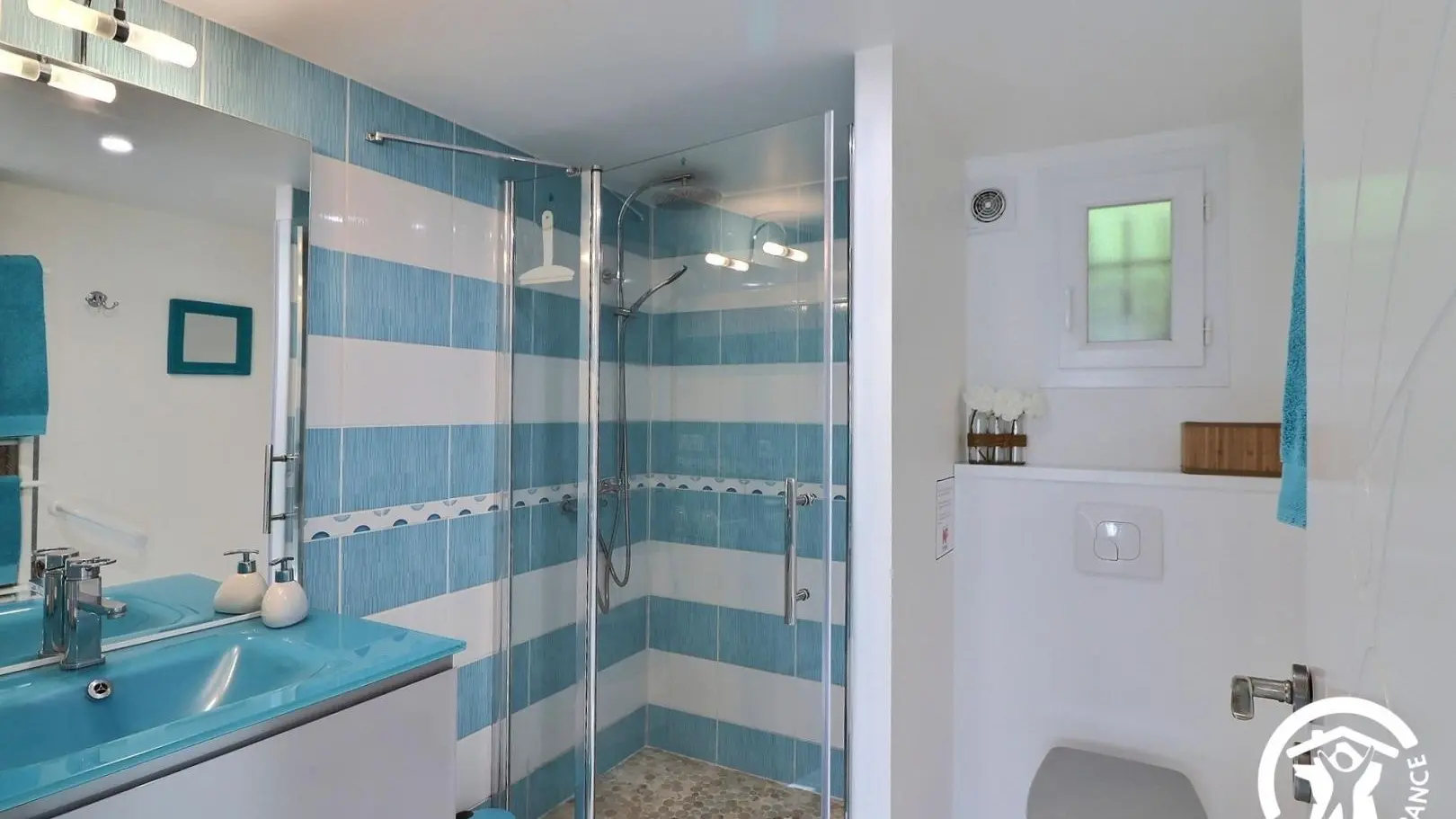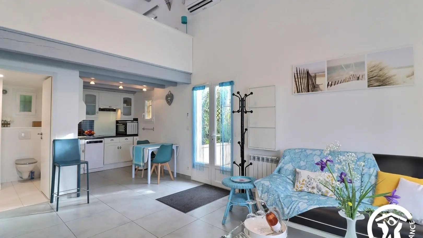 Cuarto de baño con ducha a ras de suelo, calentador de toallas, WC. Arriba, entresuelo (techo alto): zona de dormitorio con 1 cama doble de 160x200 cm, armario. Piscina comunitaria de 10 x 5 m, profundidad de 0,5 a 1,75 m, accesible del 01/04 al 01/11, asegurada por barrera y alarma. Juegos de piscina y aquabike disponibles. Aire acondicionado reversible y calefacción eléctrica (incluida). Se ofrecen sábanas y toallas. Alquiler de toallas de piscina bajo petición (5 €), limpieza de final de estancia opcional.