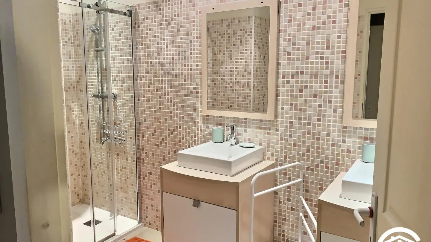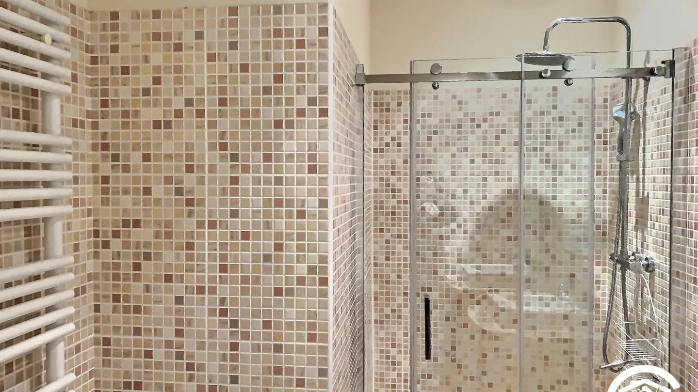 Cuarto de baño con cabina de ducha de 80x80cm, doble lavabo y toallero calefactable. WC separado.