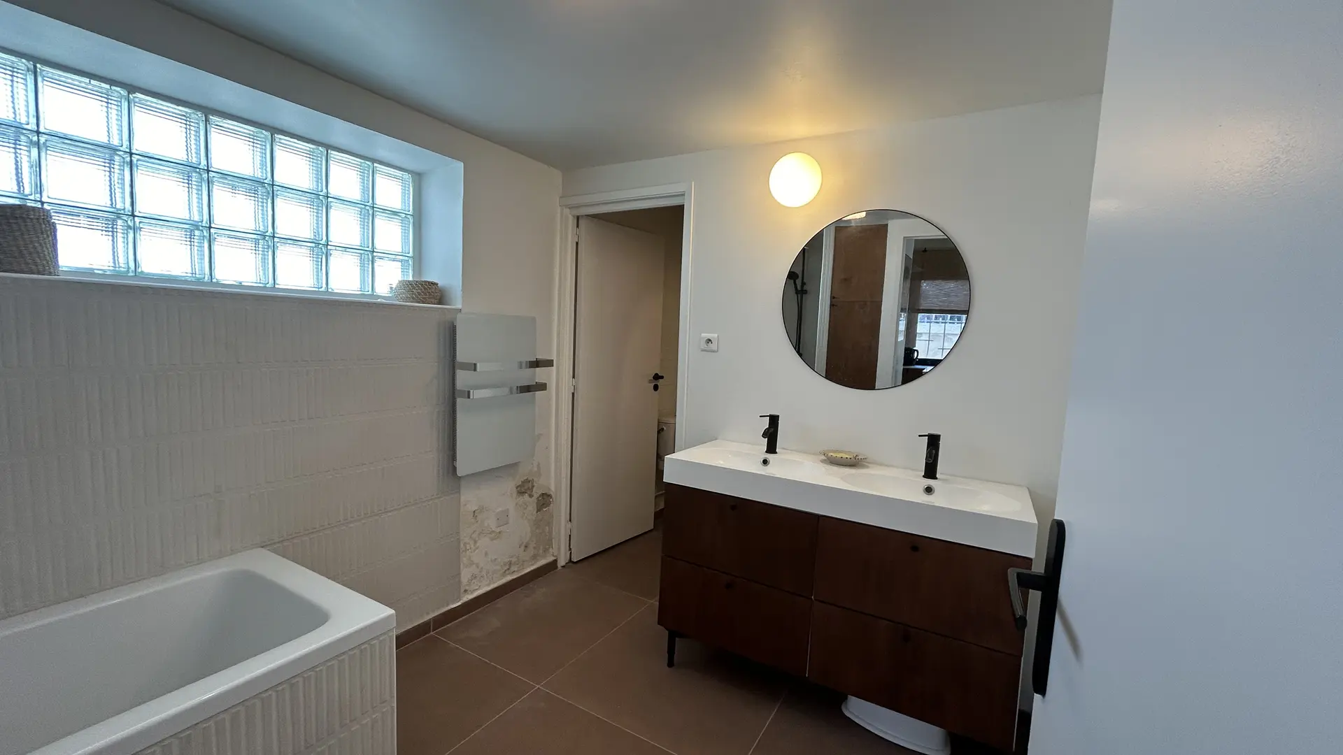 - Un baño con bañera y un aseo separado con lavadora,