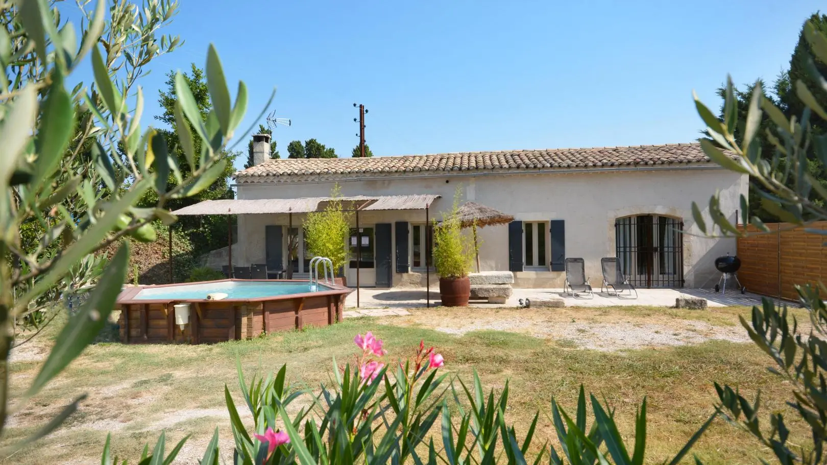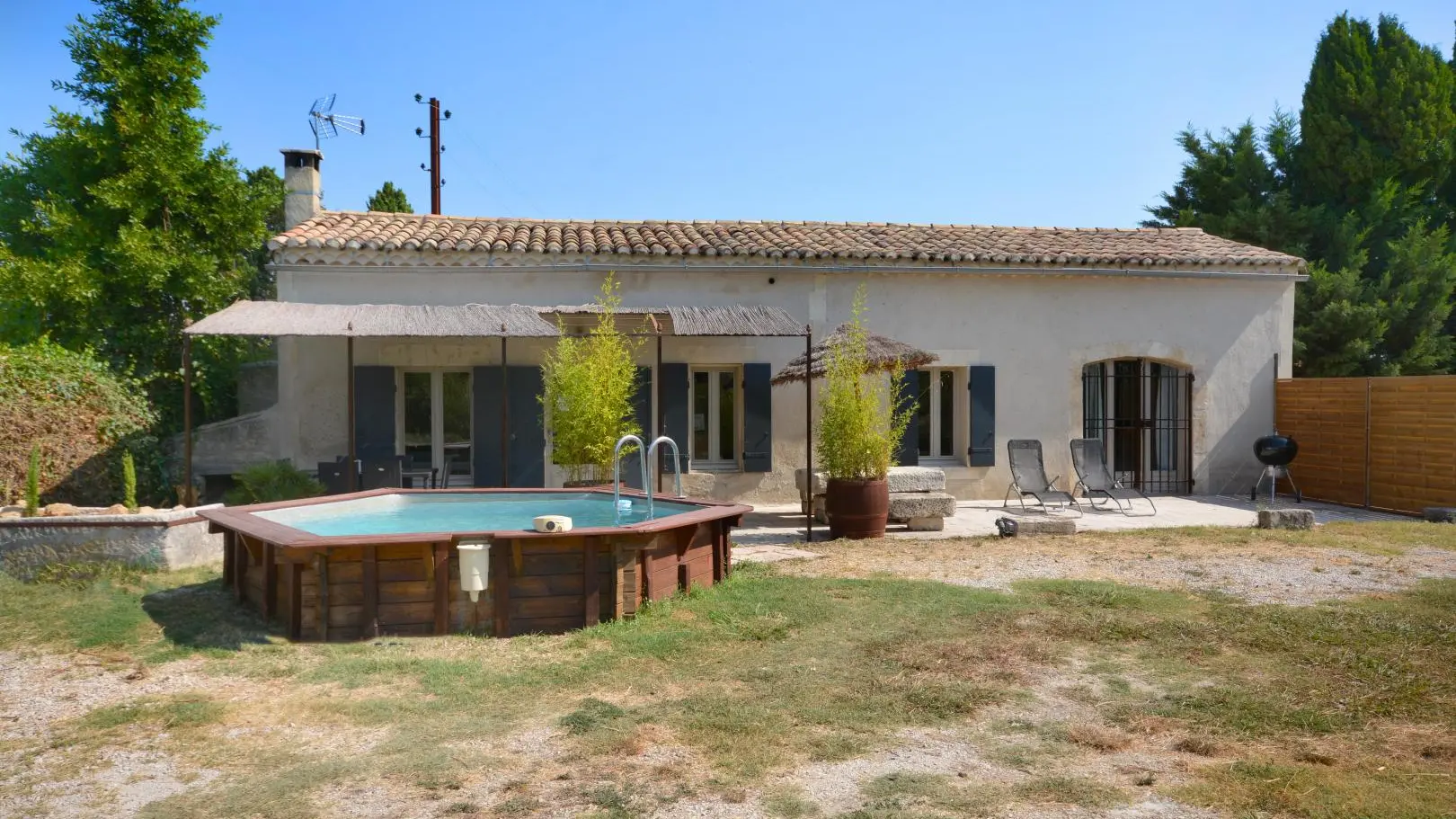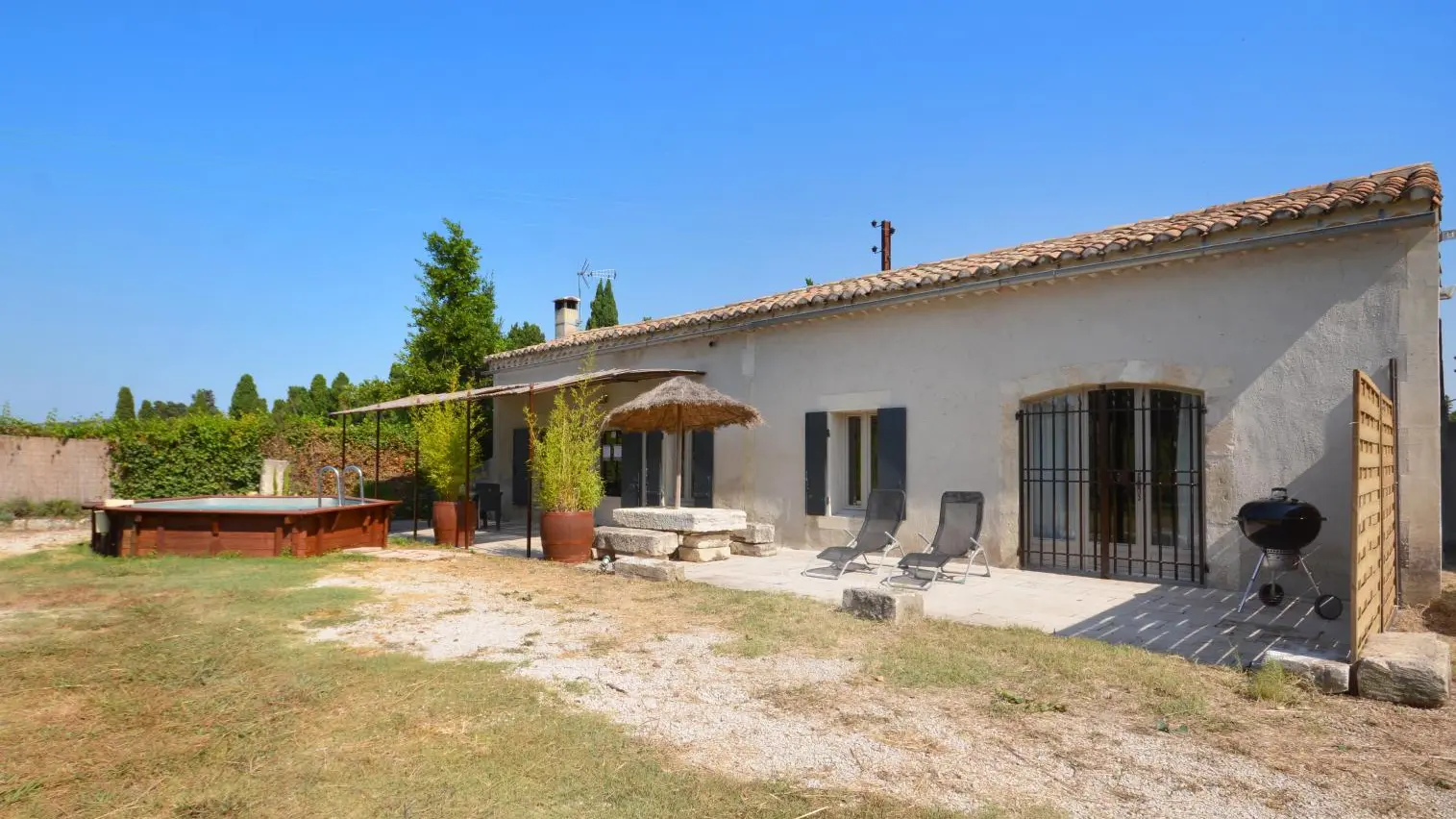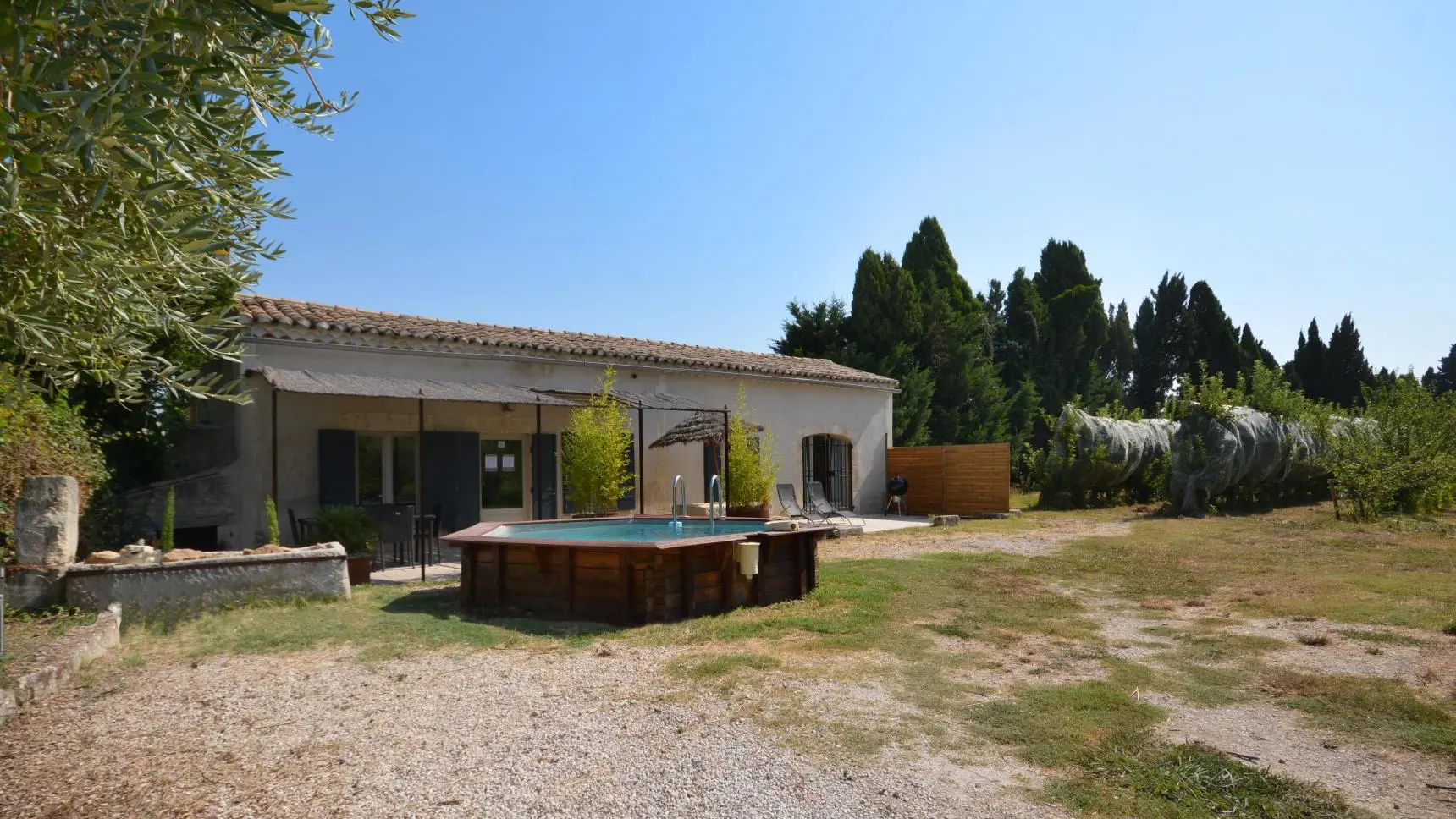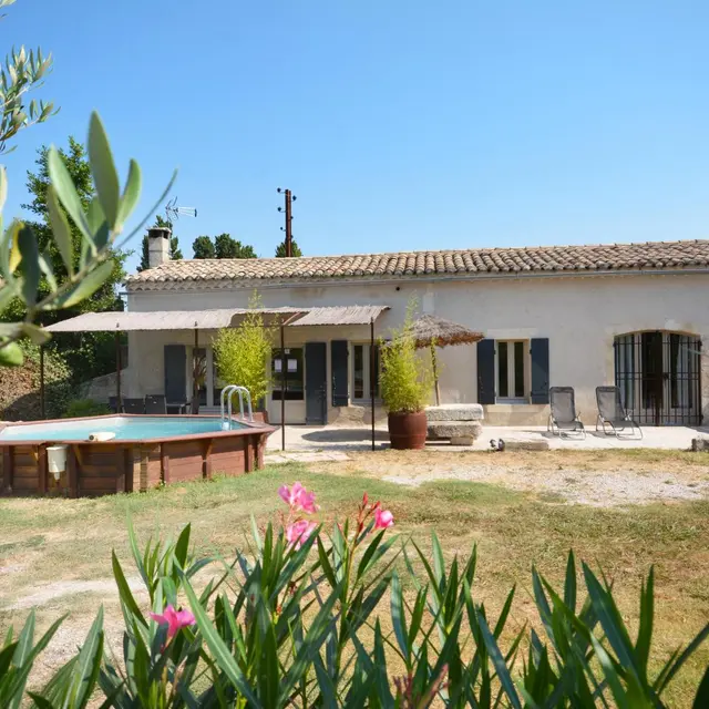 Entre St Rémy y Aviñón, pequeña granja de una sola planta, completamente independiente, en el campo, en un terreno semivallado. Frente a ciruelos de cultivo ecológico, hermosa terraza orientada al sur (65 m²) con muebles de jardín y sombrillas, frente a la piscina privada semienterrada accesible de junio a finales de septiembre, diámetro 3,5 m, profundidad 1,3 m, asegurada por alarma. En un nivel, la cabaña se abre al salón con cocina abierta con fregadero de piedra Cassis, lavadora, lavavajillas para 6 plazas, vitrocerámica de 4 fuegos, campana extractora, frigorífico/congelador, microondas y minihorno. Comedor con mesa y 6 sillas. Sala de estar con 2 sofás, incluido 1 convertible (con colchón real, posibilidad de camas adicionales), mesa de café, televisor de pantalla plana de 107 cm, chimenea ornamental, estufa de leña (leña incluida) y aire acondicionado reversible.