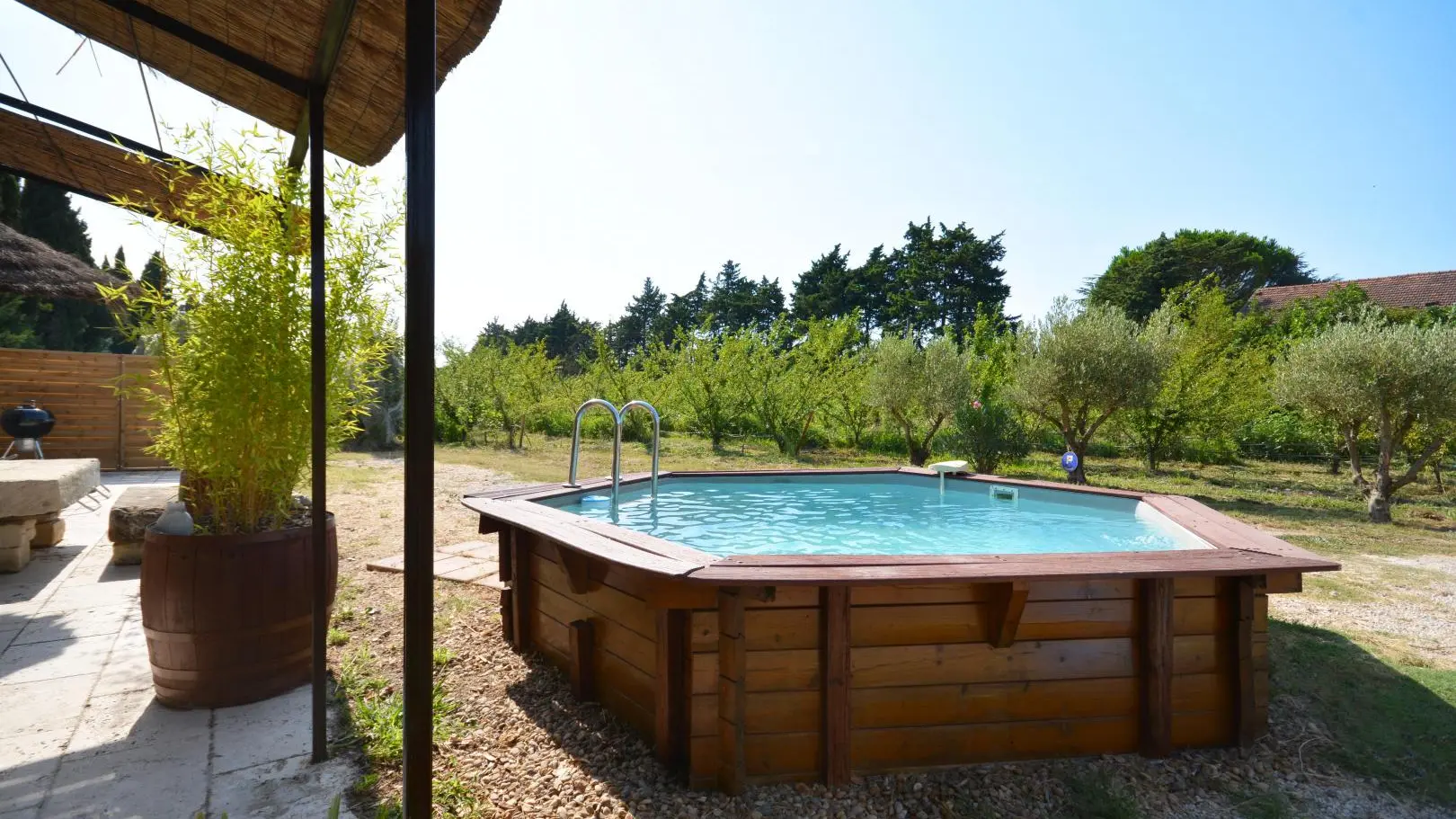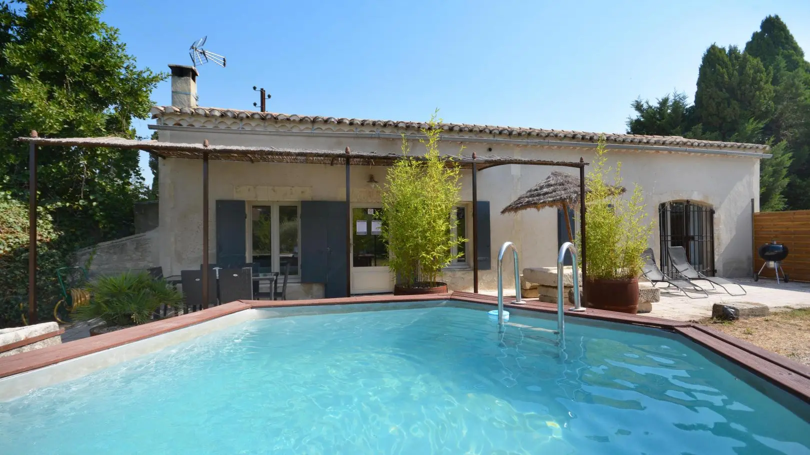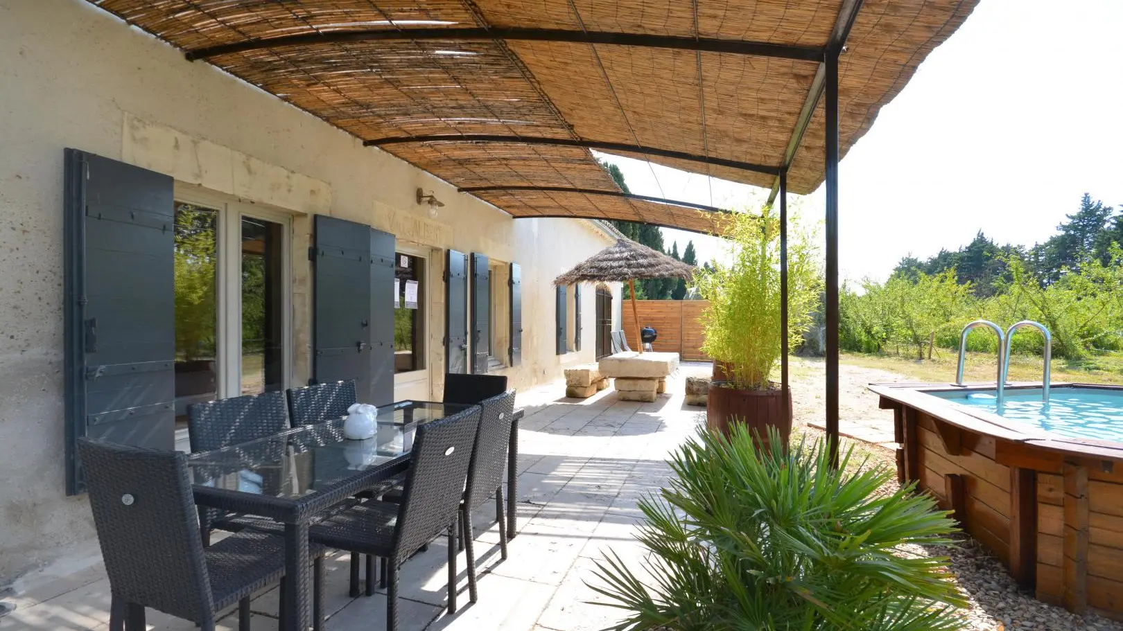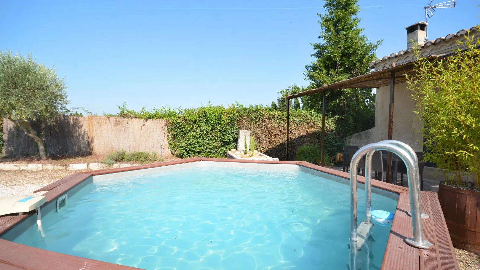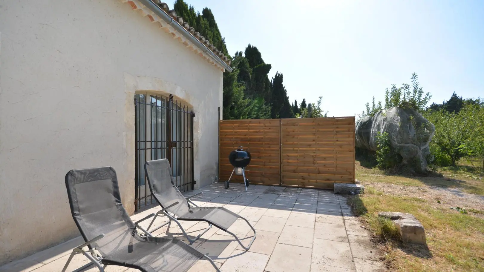 Entre St Rémy y Aviñón, pequeña granja de una sola planta, completamente independiente, en el campo, en un terreno semivallado. Frente a ciruelos de cultivo ecológico, hermosa terraza orientada al sur (65 m²) con muebles de jardín y sombrillas, frente a la piscina privada semienterrada accesible de junio a finales de septiembre, diámetro 3,5 m, profundidad 1,3 m, asegurada por alarma. En un nivel, la cabaña se abre al salón con cocina abierta con fregadero de piedra Cassis, lavadora, lavavajillas para 6 plazas, vitrocerámica de 4 fuegos, campana extractora, frigorífico/congelador, microondas y minihorno. Comedor con mesa y 6 sillas. Sala de estar con 2 sofás, incluido 1 convertible (con colchón real, posibilidad de camas adicionales), mesa de café, televisor de pantalla plana de 107 cm, chimenea ornamental, estufa de leña (leña incluida) y aire acondicionado reversible.
