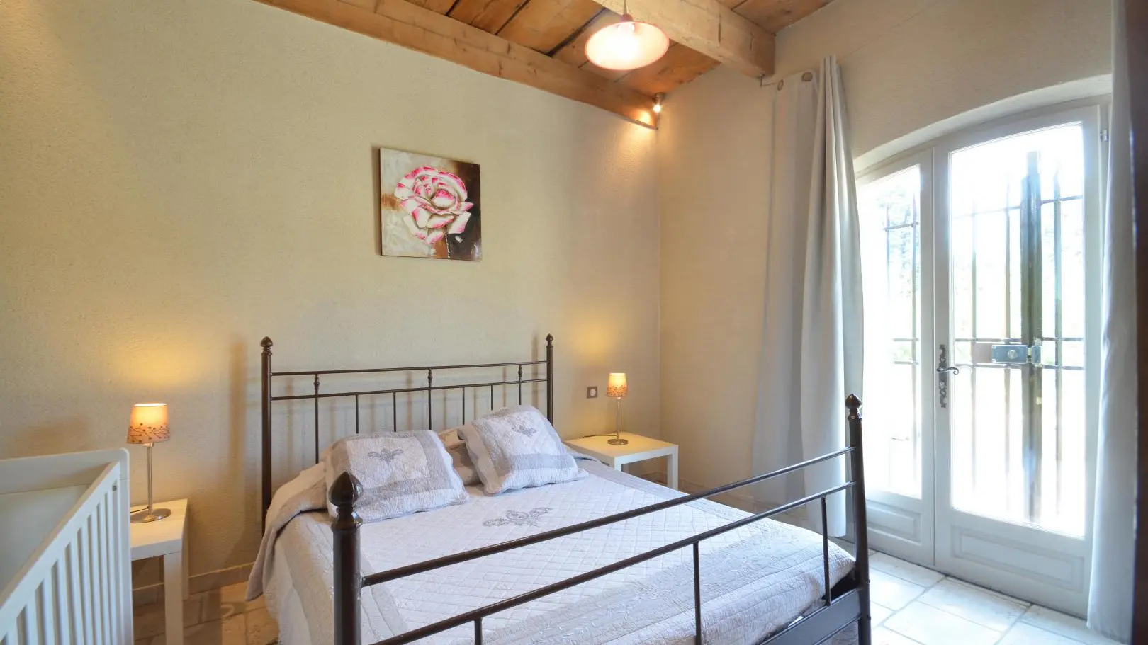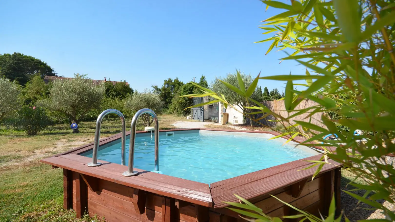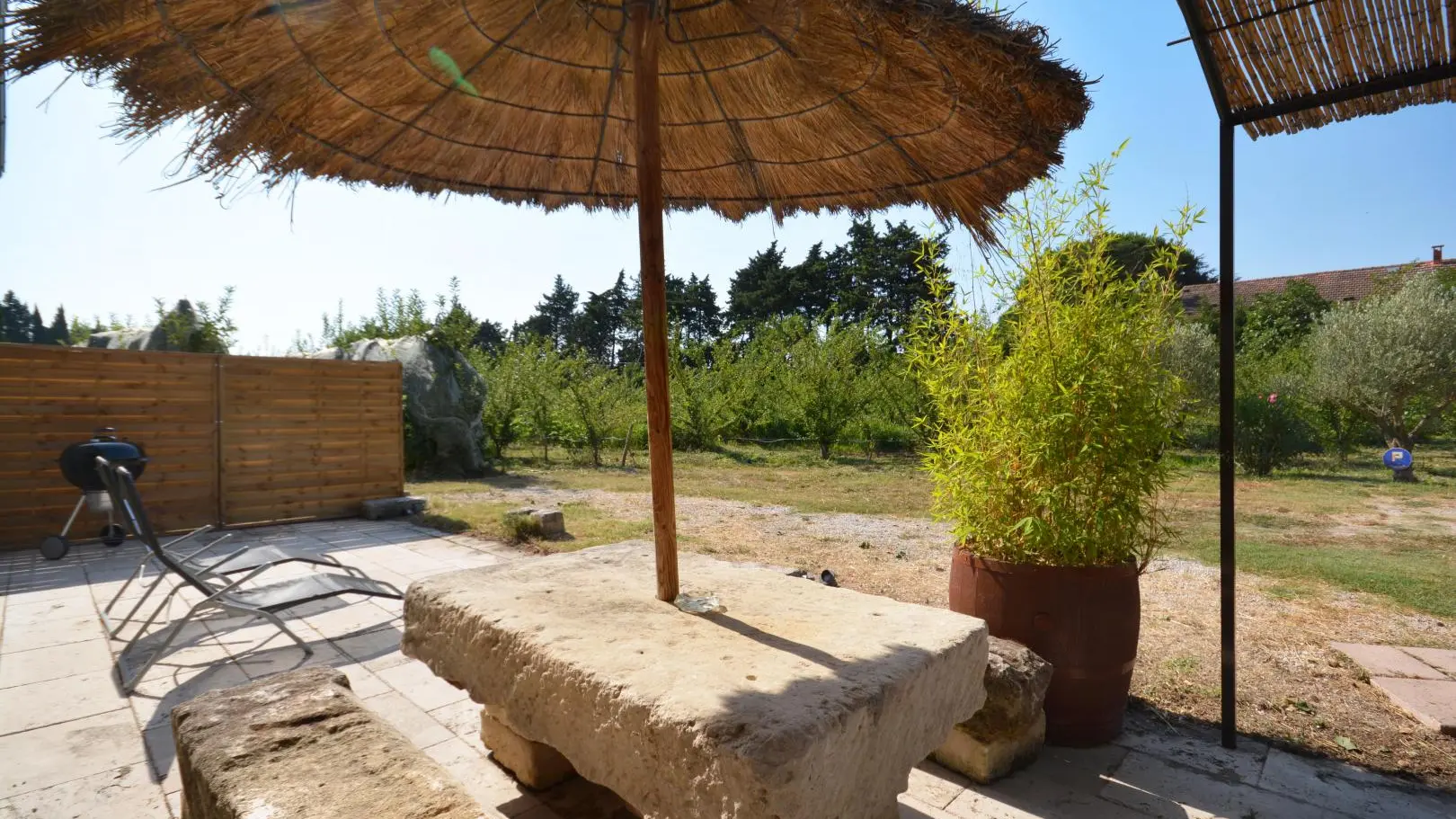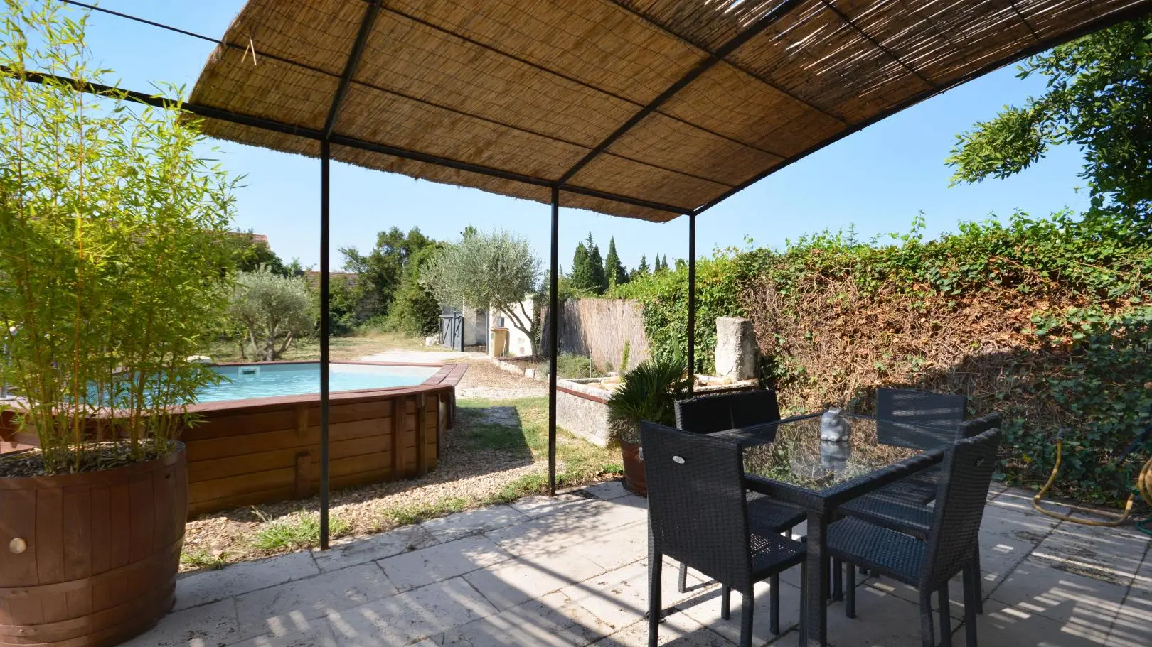 Entre St Rémy y Aviñón, pequeña granja de una sola planta, completamente independiente, en el campo, en un terreno semivallado. Frente a ciruelos de cultivo ecológico, hermosa terraza orientada al sur (65 m²) con muebles de jardín y sombrillas, frente a la piscina privada semienterrada accesible de junio a finales de septiembre, diámetro 3,5 m, profundidad 1,3 m, asegurada por alarma. En un nivel, la cabaña se abre al salón con cocina abierta con fregadero de piedra Cassis, lavadora, lavavajillas para 6 plazas, vitrocerámica de 4 fuegos, campana extractora, frigorífico/congelador, microondas y minihorno. Comedor con mesa y 6 sillas. Sala de estar con 2 sofás, incluido 1 convertible (con colchón real, posibilidad de camas adicionales), mesa de café, televisor de pantalla plana de 107 cm, chimenea ornamental, estufa de leña (leña incluida) y aire acondicionado reversible.