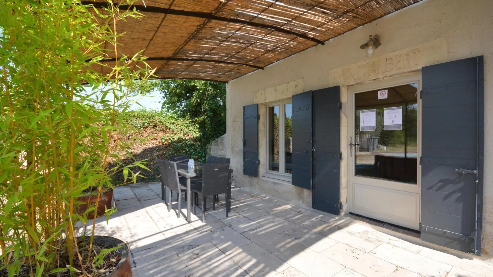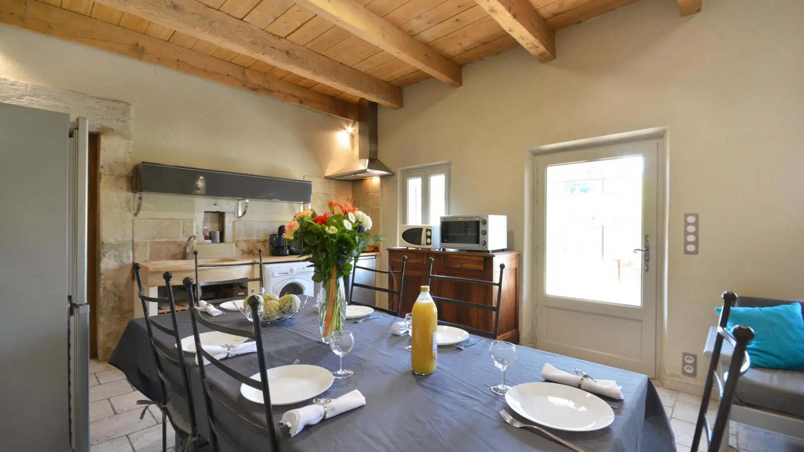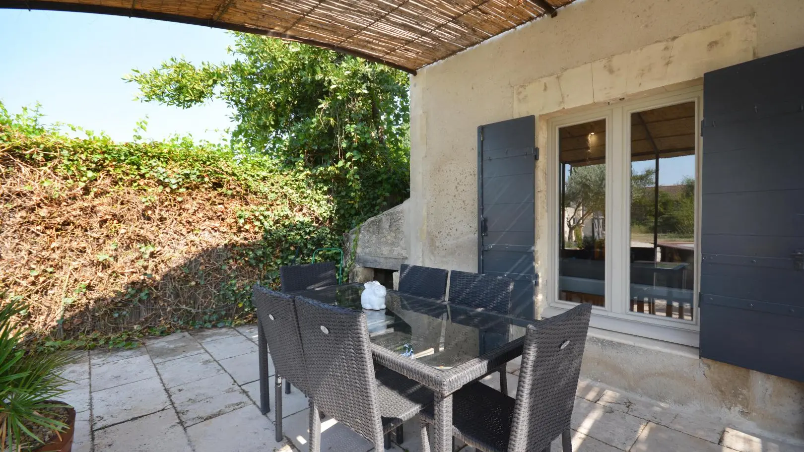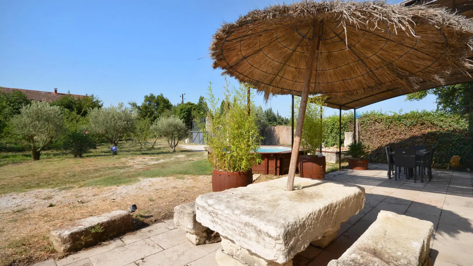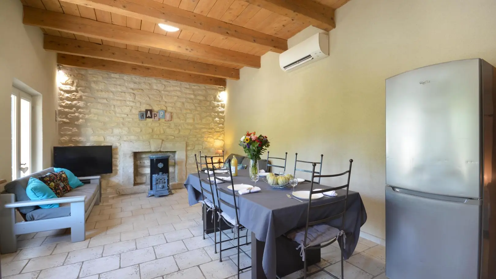 Entre St Rémy y Aviñón, pequeña granja de una sola planta, completamente independiente, en el campo, en un terreno semivallado. Frente a ciruelos de cultivo ecológico, hermosa terraza orientada al sur (65 m²) con muebles de jardín y sombrillas, frente a la piscina privada semienterrada accesible de junio a finales de septiembre, diámetro 3,5 m, profundidad 1,3 m, asegurada por alarma. En un nivel, la cabaña se abre al salón con cocina abierta con fregadero de piedra Cassis, lavadora, lavavajillas para 6 plazas, vitrocerámica de 4 fuegos, campana extractora, frigorífico/congelador, microondas y minihorno. Comedor con mesa y 6 sillas. Sala de estar con 2 sofás, incluido 1 convertible (con colchón real, posibilidad de camas adicionales), mesa de café, televisor de pantalla plana de 107 cm, chimenea ornamental, estufa de leña (leña incluida) y aire acondicionado reversible.