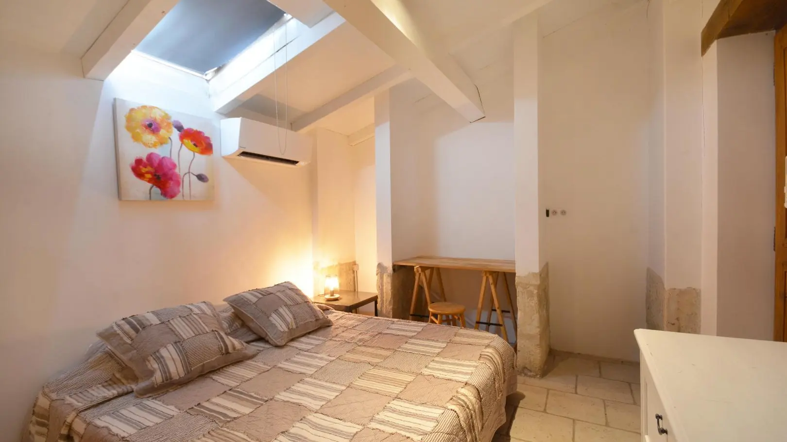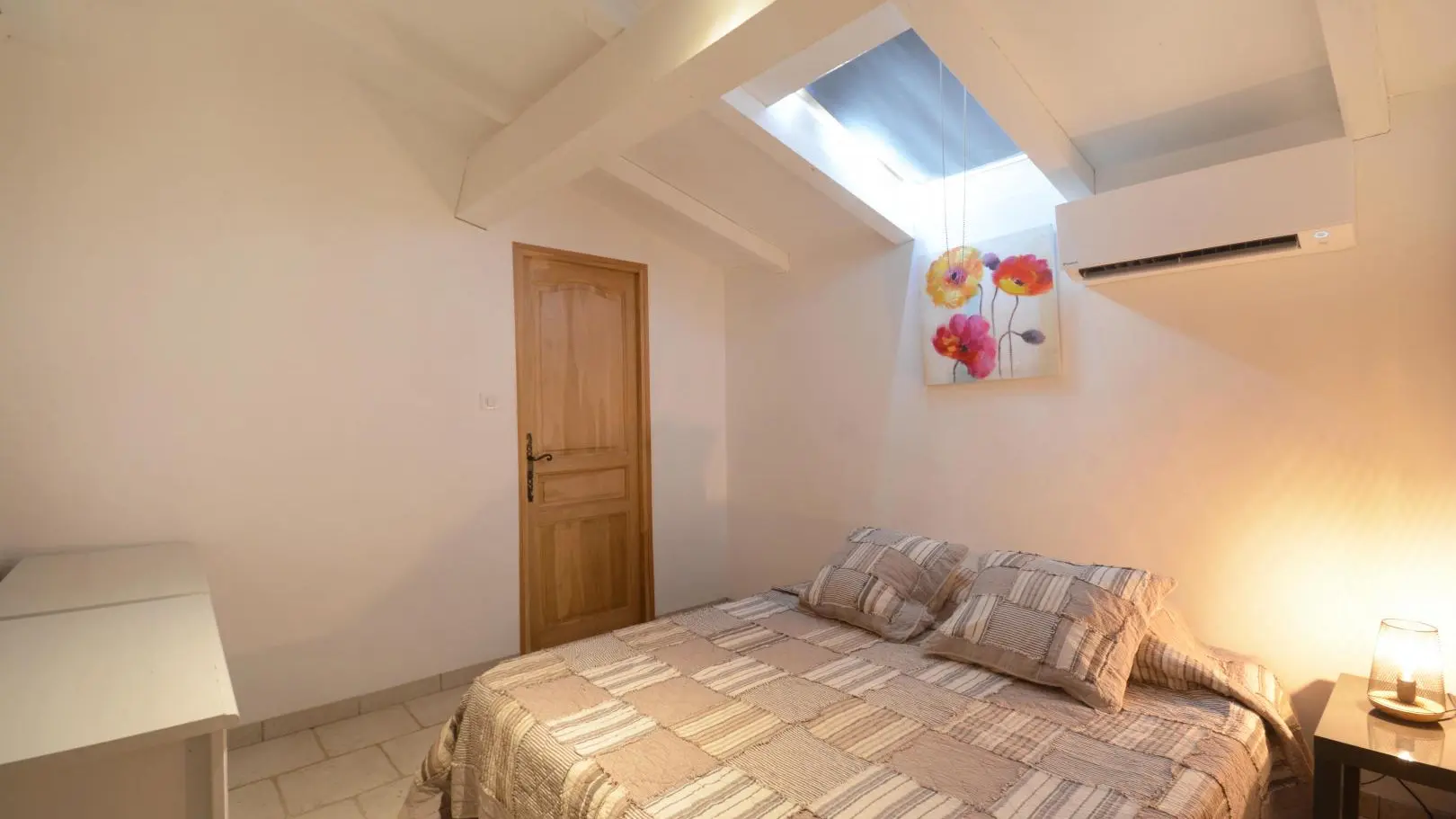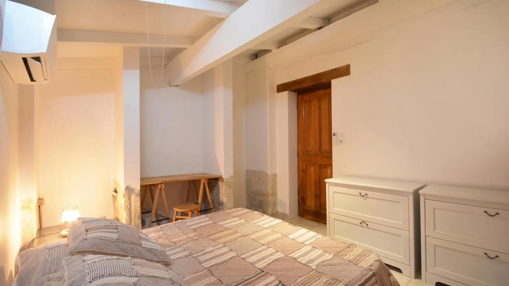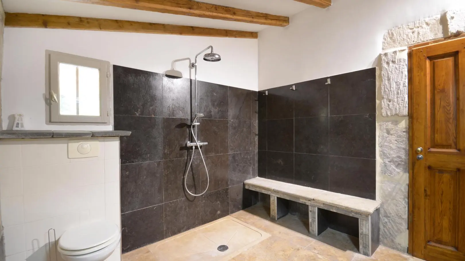 3 dormitorios cada uno con una cama doble (una de ellas de 160x200 cm y un dormitorio con aire acondicionado). Amplio cuarto de baño con ducha de obra abierta, banco de piedra, calentador de toallas y WC.