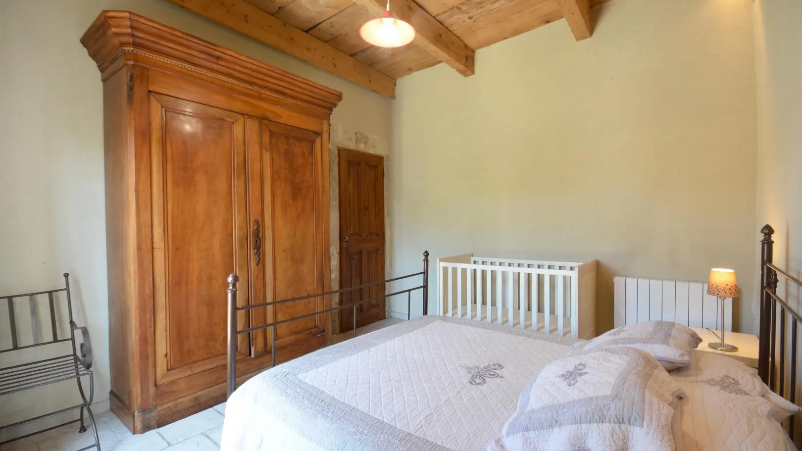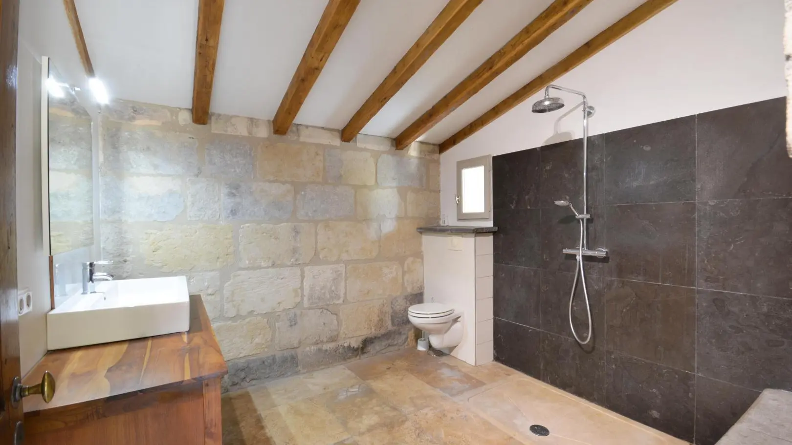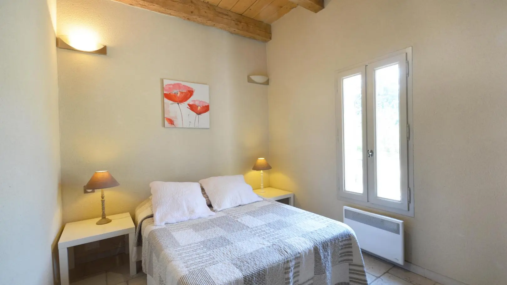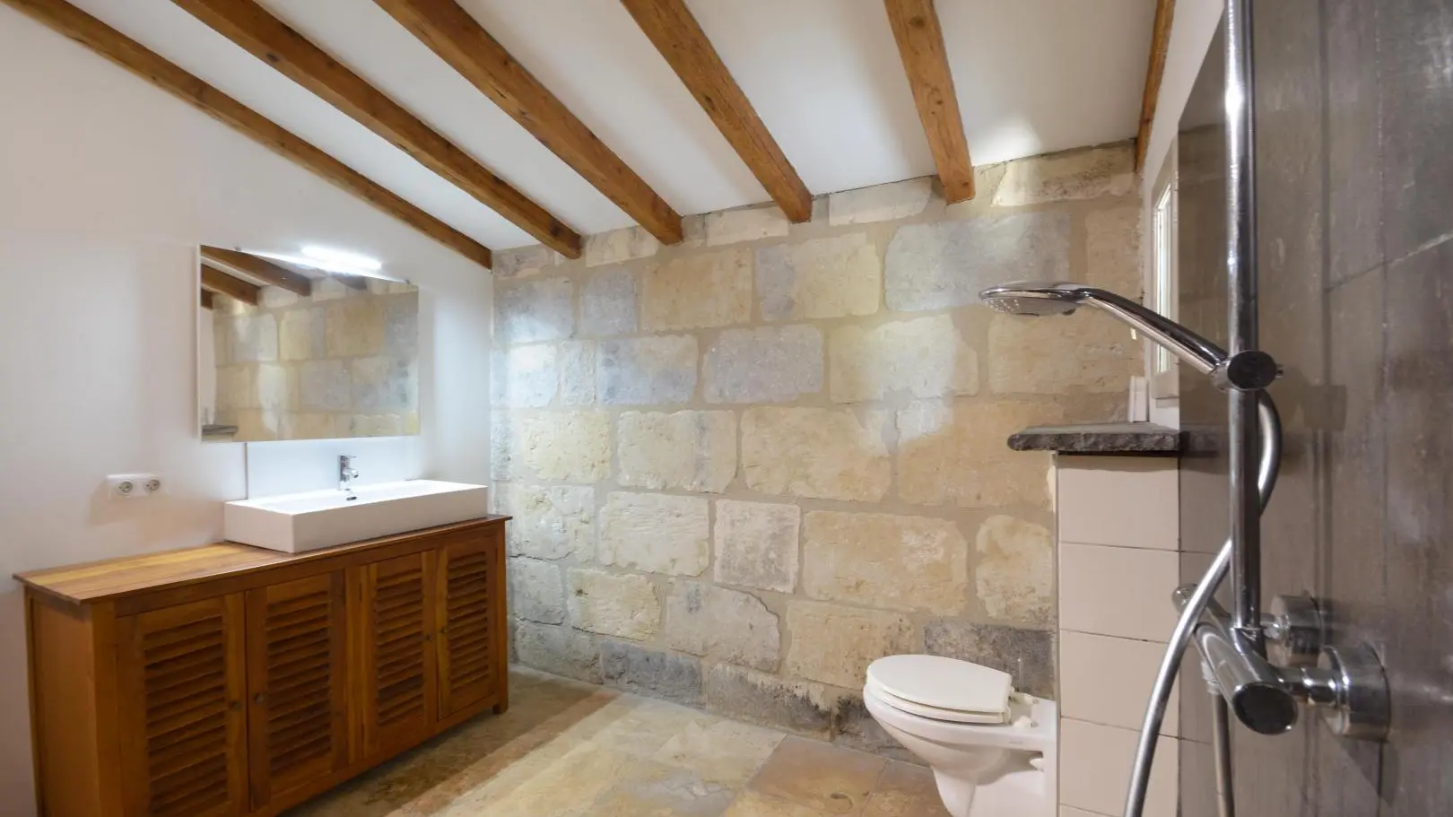 3 dormitorios cada uno con una cama doble (una de ellas de 160x200 cm y un dormitorio con aire acondicionado). Amplio cuarto de baño con ducha de obra abierta, banco de piedra, calentador de toallas y WC.