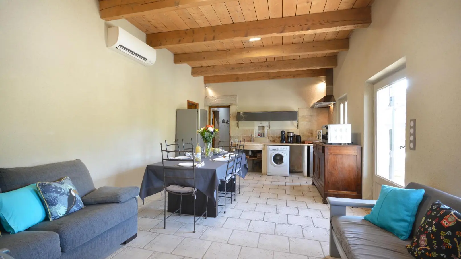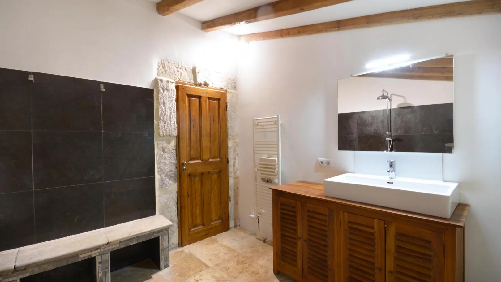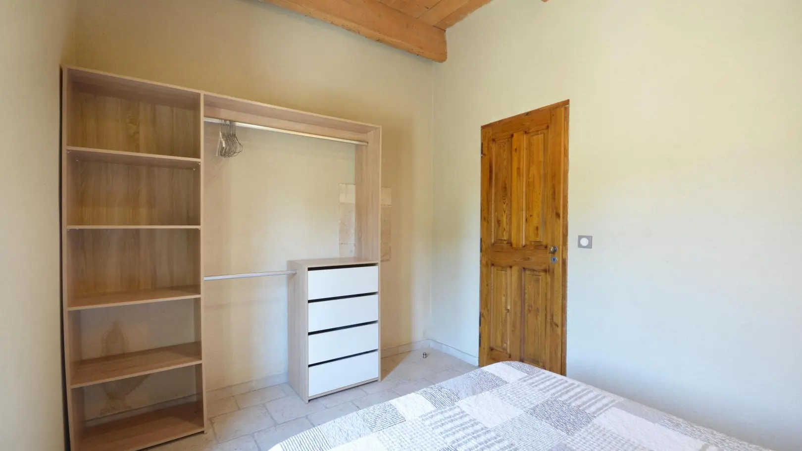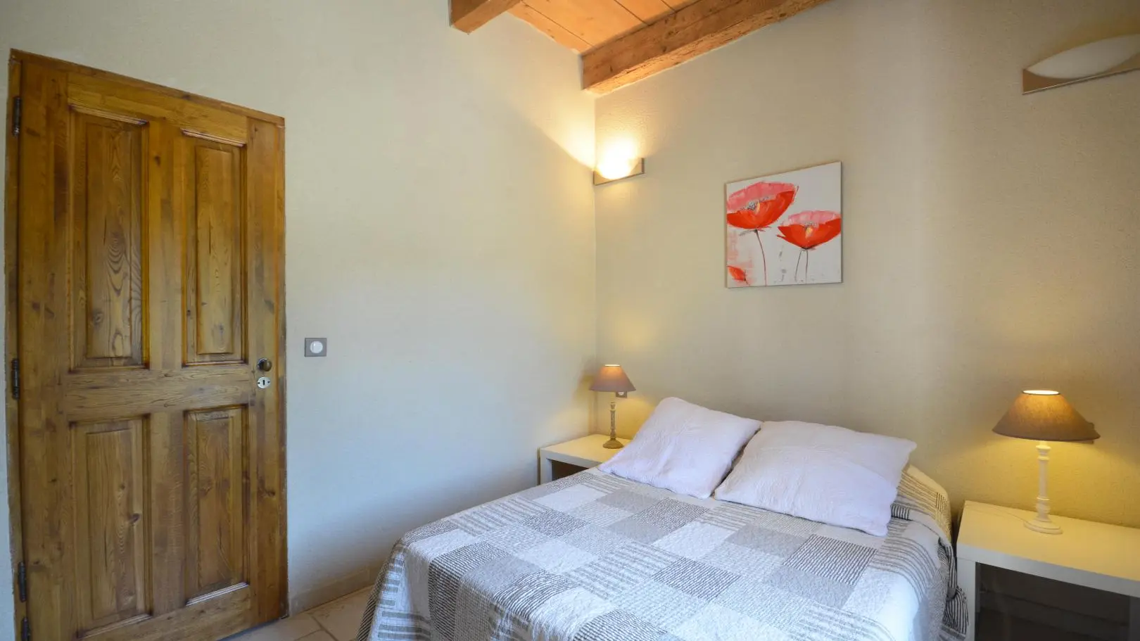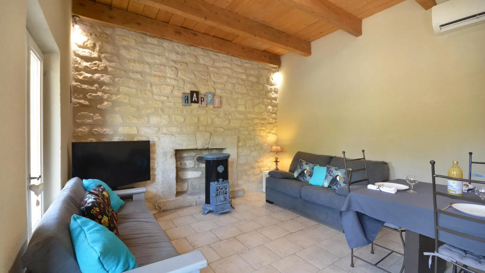 3 dormitorios cada uno con una cama doble (una de ellas de 160x200 cm y un dormitorio con aire acondicionado). Amplio cuarto de baño con ducha de obra abierta, banco de piedra, calentador de toallas y WC.
