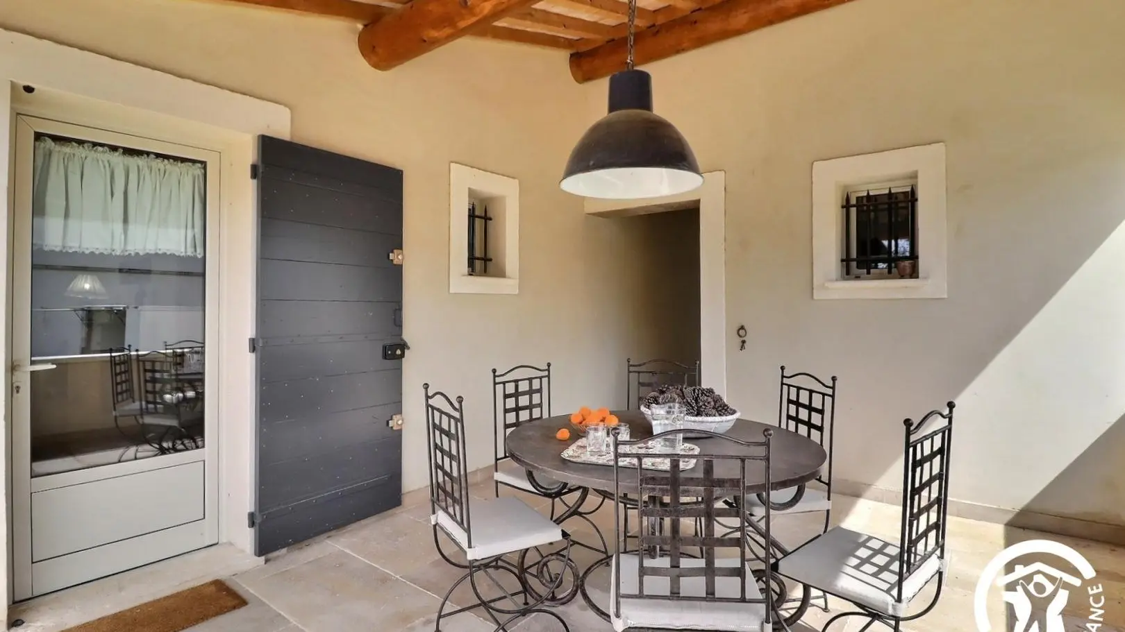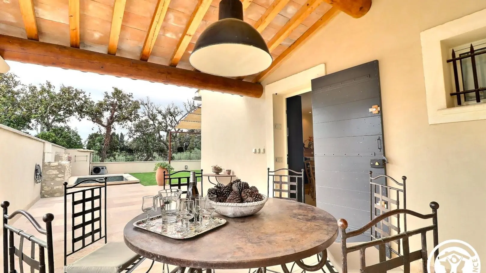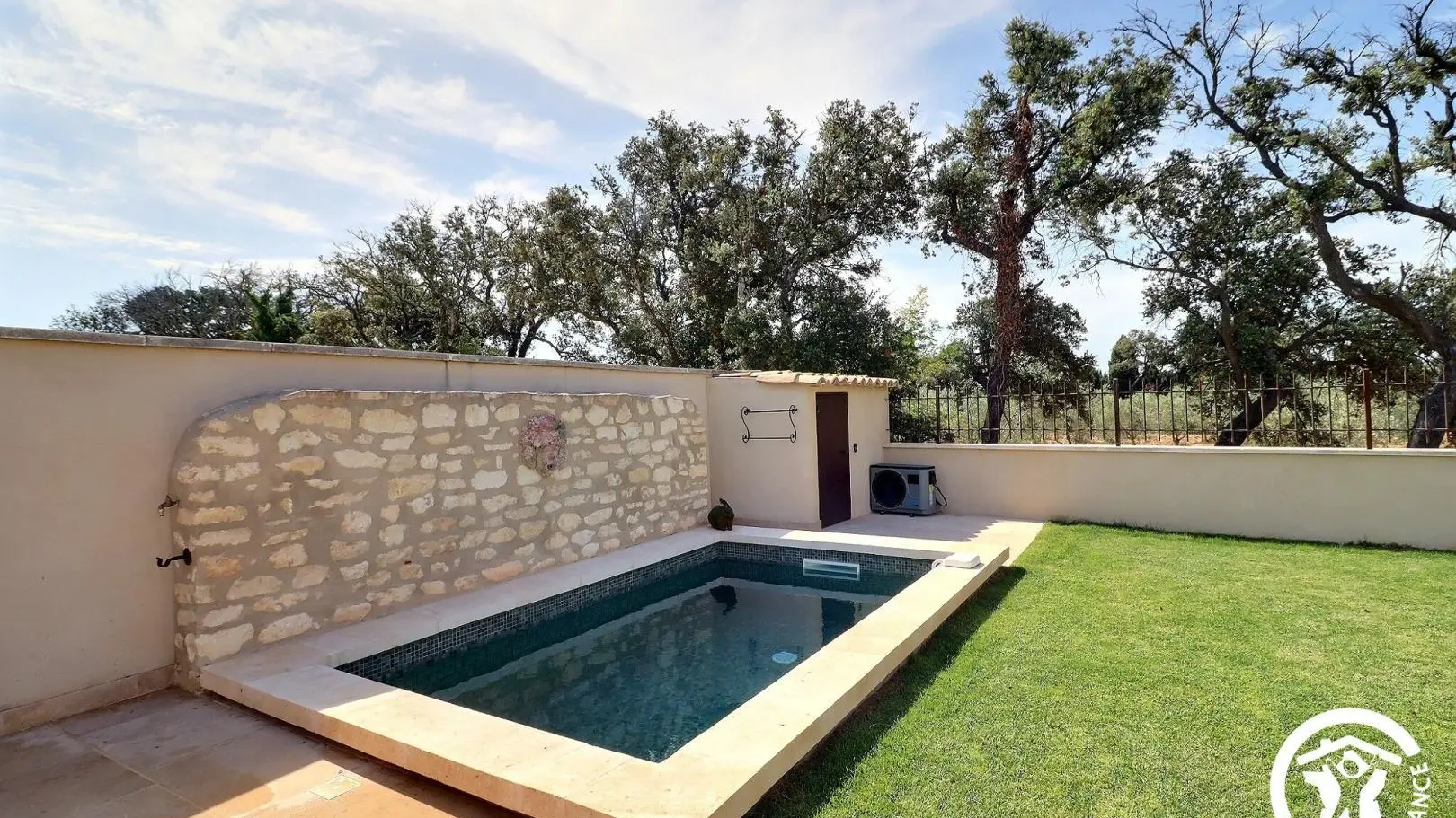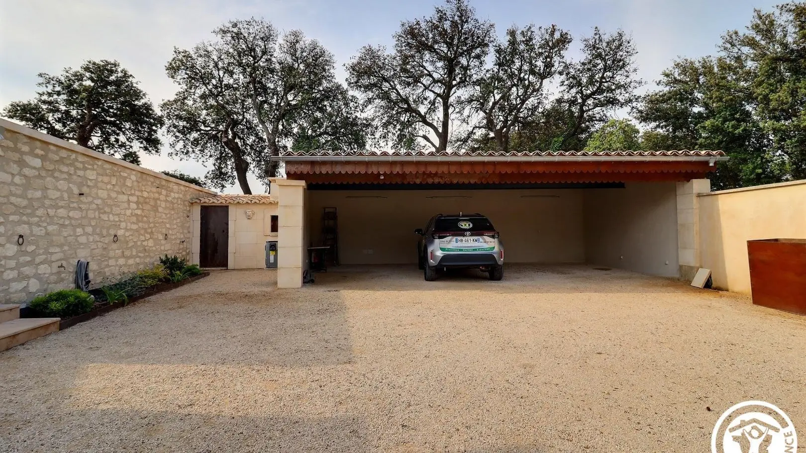 En el exterior, podrá disfrutar de aparcamiento privado cubierto, una terraza cubierta, una pequeña piscina privada climatizada (2,2m x 4m, profundidad 1,5m, climatizada de abril a octubre) para relajarse con total privacidad, y un entorno rural preservado, entre campos y olivos.