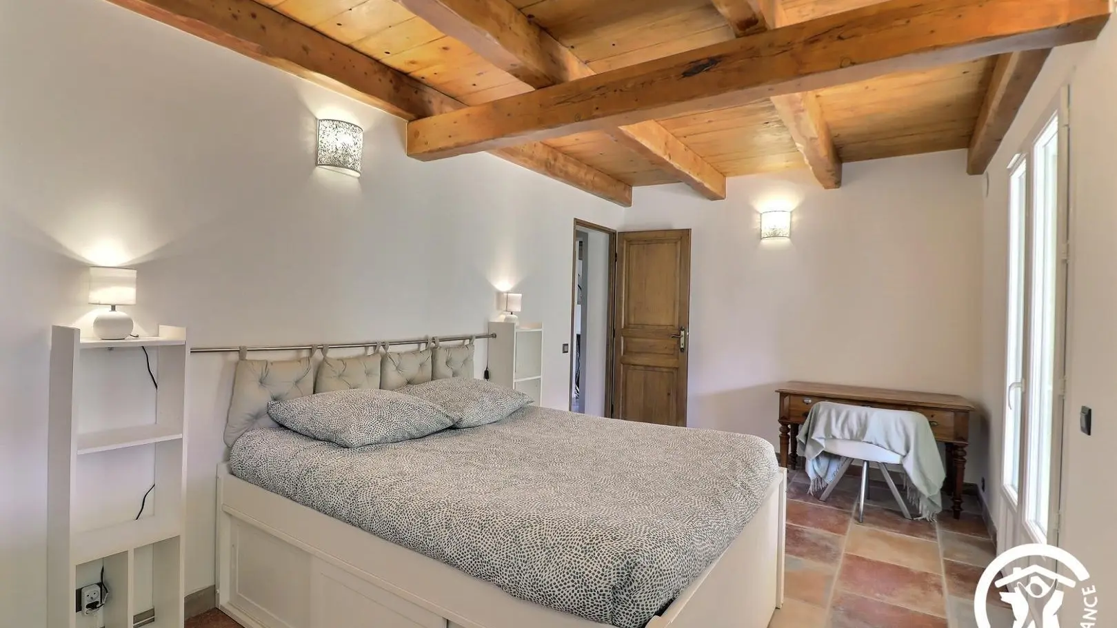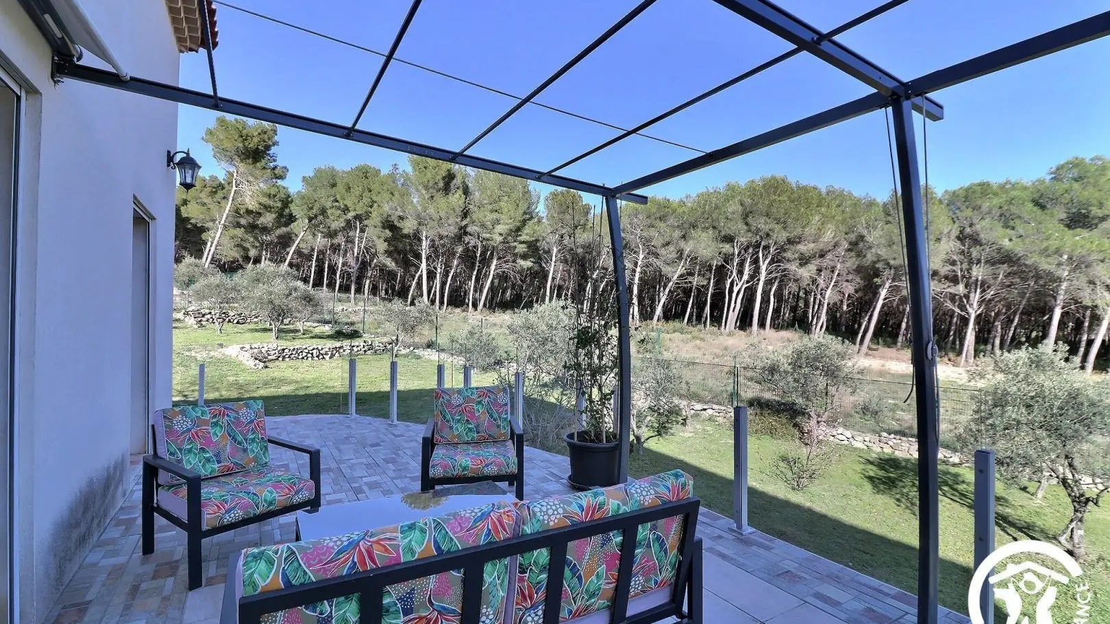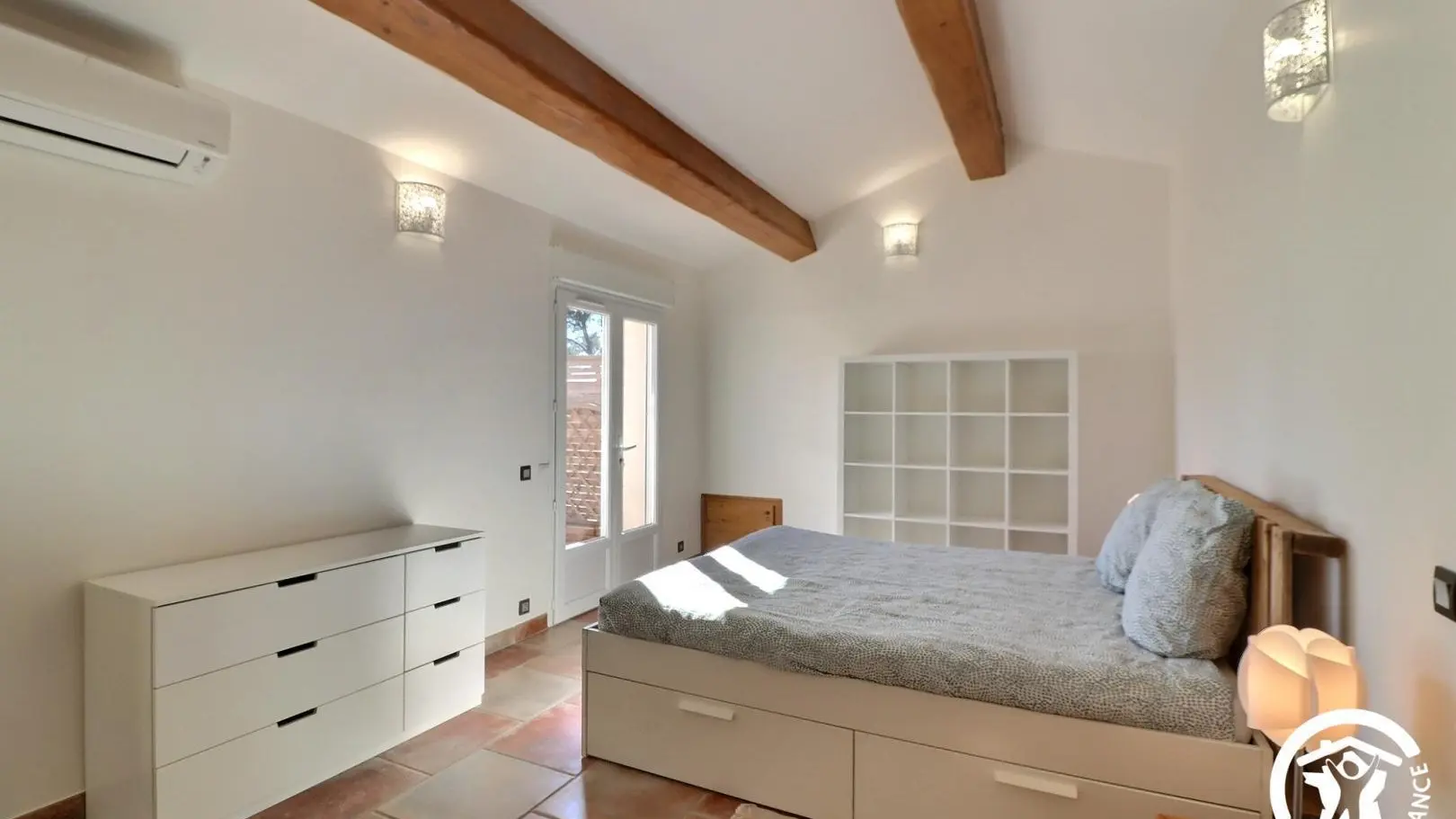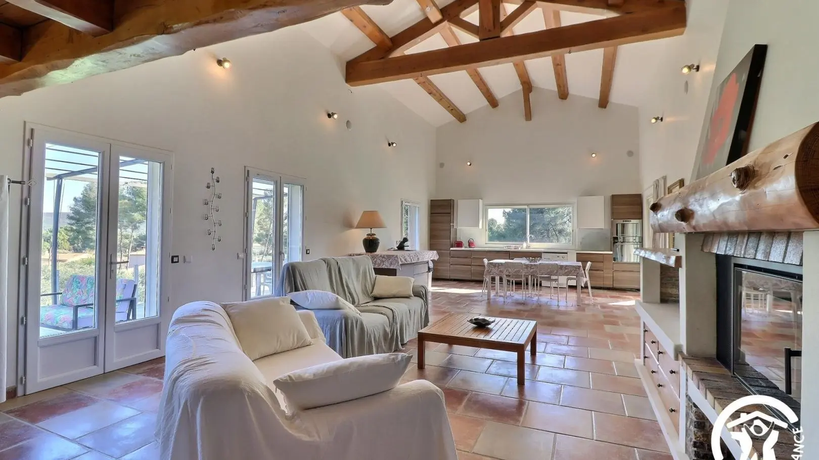 Una gran terraza sin vecinos bordea la casa rural y da a su gran jardín en terrazas de 1200 m² decorado con pinos y olivos. Esta casa de 140m² con techos altos consta de: