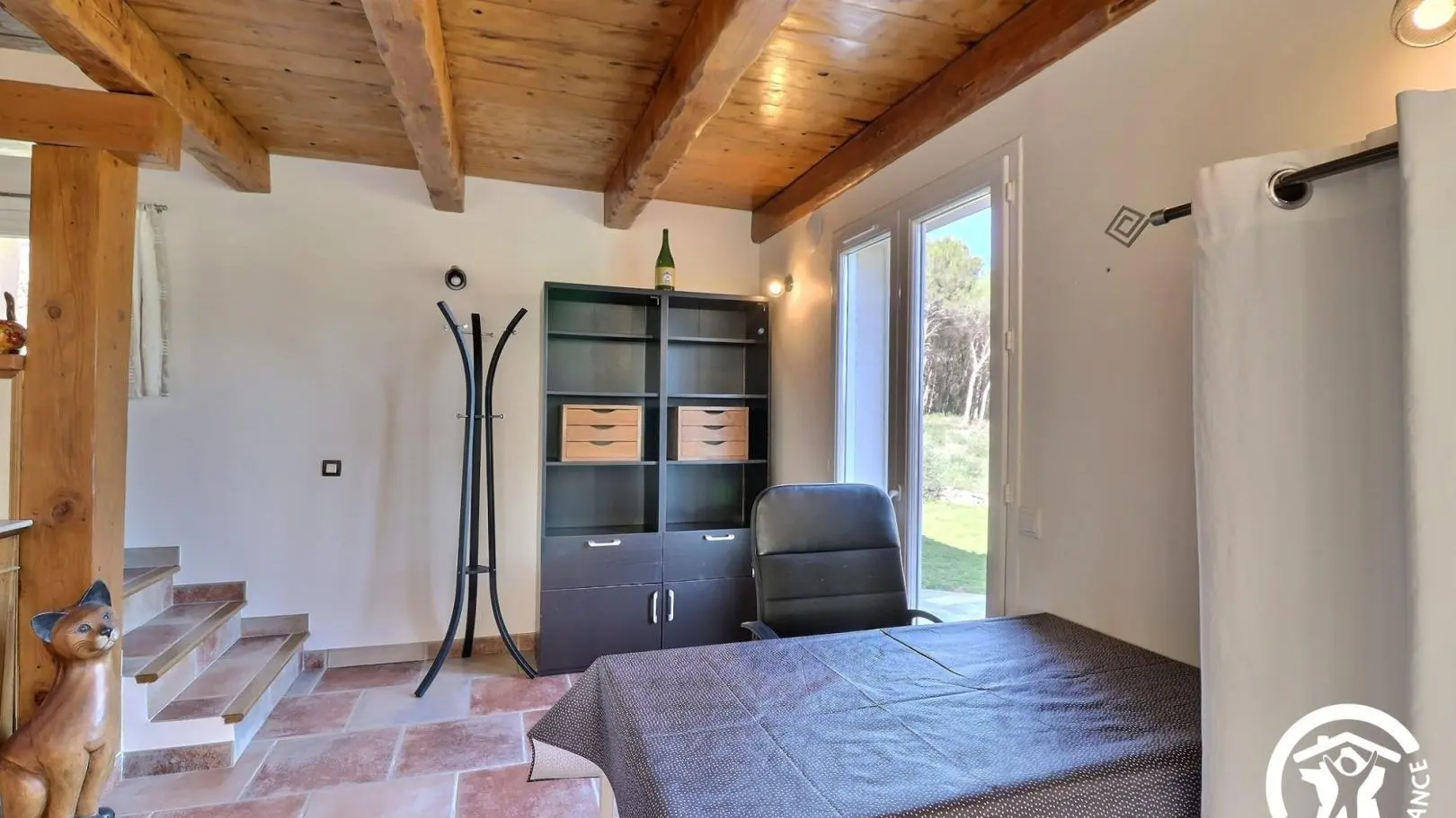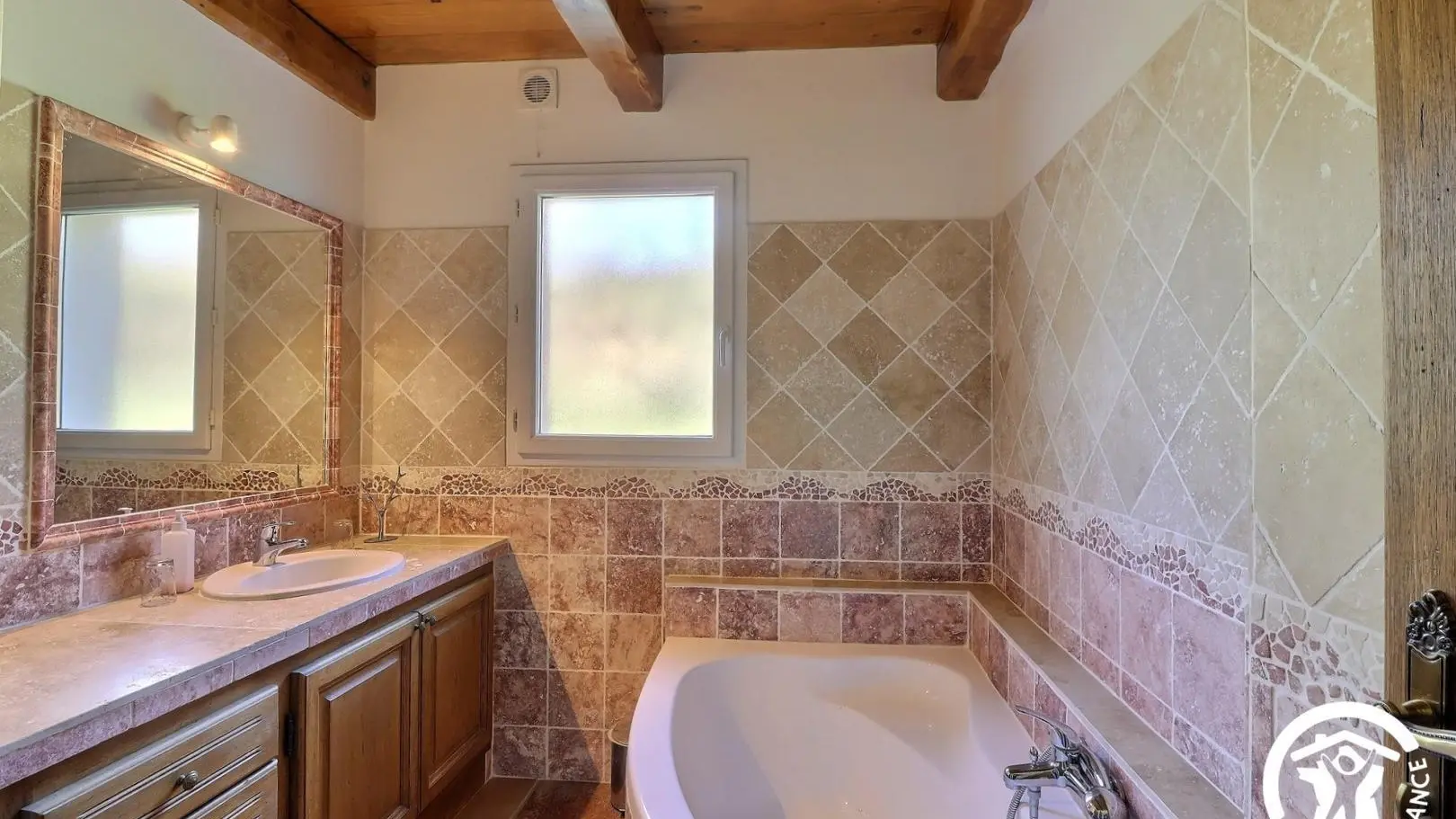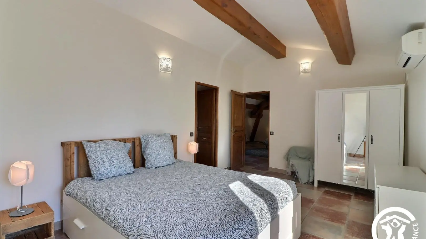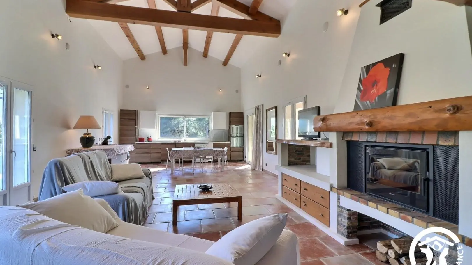 Una gran terraza sin vecinos bordea la casa rural y da a su gran jardín en terrazas de 1200 m² decorado con pinos y olivos. Esta casa de 140m² con techos altos consta de: