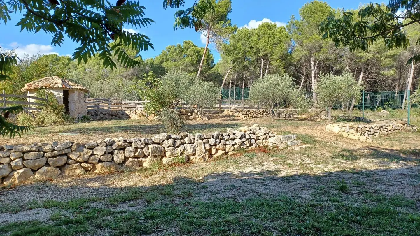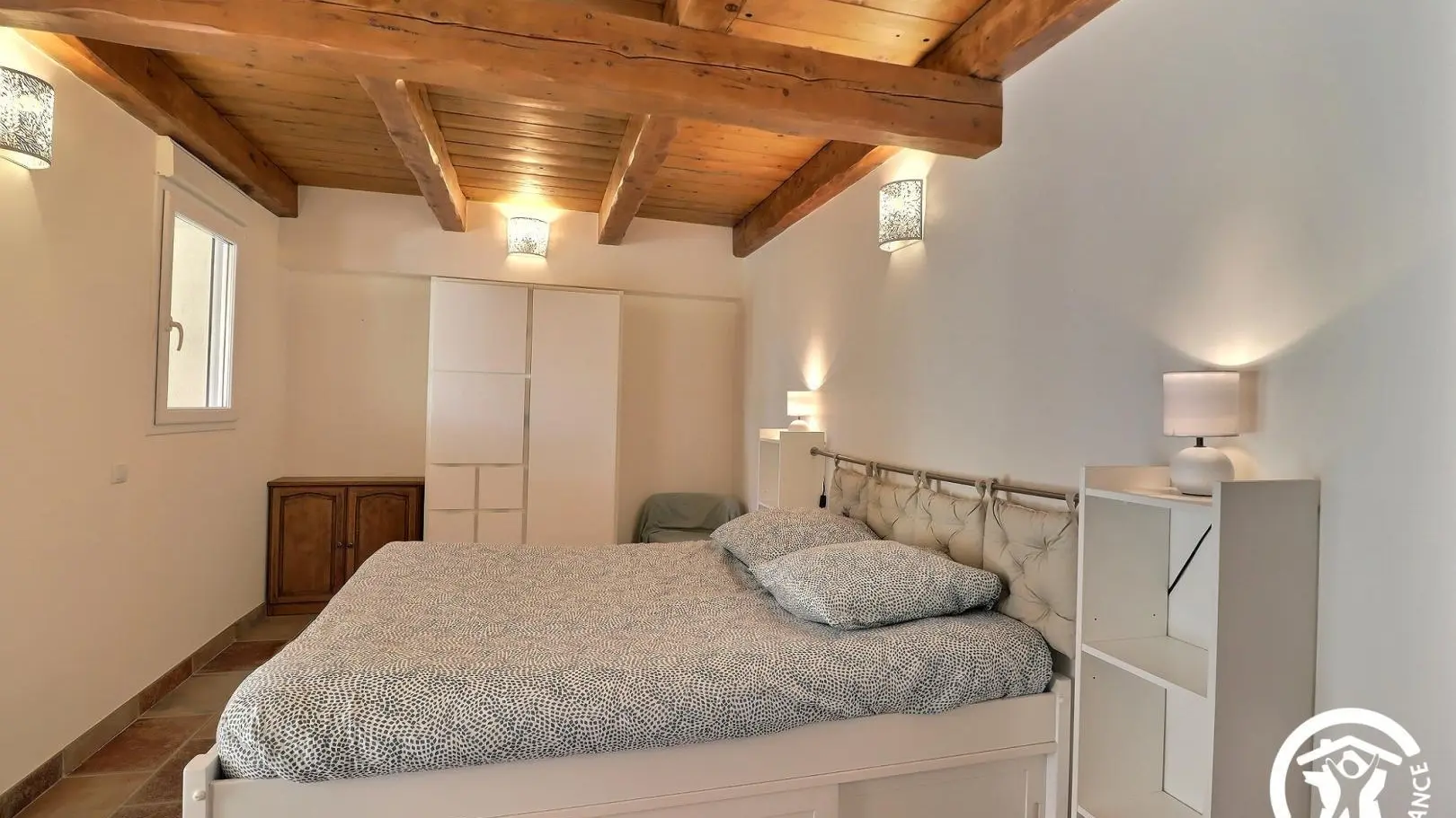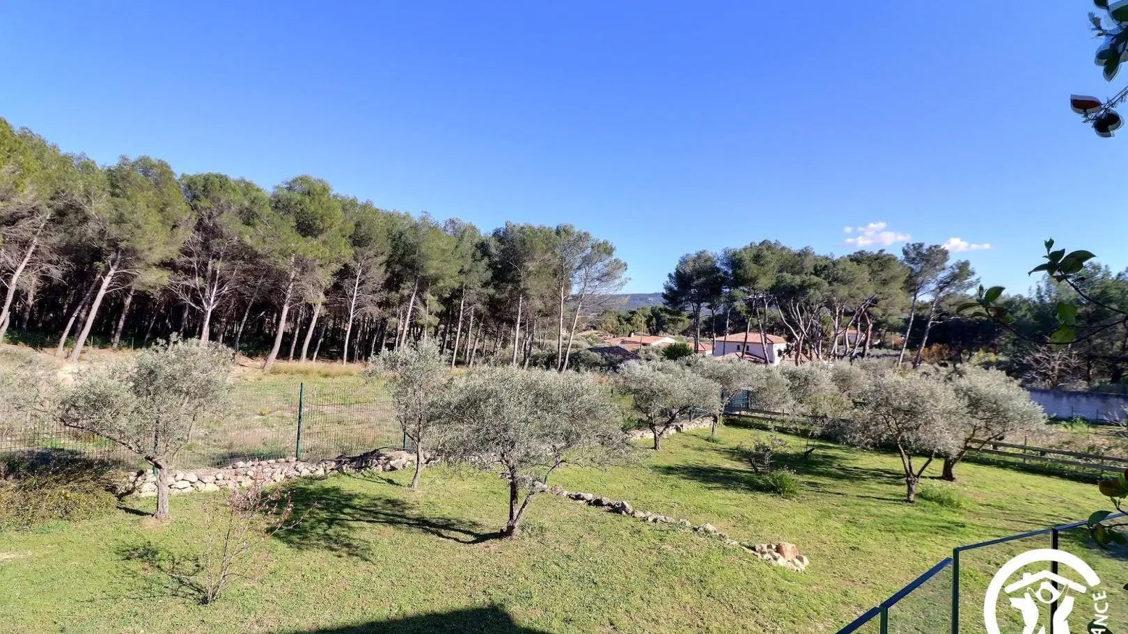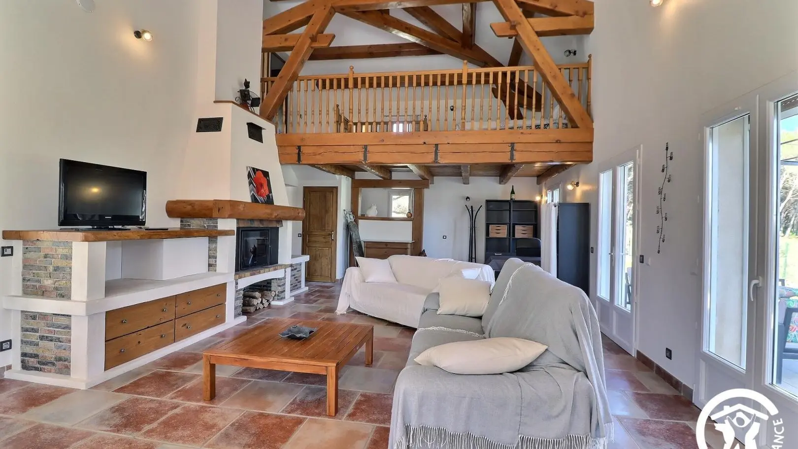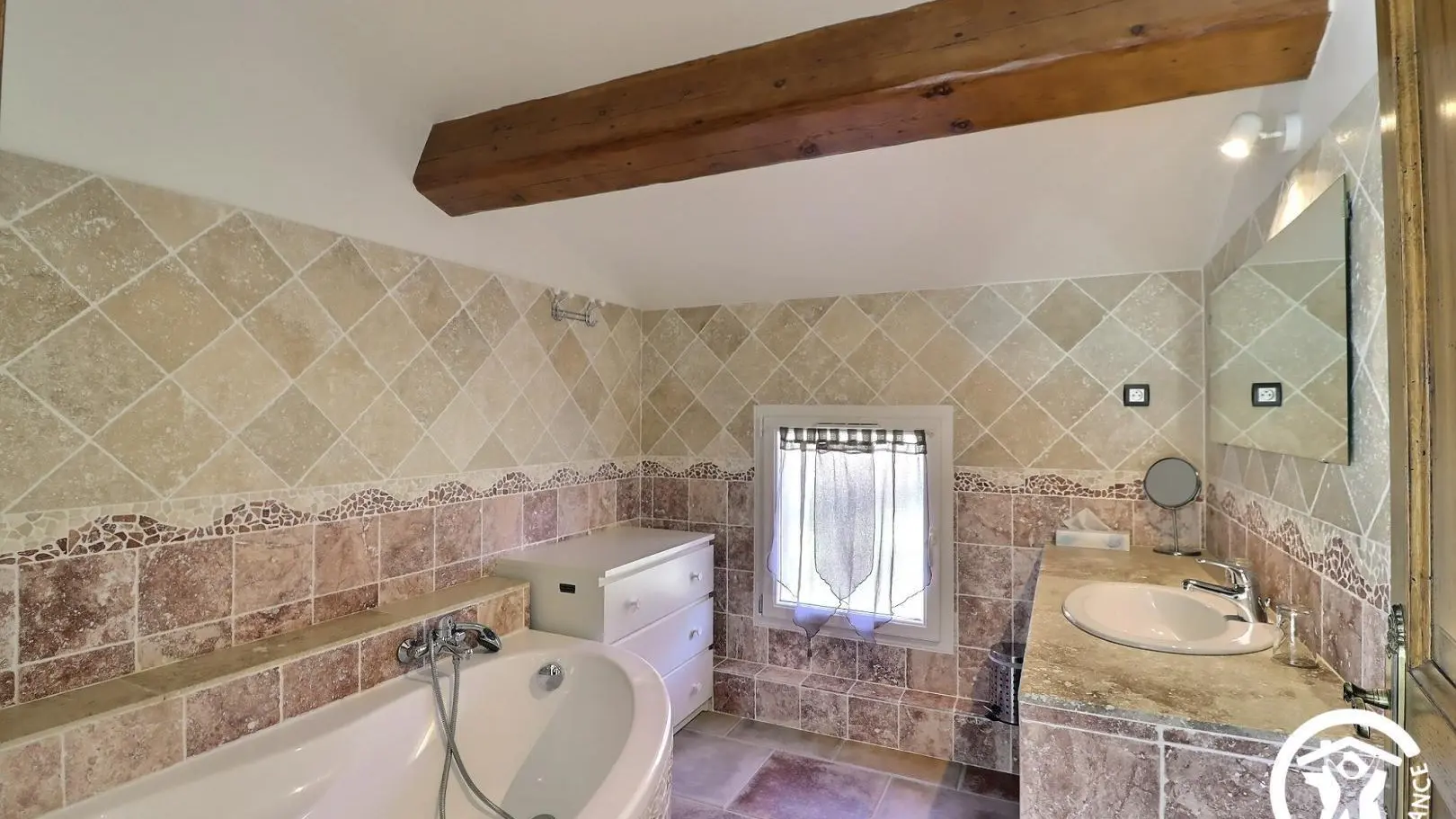 Una gran terraza sin vecinos bordea la casa rural y da a su gran jardín en terrazas de 1200 m² decorado con pinos y olivos. Esta casa de 140m² con techos altos consta de: