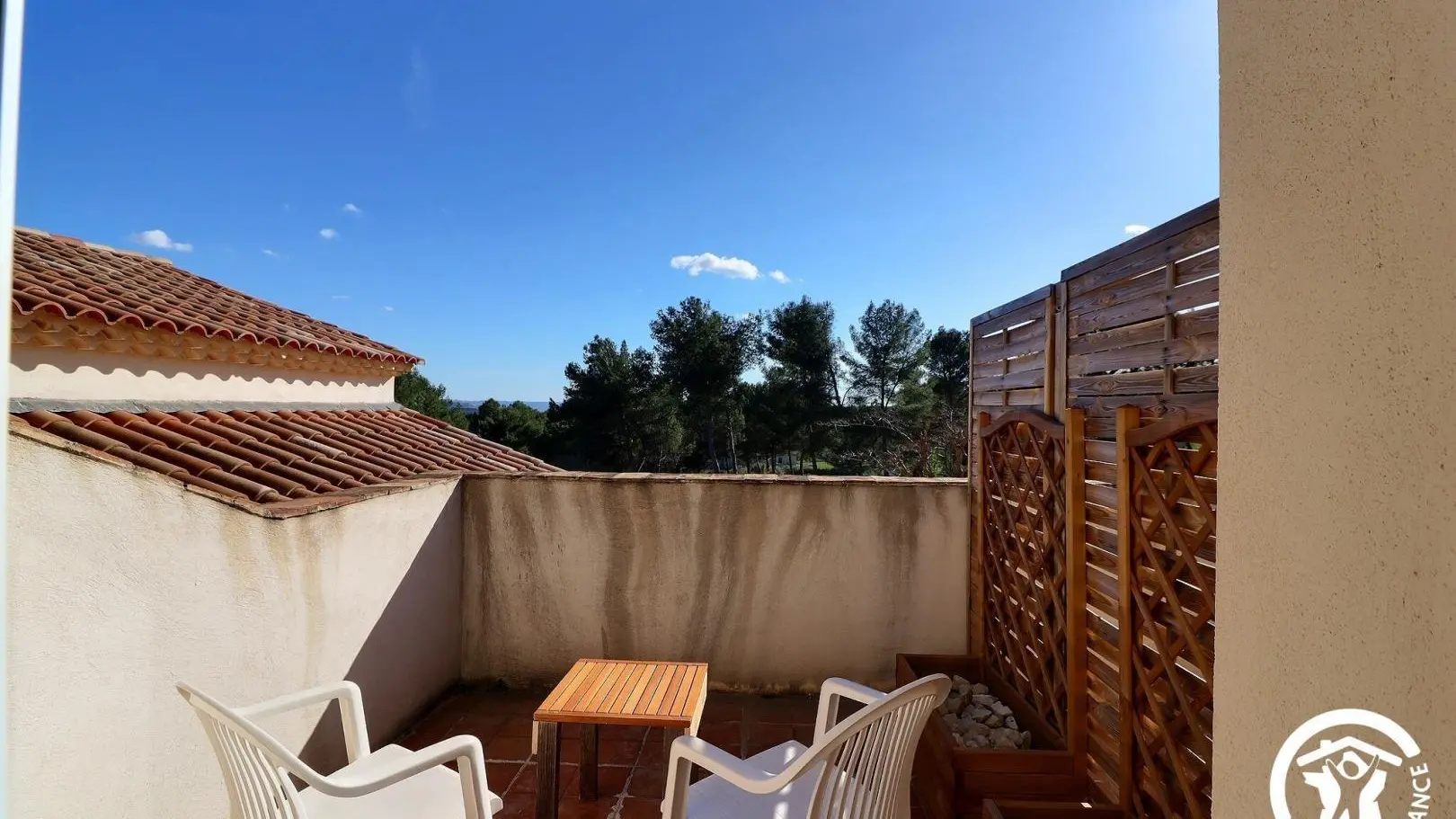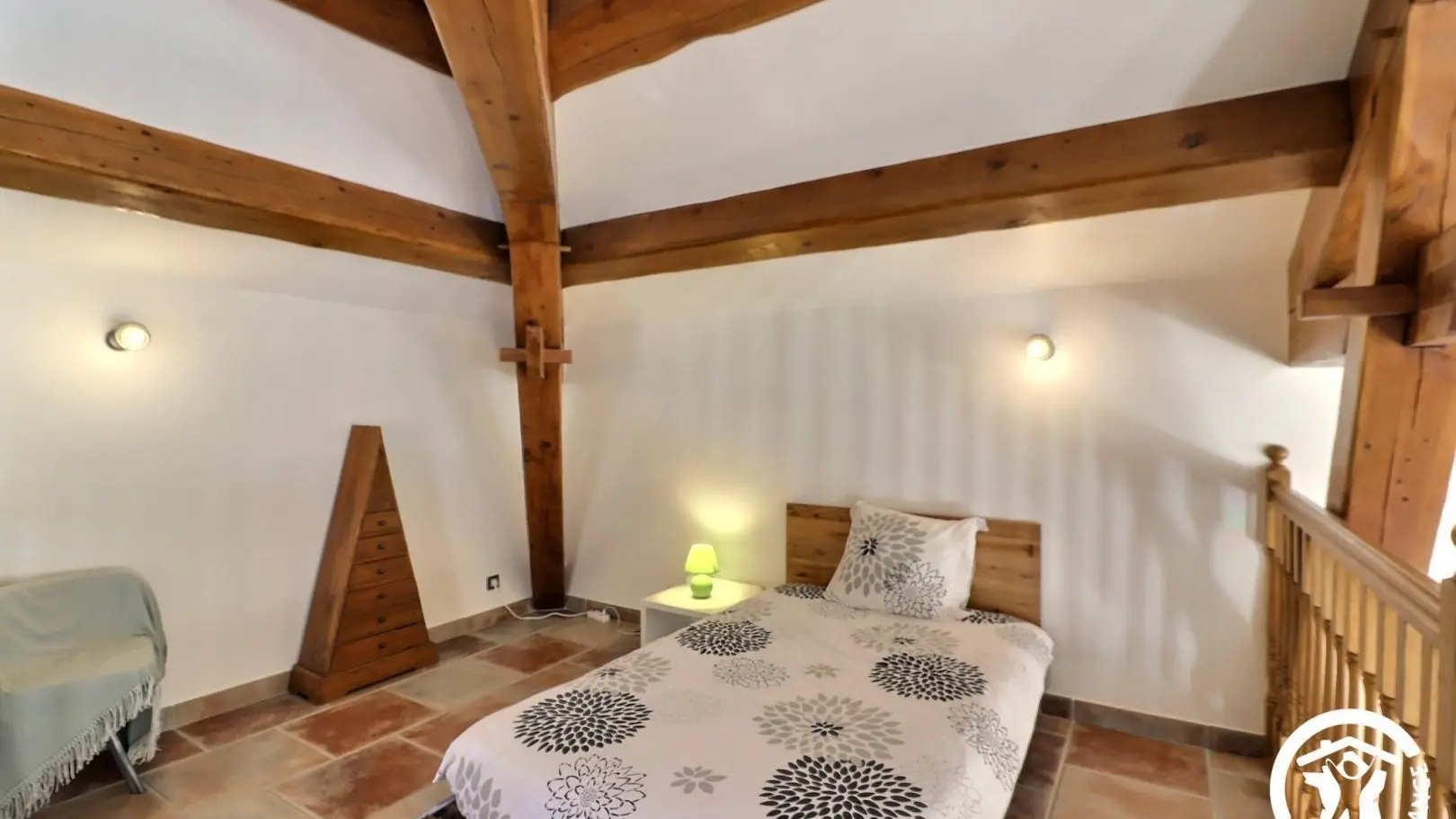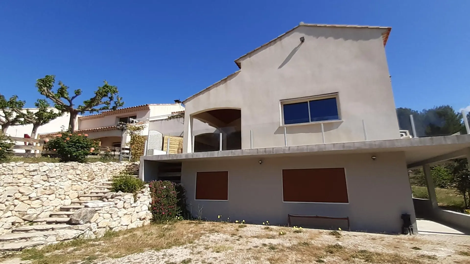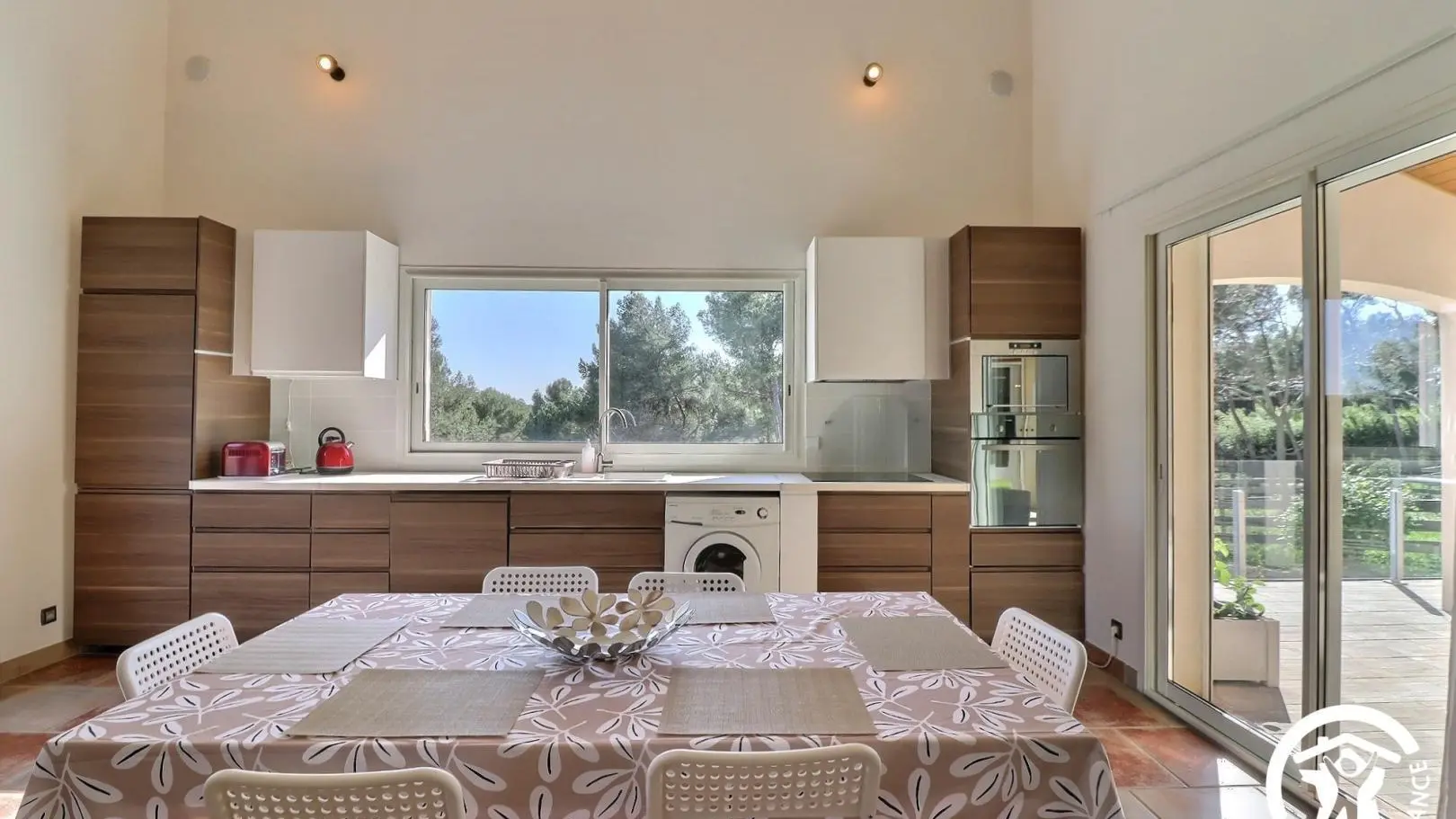Una gran terraza sin vecinos bordea la casa rural y da a su gran jardín en terrazas de 1200 m² decorado con pinos y olivos. Esta casa de 140m² con techos altos consta de: