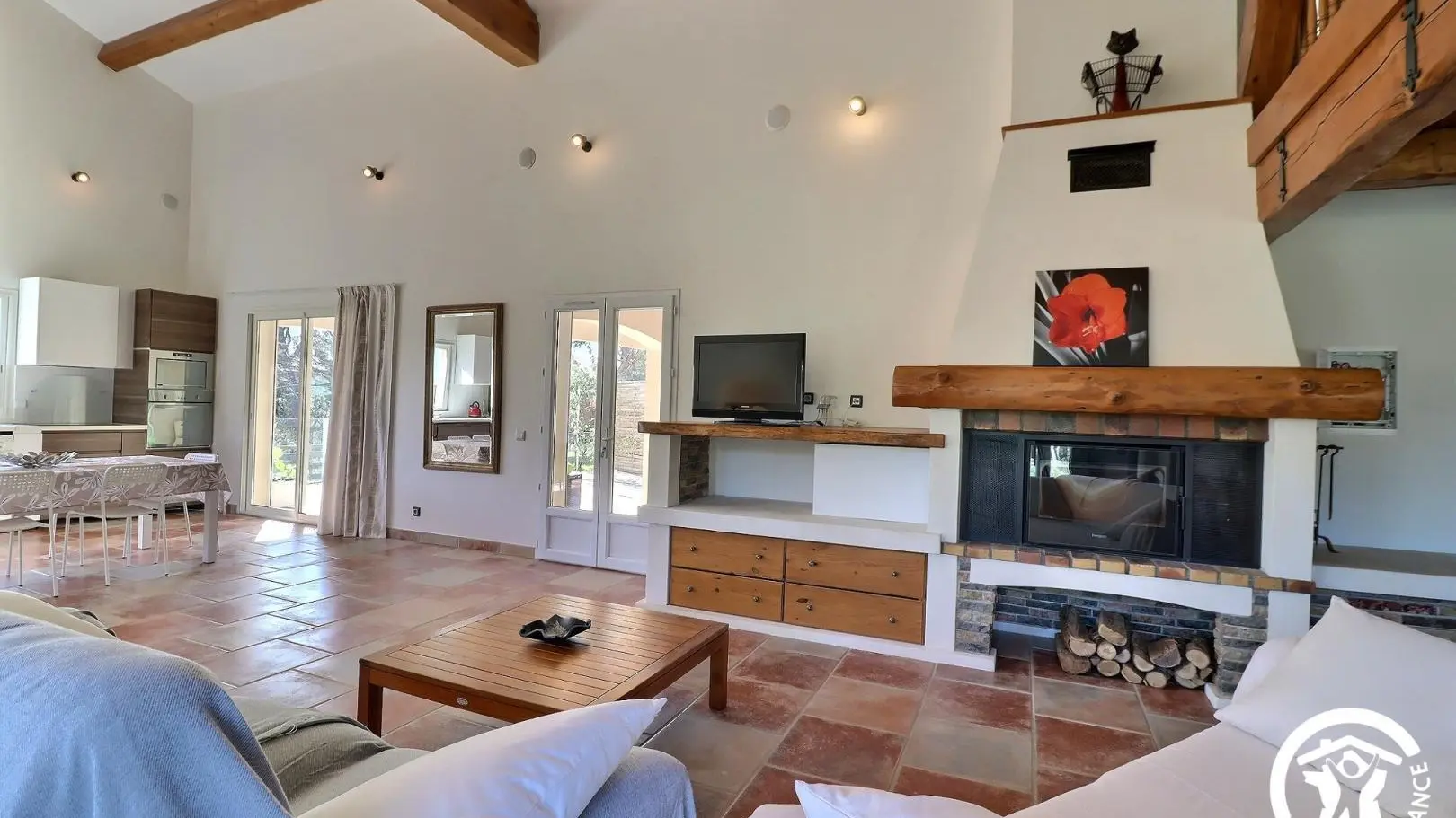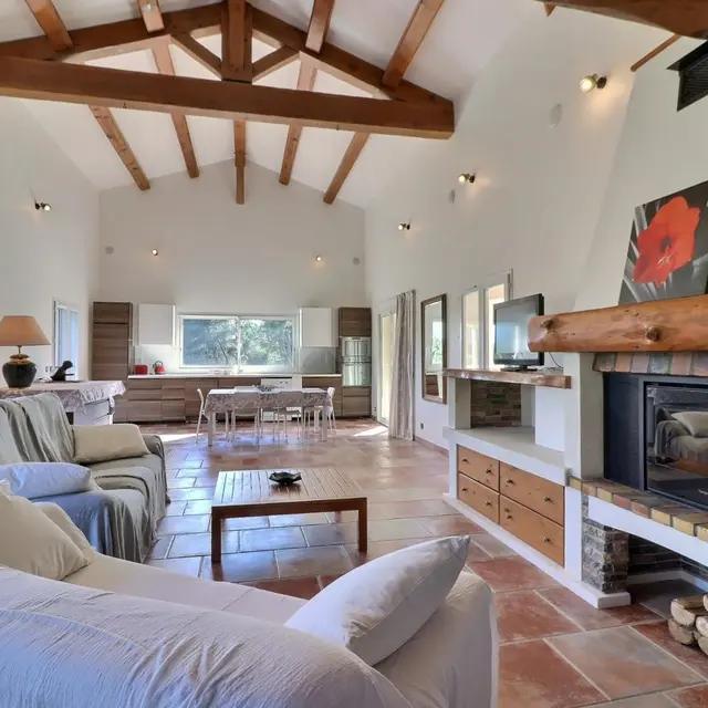 - una cocina equipada (lavavajillas, lavadora, barra de agua, frigorífico, horno, microondas, cafetera, etc.) abierta a un gran salón con mesa y 6 sillas, dos sofás, TV y chimenea.