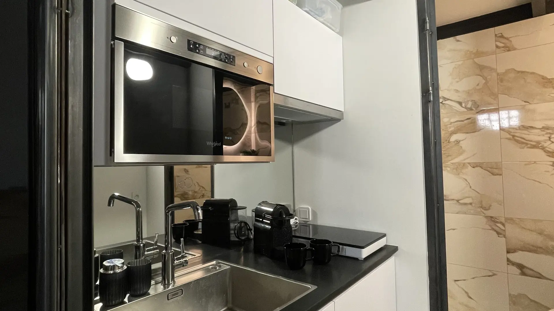 Después, en una “caja de vidrio” con efecto espejo, se encuentra una kitchenette de diseño y un conjunto de ducha/aseo tipo italiano de alto nivel.