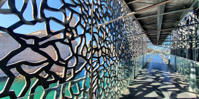 Al llegar al Mucem, me tomo un momento para admirar el antiguo muelle portuario J4, situado frente al mar y a la salida del Puerto Viejo de Marsella. Me gusta el edificio, con una arquitectura moderna, depurada y única en la ciudad.