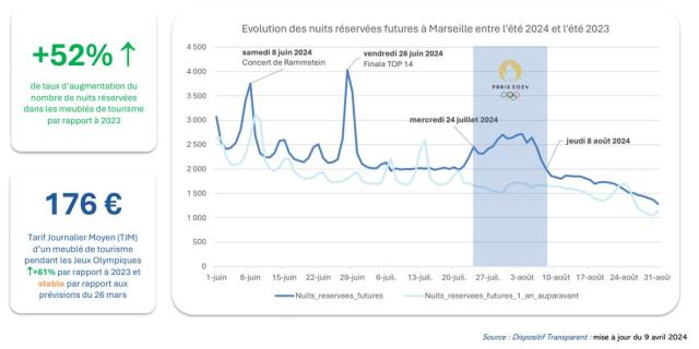 Pour l’arrivée de la flamme Olympique à Marseille le 8 mai 2024 le taux d’occupation prévisionnel est de 46% soit +15 pts par rapport au 8 mai 2023 (état au 01/04/2024 par rapport à l’état du 03/04/2023).