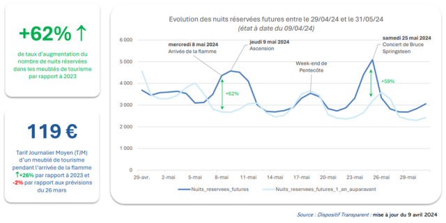 L’arrivée de la flamme est accolée à un long week-end de l’ascension, qui aura lieu entre le jeudi 9 mai et le dimanche 12 mai. Entre ces deux dates, le TO prévisionnel moyen (à date du 2 avril 2024) est de 36% soit le même taux par rapport au week-end de l’ascension de 2023 (qui a eu lieu entre le jeudi 18 mai et le dimanche 21 mai 2023).
