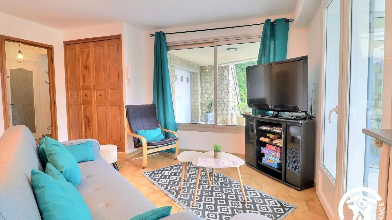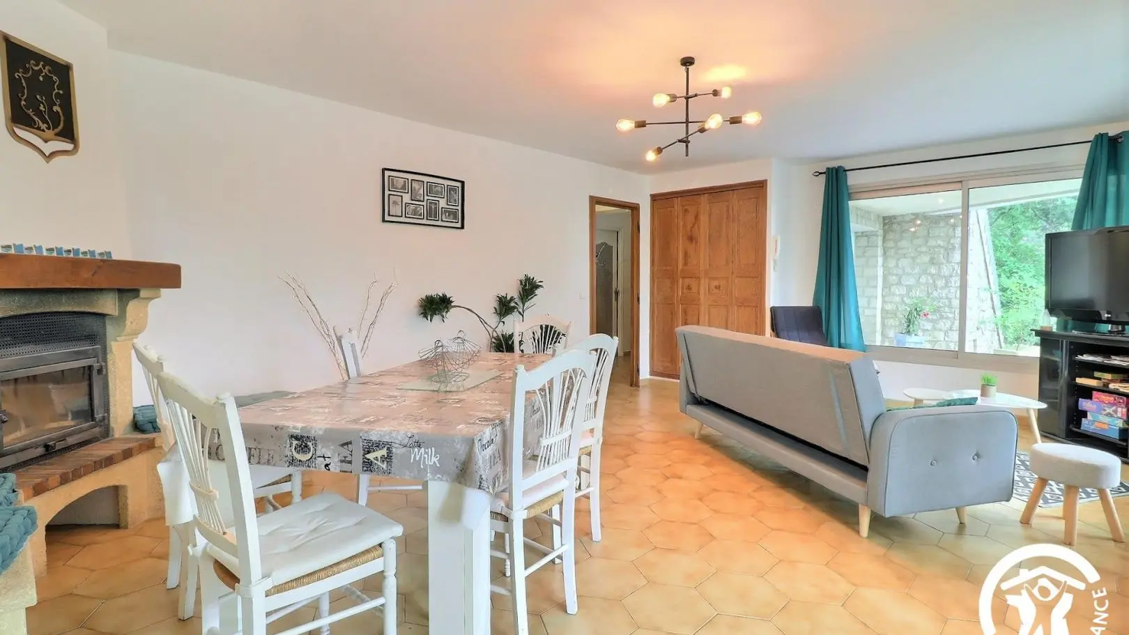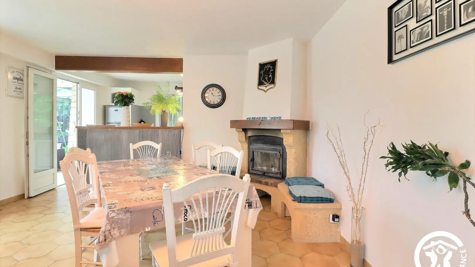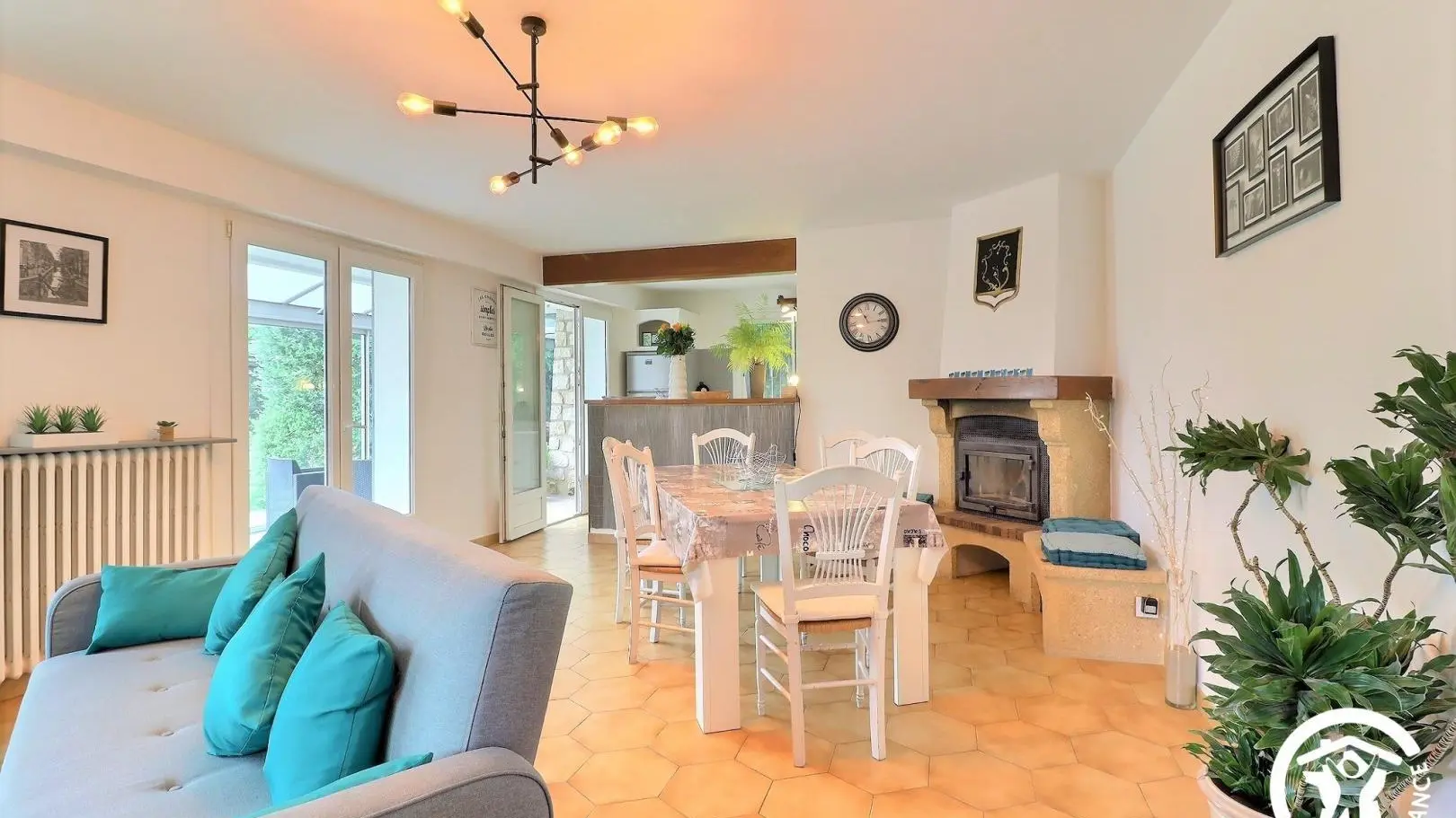 - Séjour avec salon (canapé, fauteuil, pouf, TV écran plat et jeux de société), espace repas devant la cheminée (bois fourni) pour 6 personnes, banc autour de la cheminée. Cuisine ouverte sur le séjour via un bar, équipée d'une place 4 feux vitrocéramique, hotte, four, micro-ondes, réfrigérateur/congélateur et cafetière à dosettes Senseo.