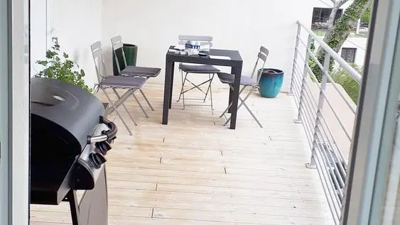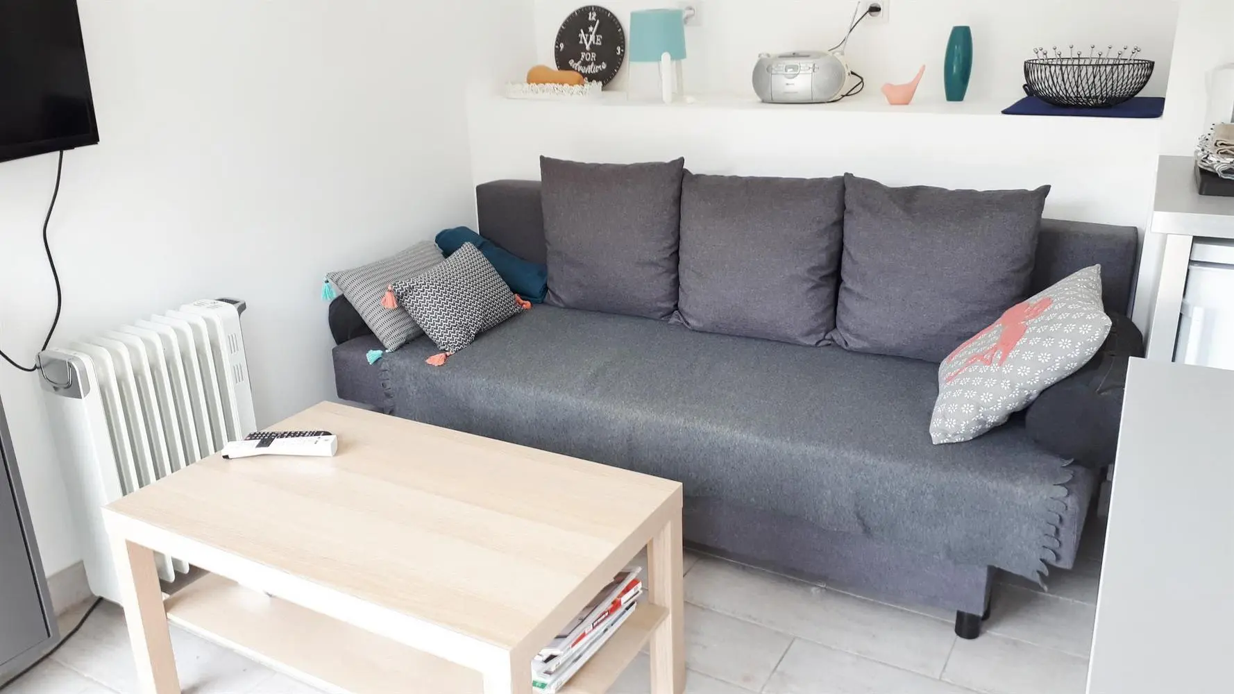 Il est composé d'un séjour avec canapé, table basse, TV écran plat 80cm, chaînes de la box orange et lecteur DVD. Cuisine équipée ouverte avec plaque 2 feux induction, hotte aspirante à extraction, combiné four / micro-ondes, petit réfrigérateur, lave-vaisselle 45cm et bar avec 2 tabourets hauts. Coin nuit séparé fermé avec un lit 2 personnes 140x190cm, grande penderie, dans une alcôve, ambiance cabine de bateau.