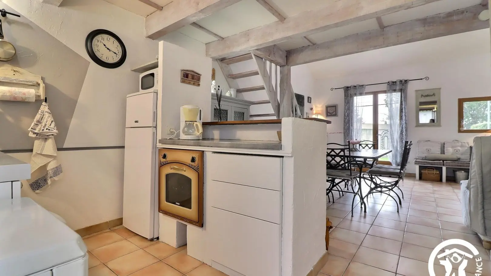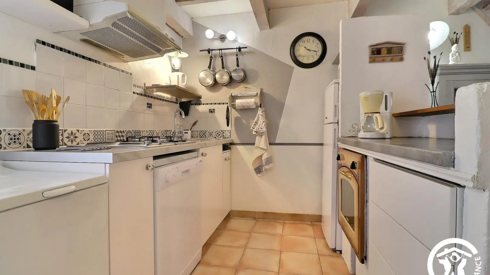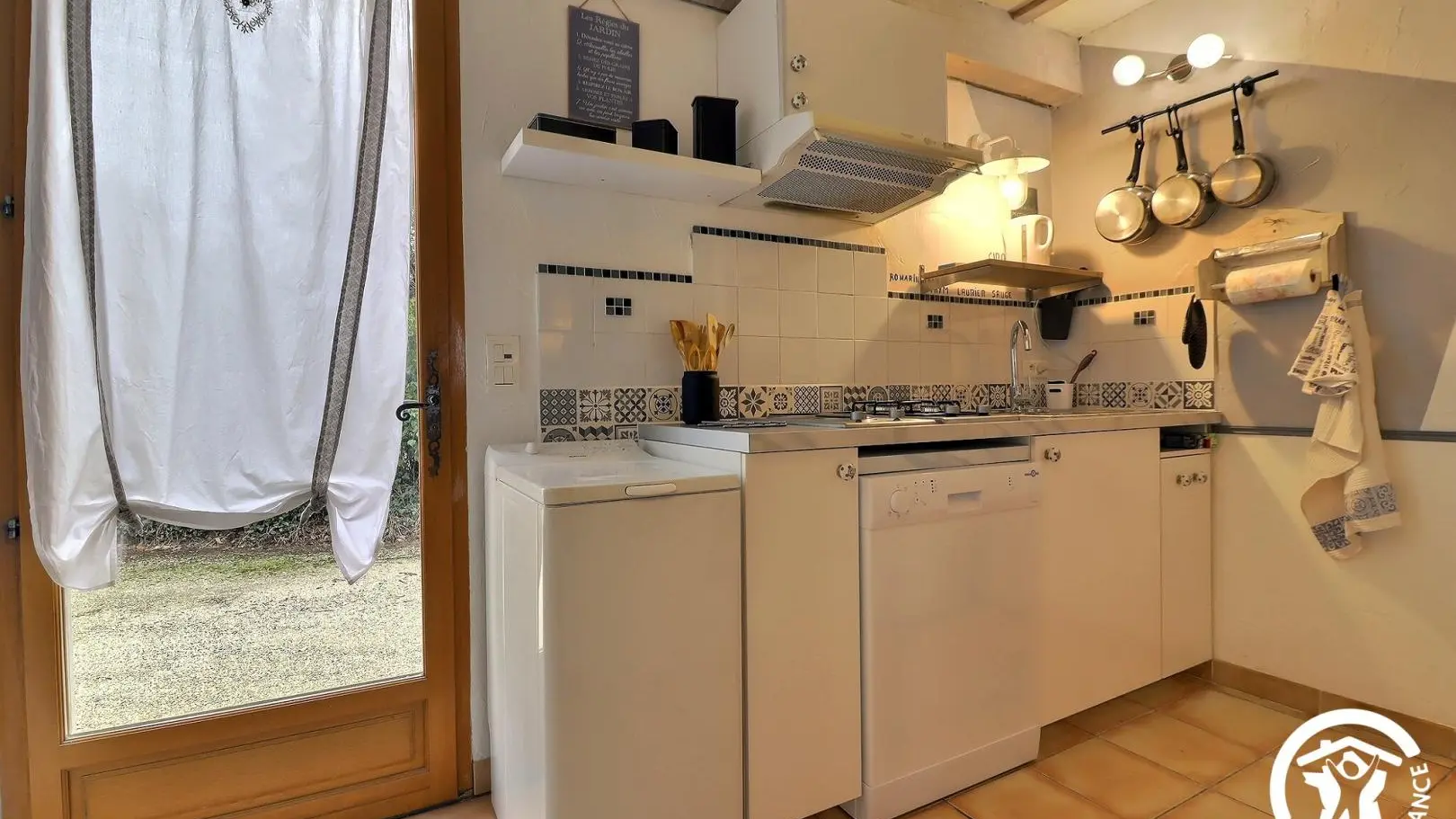 Cuisine entièrement aménagée (lave vaisselle, lave linge, plaques gaz, four, frigo, cafetière à filtre + Senseo, bouilloire, grille pain).