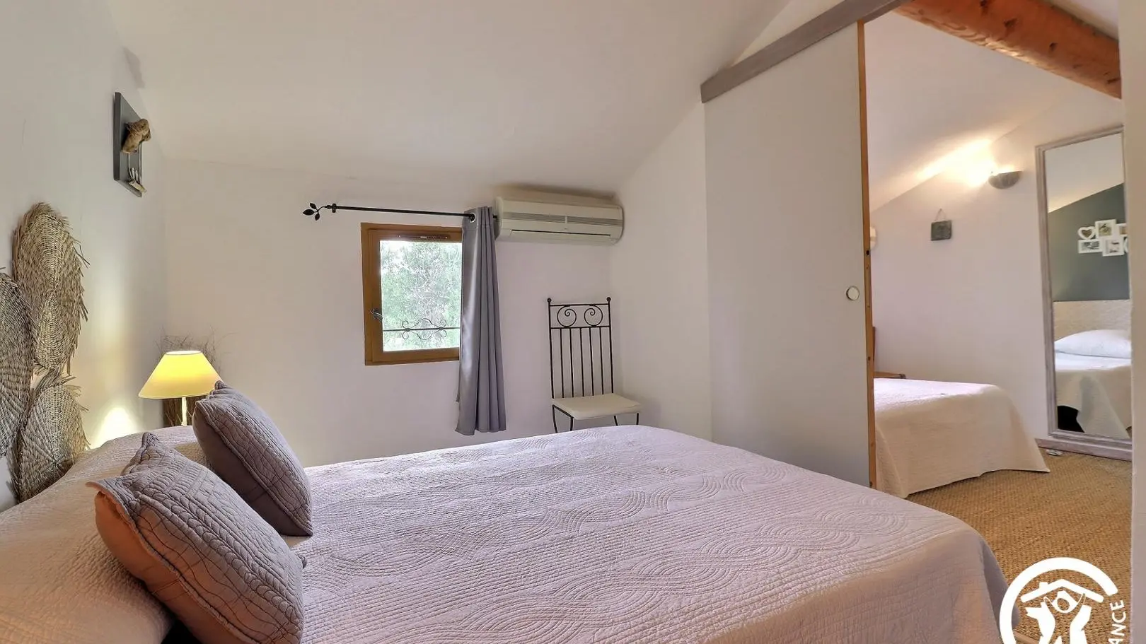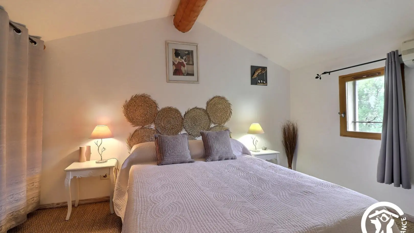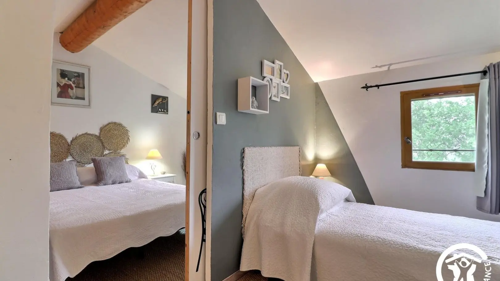 A l'étage, 2 chambres communicantes avec un lit 2 personnes (140x190) et un lit 1 personne (90x190), la petite chambre disposant également d'un bureau. Climatisation à l'étage pouvant climatiser tout le gîte. Terrasse ombragée avec salon de jardin et espace gazonné (30 m²), barbecue. Chauffage, draps inclus. Wi-Fi . Ménage sur demande et linge de toilette en supplément. La taxe de séjour en sus.