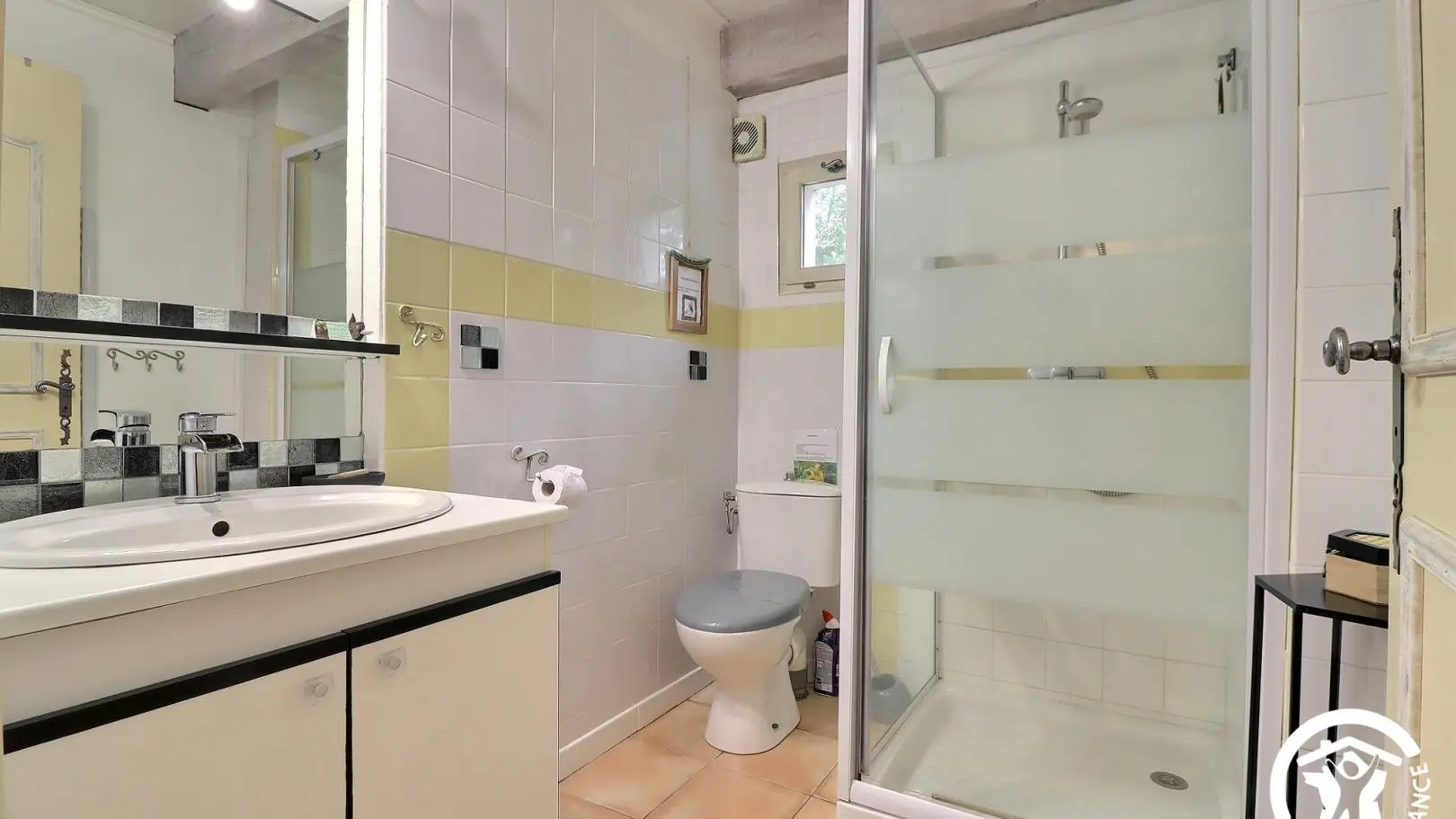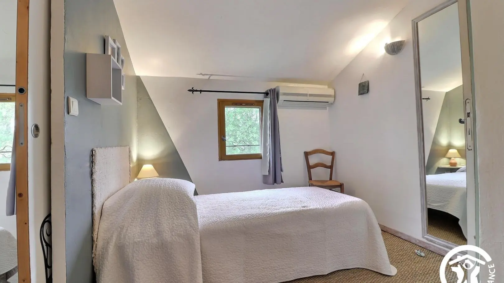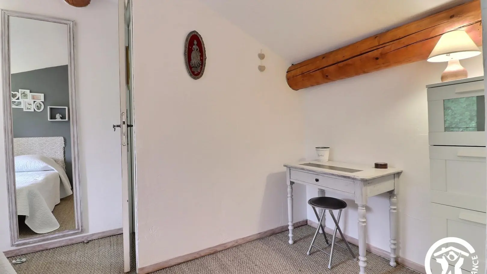 A l'étage, 2 chambres communicantes avec un lit 2 personnes (140x190) et un lit 1 personne (90x190), la petite chambre disposant également d'un bureau. Climatisation à l'étage pouvant climatiser tout le gîte. Terrasse ombragée avec salon de jardin et espace gazonné (30 m²), barbecue. Chauffage, draps inclus. Wi-Fi . Ménage sur demande et linge de toilette en supplément. La taxe de séjour en sus.