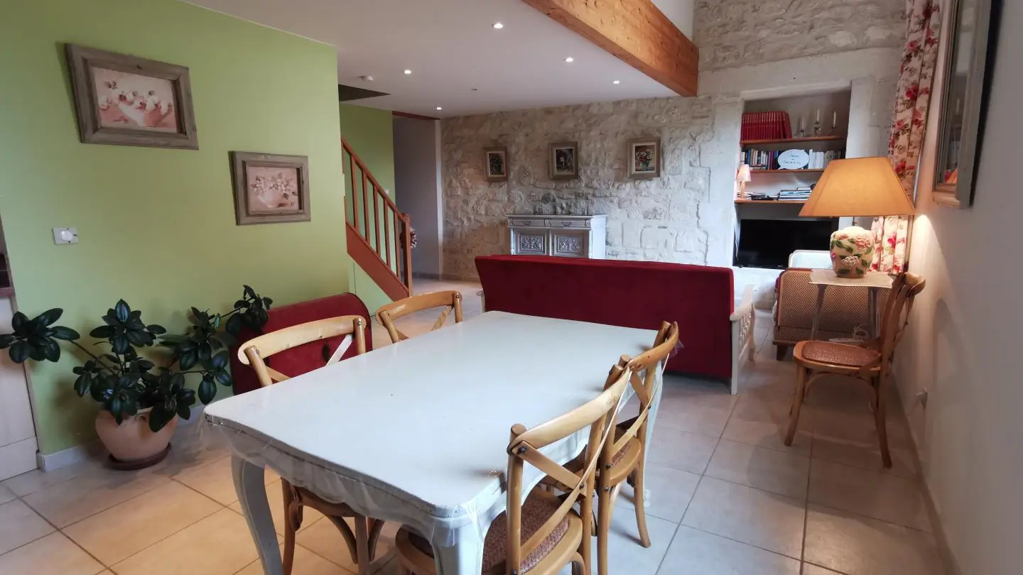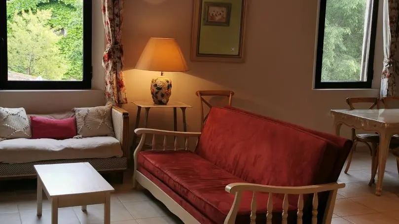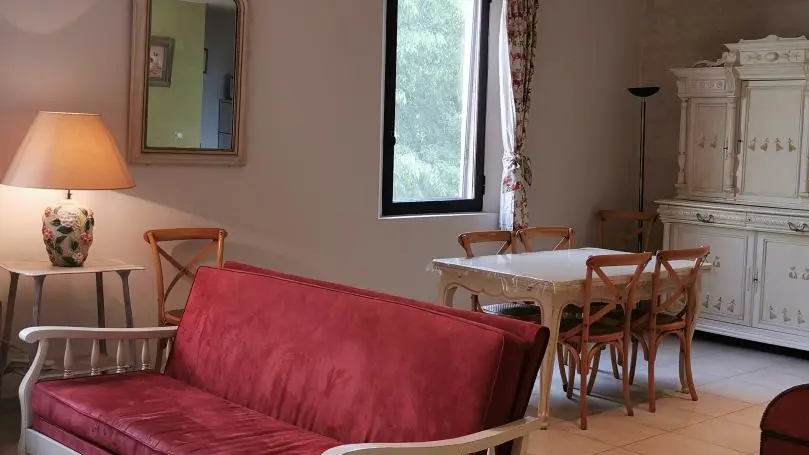 Séjour/salon avec canapé, TV, coin repas, et coin cuisine avec four micro ondes combiné, lave vaisselle, petit électroménager. Salle d'eau avec douche fermée. Wc indépendant. Lave linge dans un petit espace buanderie