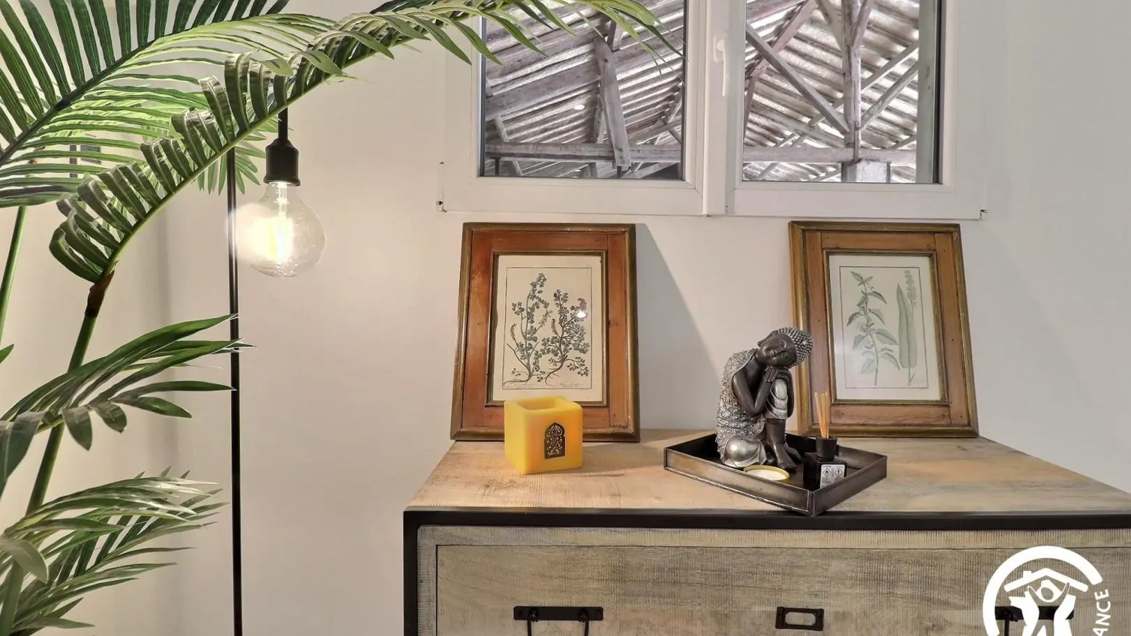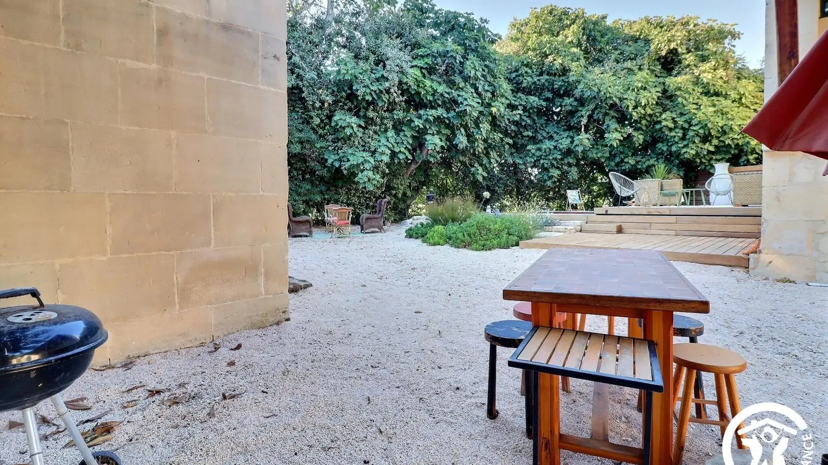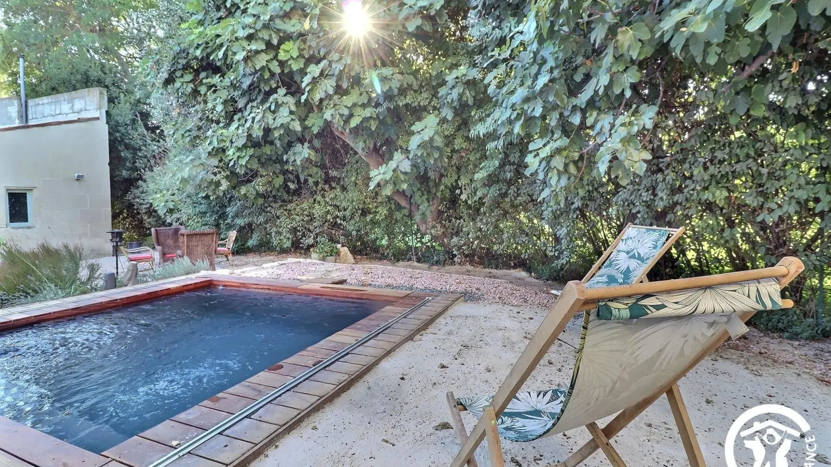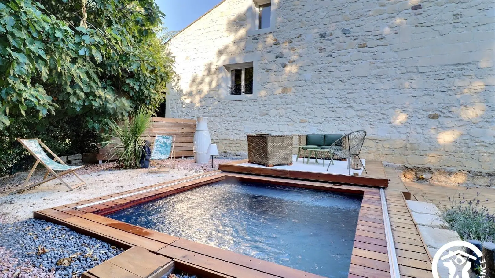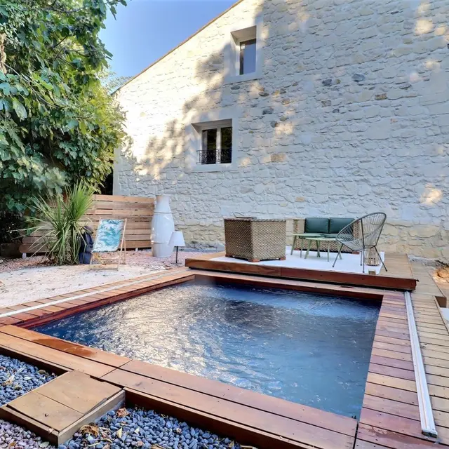 Le gîte est une dépendance située à l'arrière de la maison des propriétaires, séparée par un cour gravillonnée ainsi qu'une piscine privative de 3x3m sécurisée par deck (ouverte de mi-juin à mi-septembre), un coin salon de détente sur une terrasse en bois et un coin repas avec barbecue.