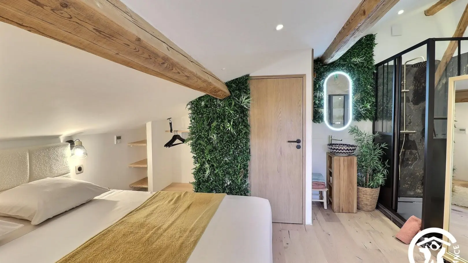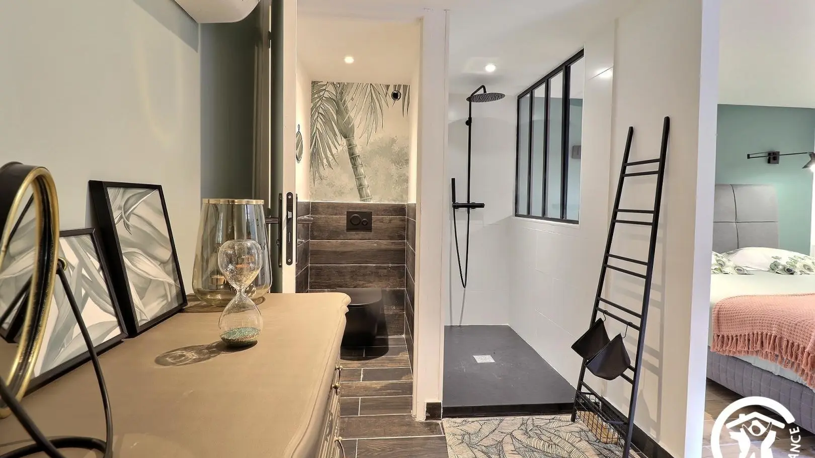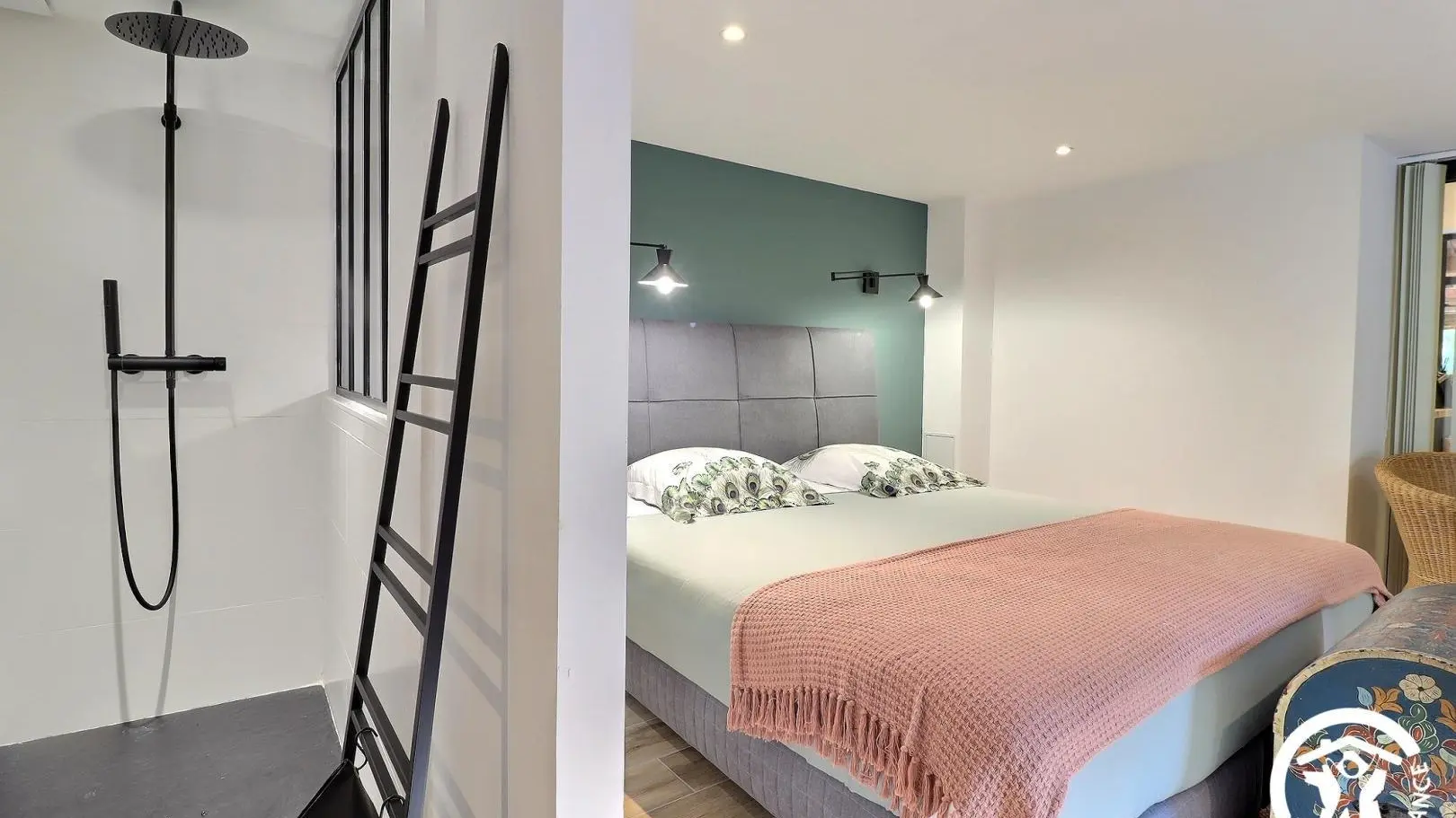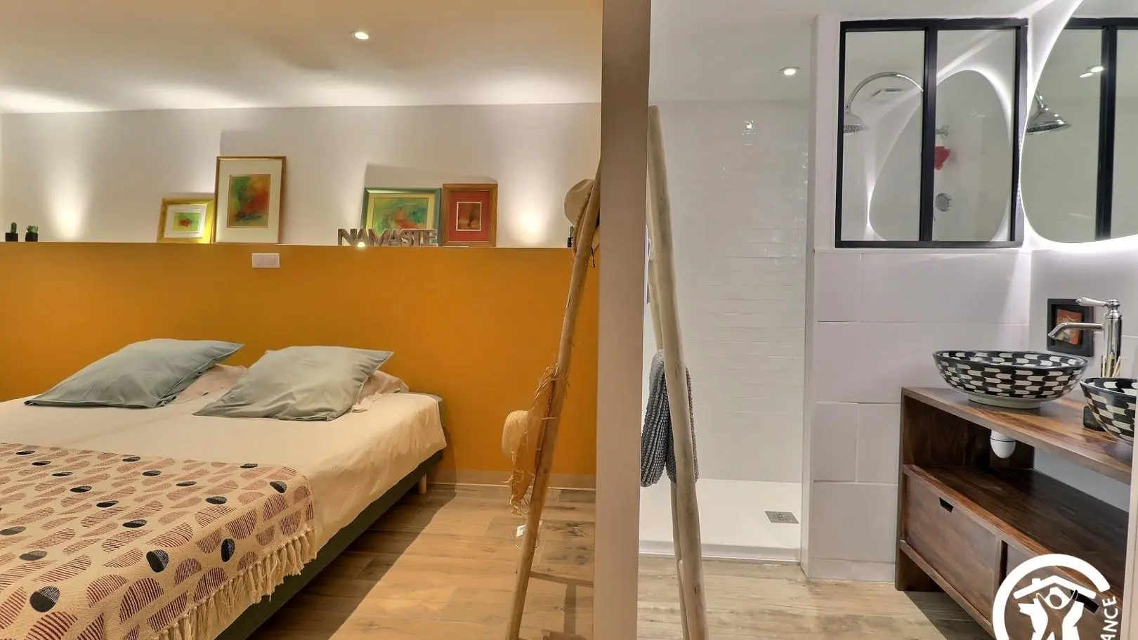 - Chambre avec 1 lit 180x200cm, salle d'eau privative avec douche à l'italienne, vasque et WC indépendant.