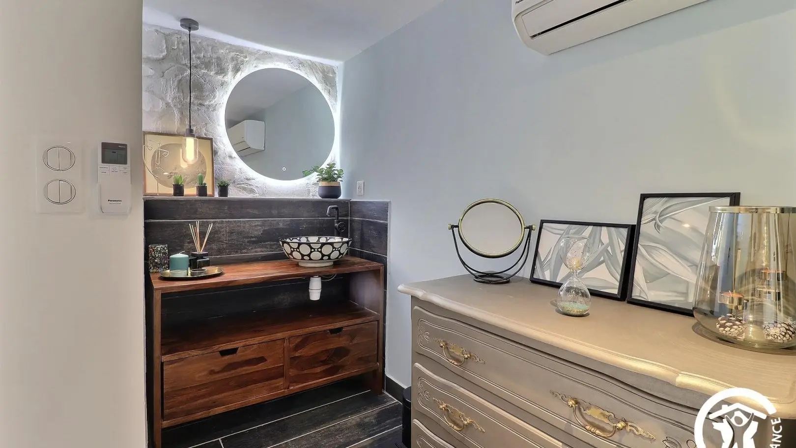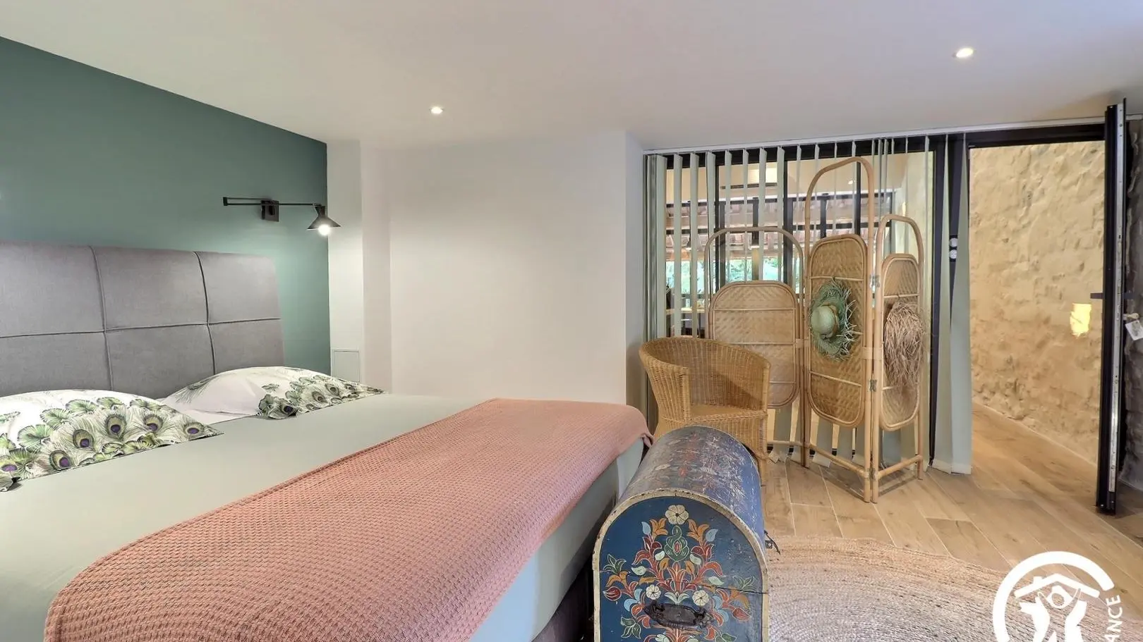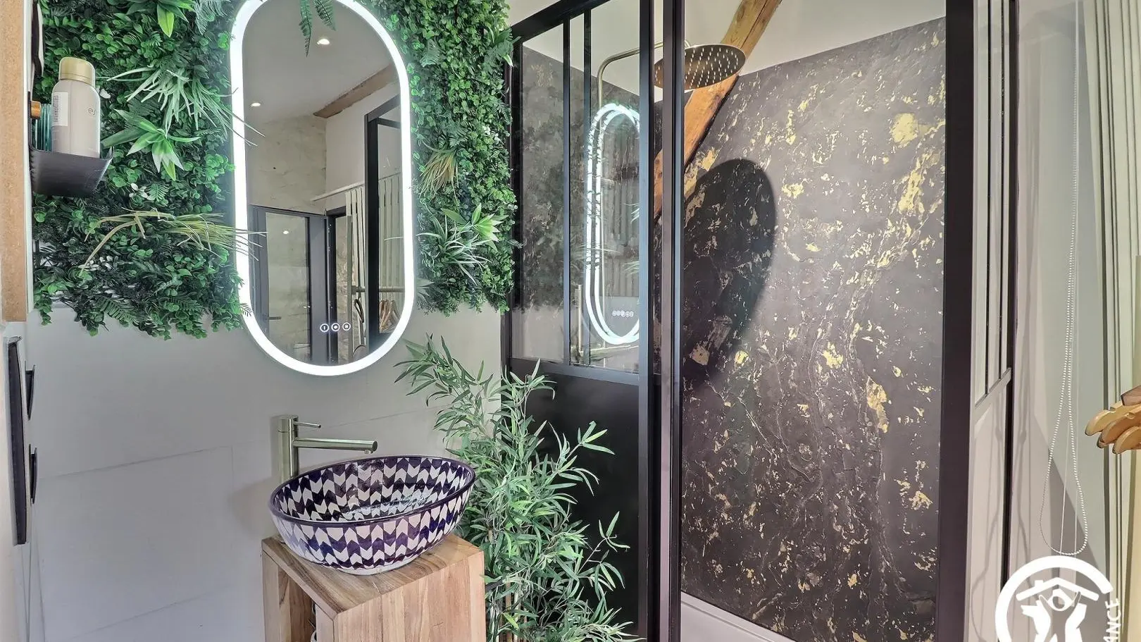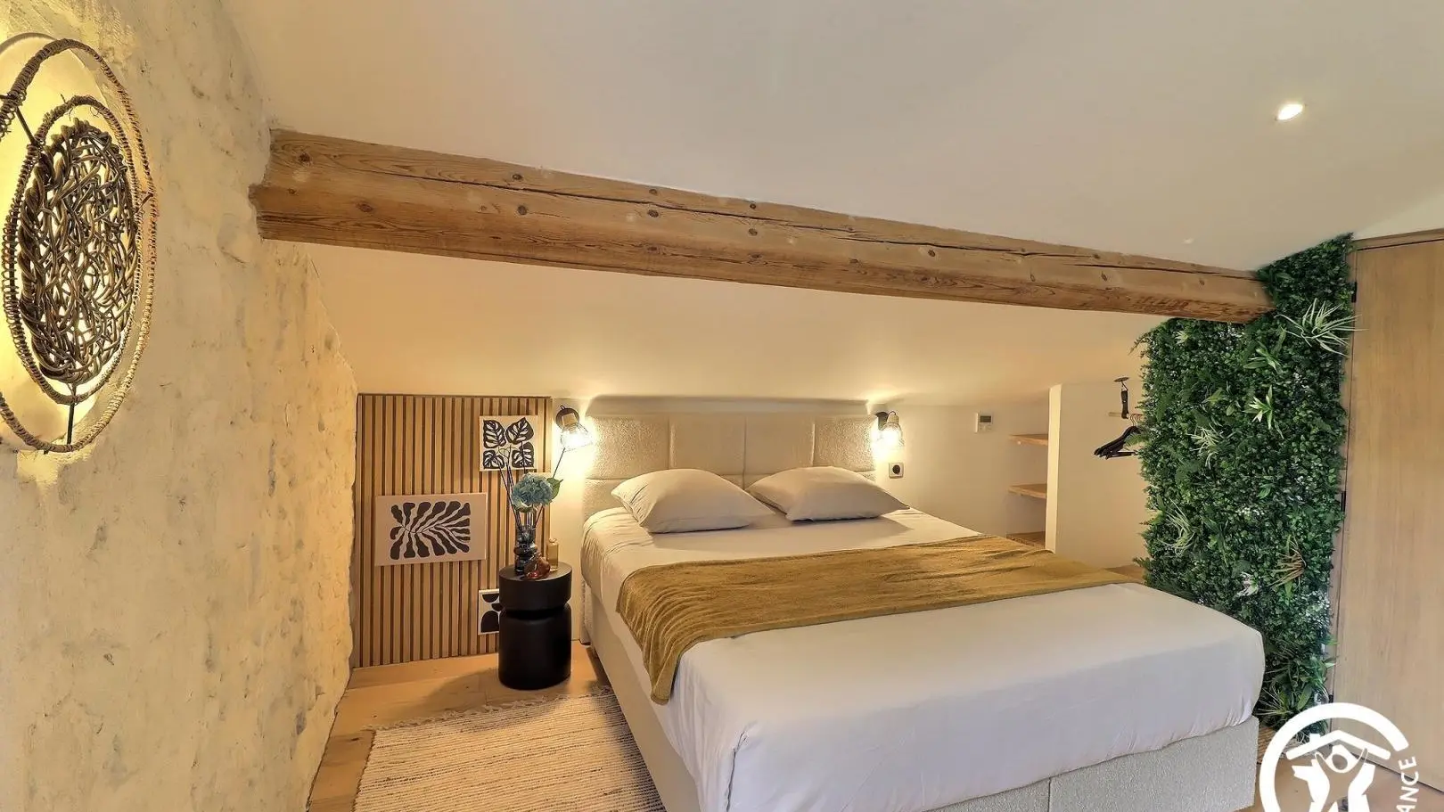 - Chambre avec 1 lit 180x200cm, salle d'eau privative avec douche à l'italienne, vasque et WC indépendant.