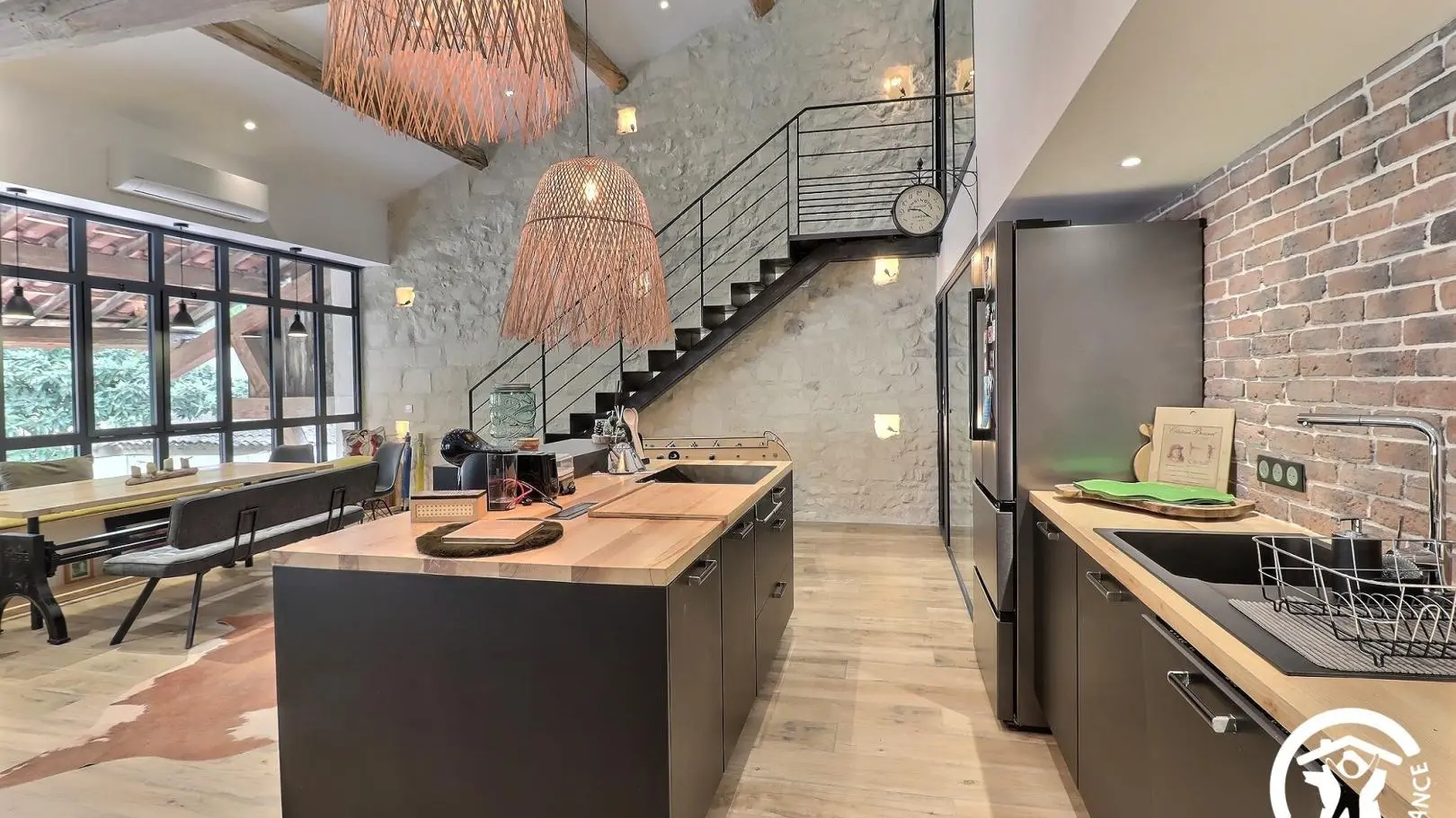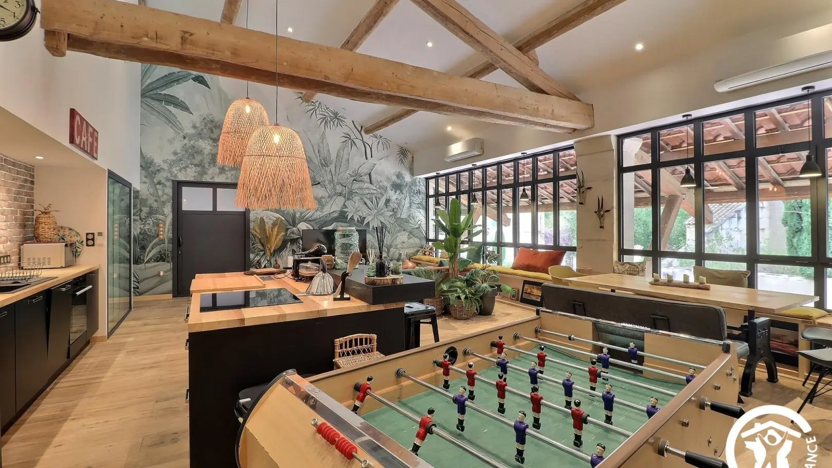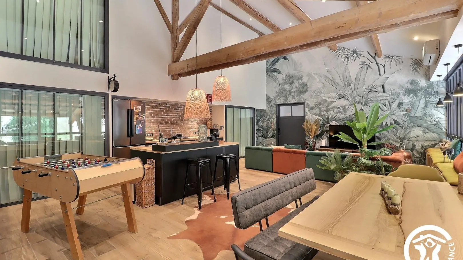 - Grande pièce de jour : cuisine équipée ouverte au milieu de la pièce, avec réfrigérateur/congélateur américain, four, micro-ondes, lave-vaisselle, 3 feux induction. Salon avec grand canapé d'angle, table basse, TV connectée. Table repas avec banquette et chaises. Babyfoot
