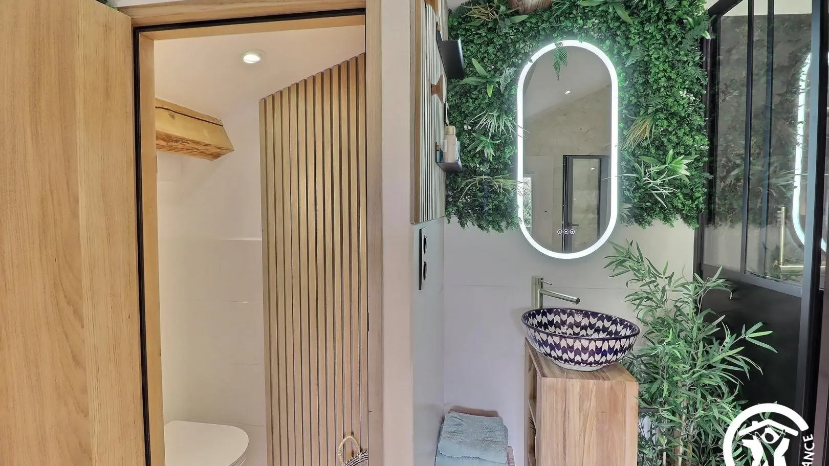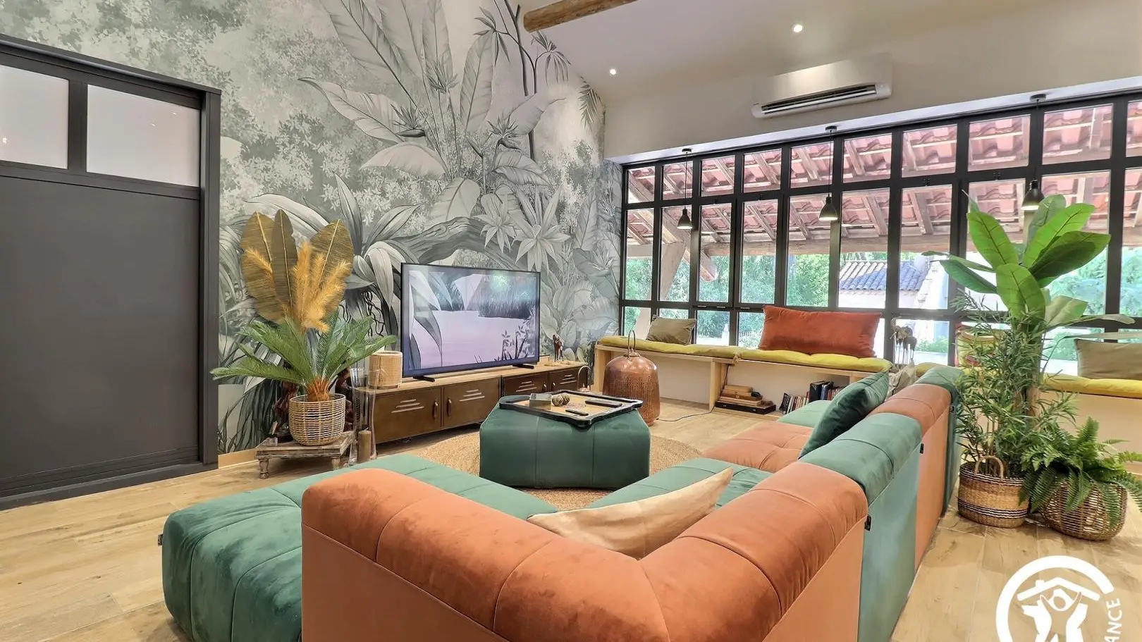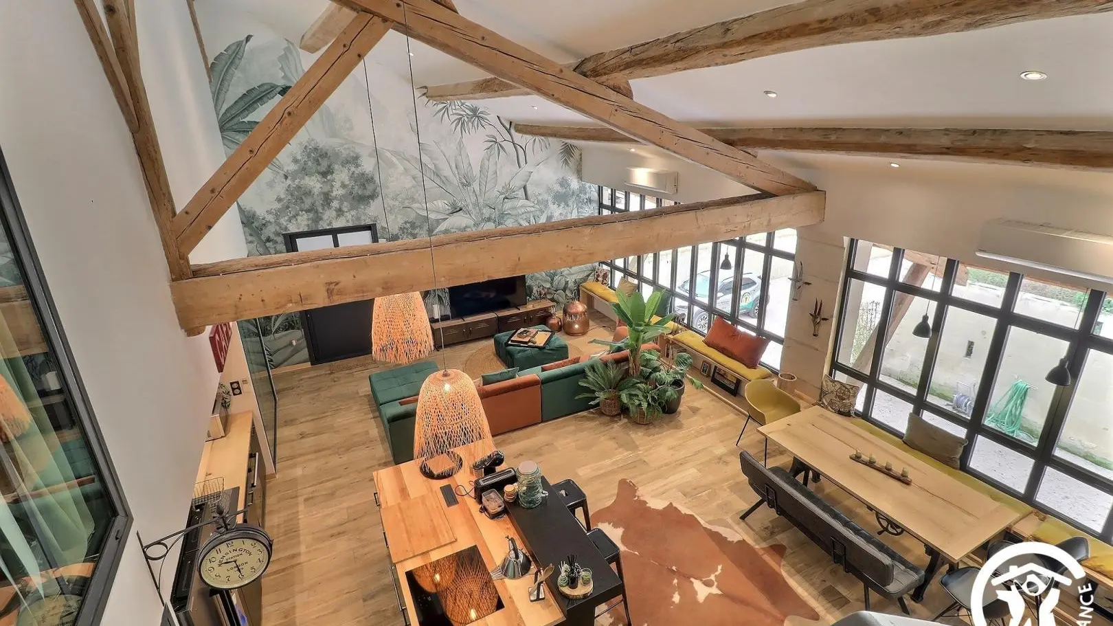 - Grande pièce de jour : cuisine équipée ouverte au milieu de la pièce, avec réfrigérateur/congélateur américain, four, micro-ondes, lave-vaisselle, 3 feux induction. Salon avec grand canapé d'angle, table basse, TV connectée. Table repas avec banquette et chaises. Babyfoot