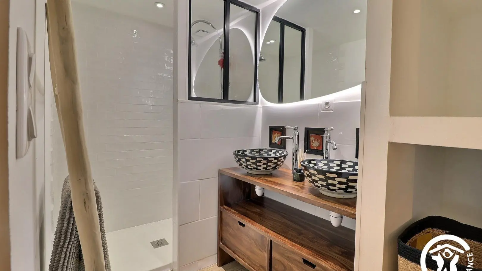 - Chambre avec 2 lits 90x200cm jumelables en lit 180x200cm, salle d'eau privative avec douche à l'italienne, double vasque et WC indépendant