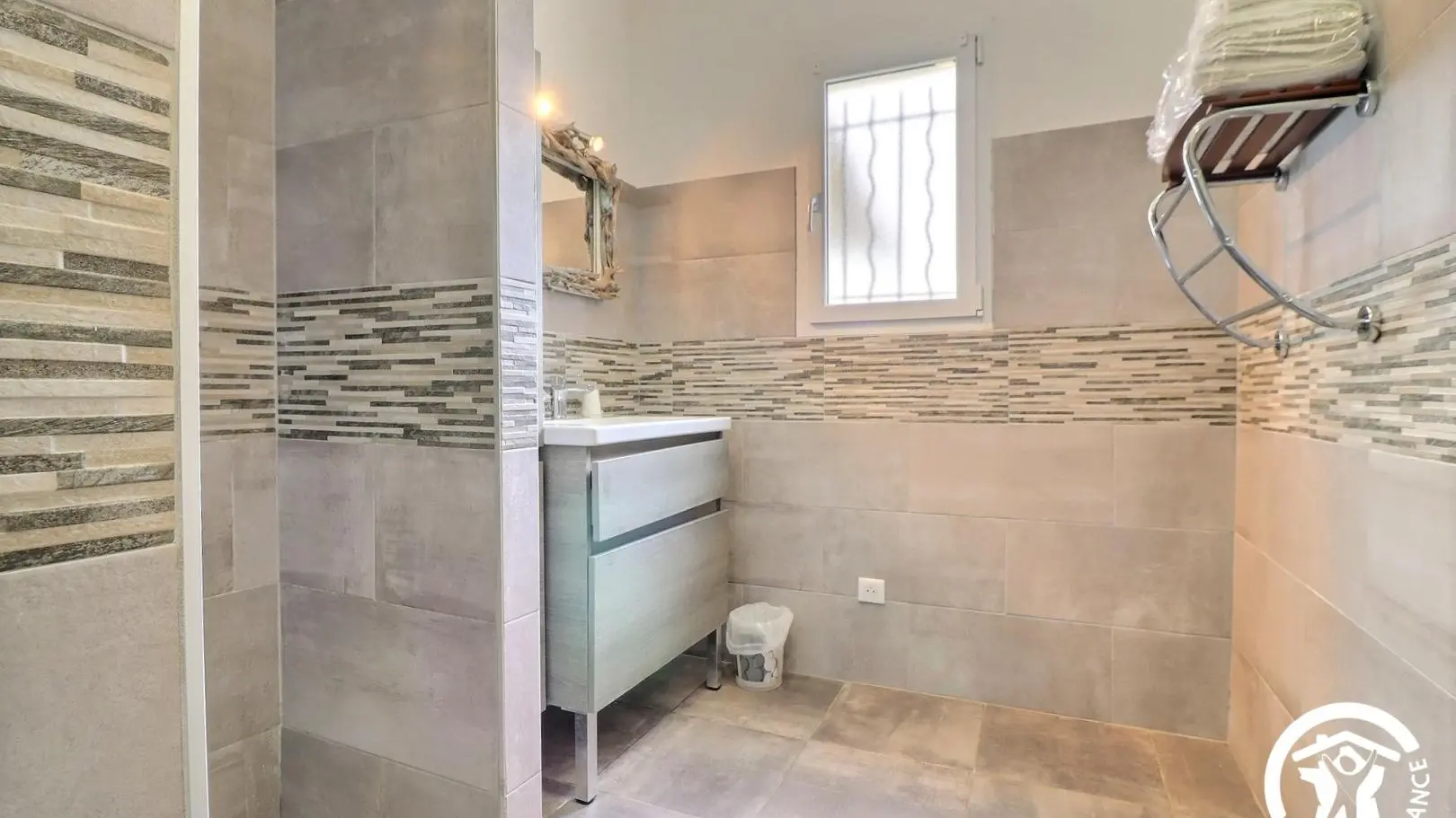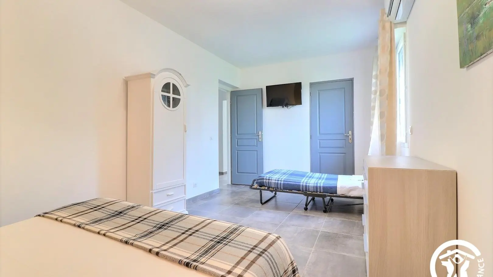 Une chambre avec lit 2 personnes (140x190) et une chambre avec 3 lits 1 personne (90x190). Salle d'eau avec belle douche italienne, wc indépendant.