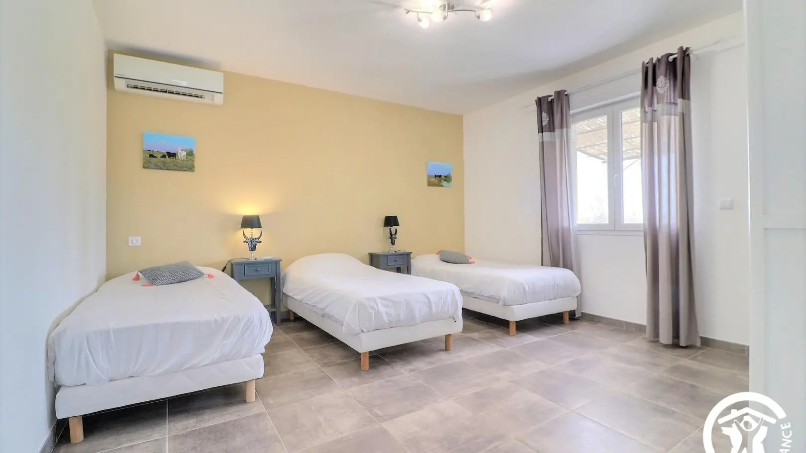 Deux gîtes mitoyens totalement rénovés (2018) et aménagés dans un ancien bâtiment, entourés de pâturages des taureaux, au bout d'une piste de 1.4 kms à partir du Mas de Pioch (chambres, salle de réception).