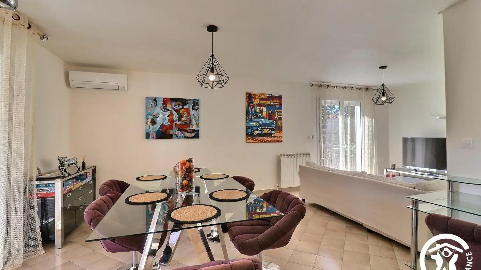 - Un séjour climatisé avec table et 6 chaises, coin bureau, canapé et TV