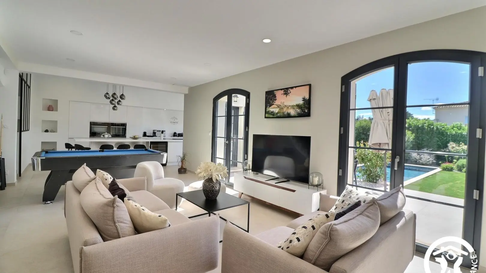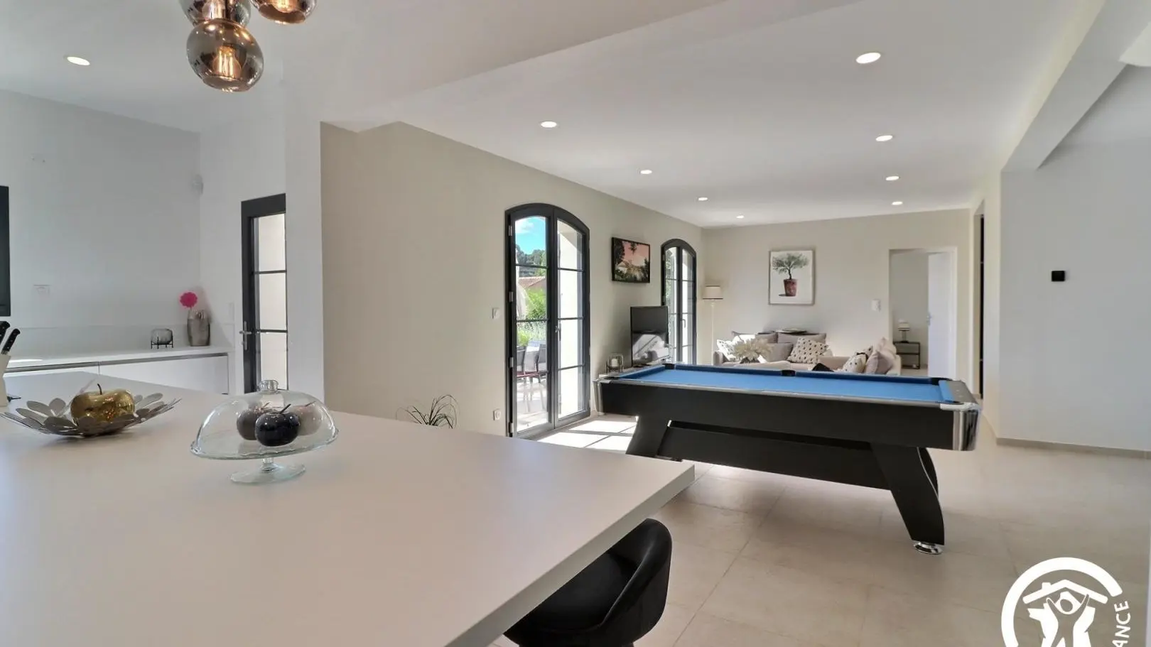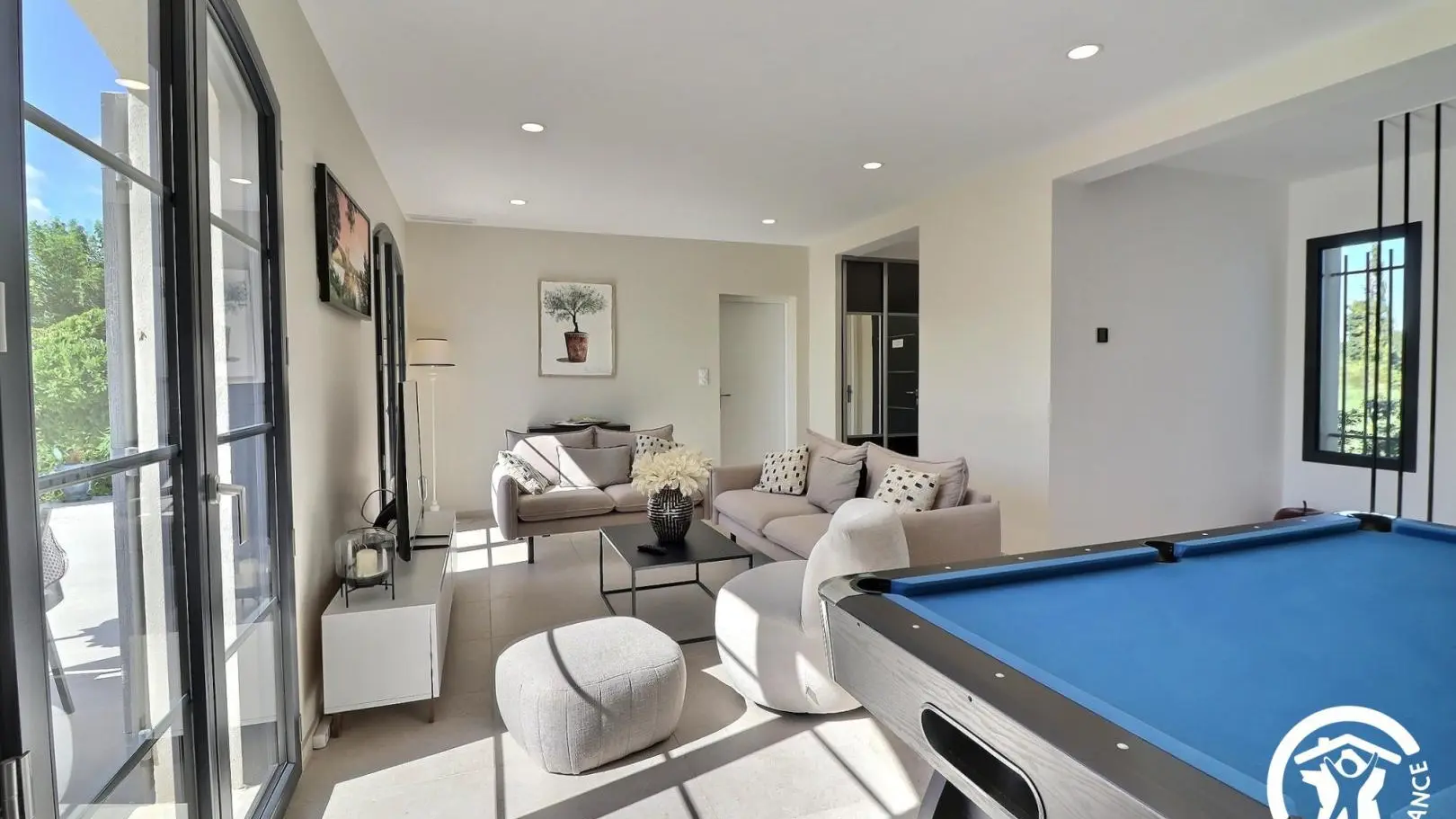 Villa moderne et lumineuse laissant entrer beaucoup de lumière naturelle. Vous trouverez une table de billard, piscine et conforts.