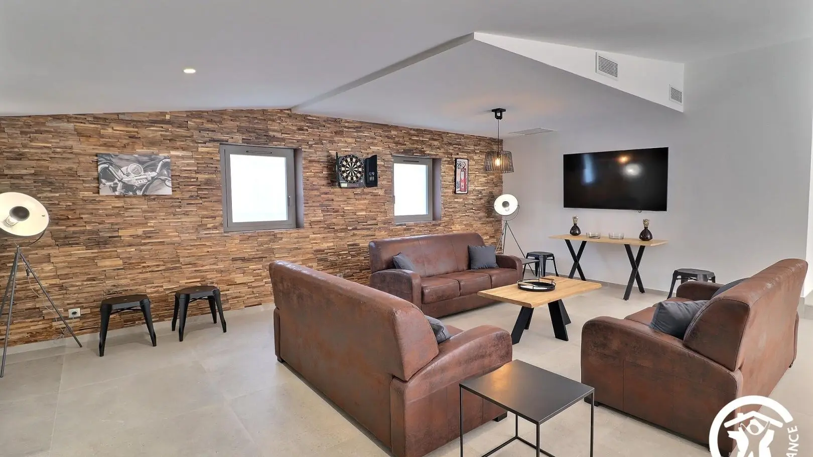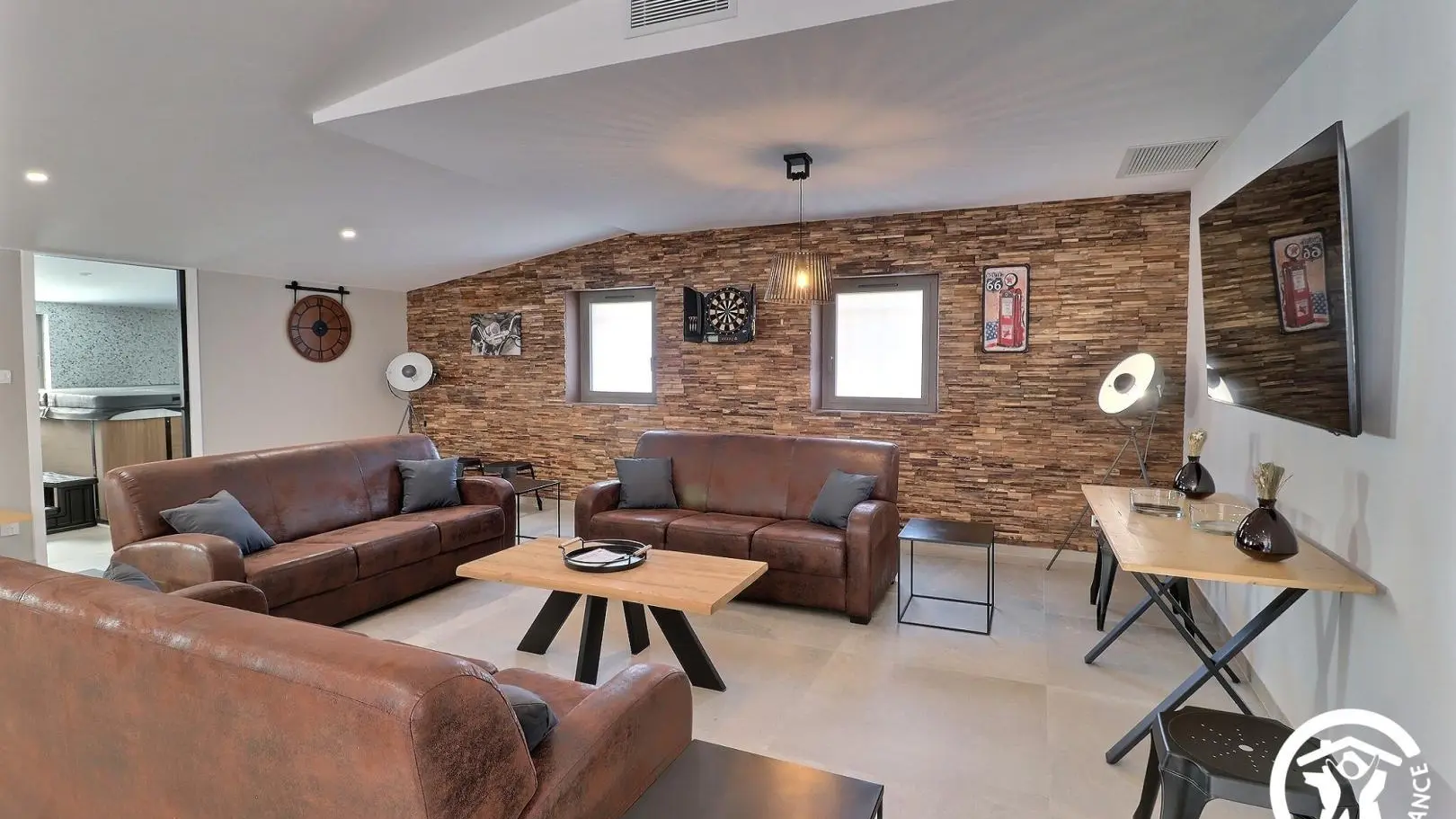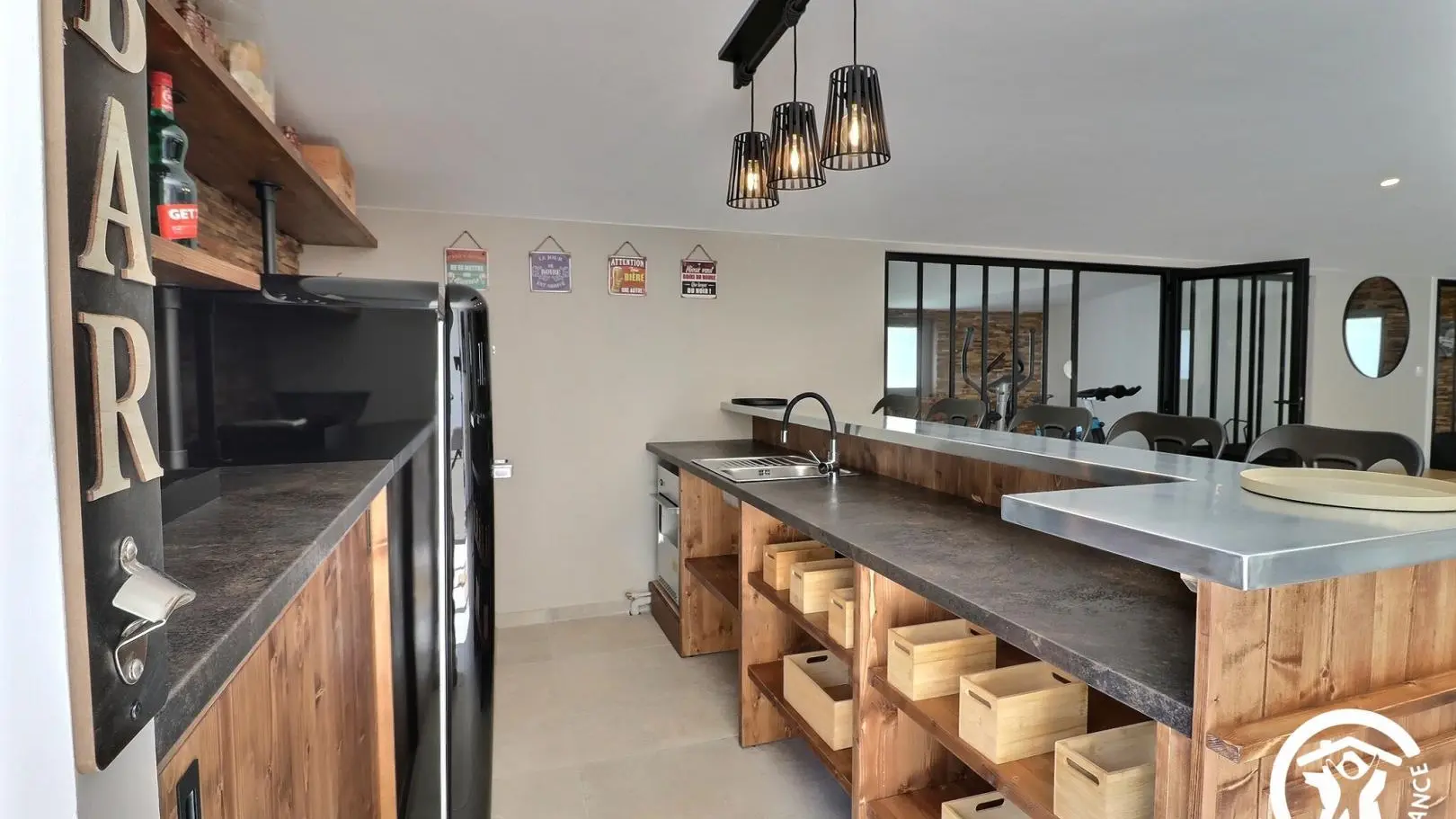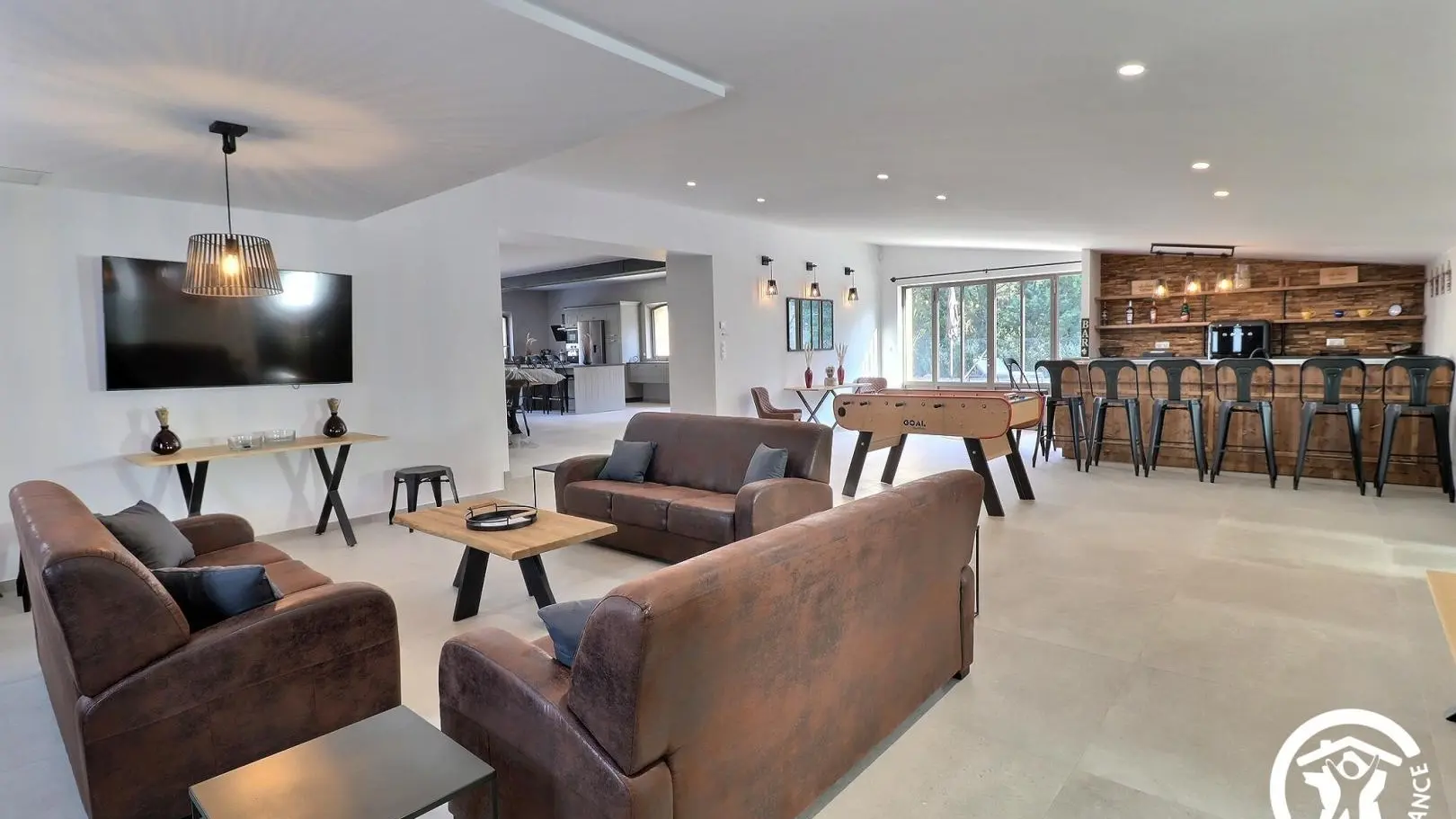 Le rez-de-chaussée vous accueille avec un grand espace de vie lumineux comprenant une cuisine entièrement équipée, un salon avec bar, babyfoot, fléchettes, ainsi qu'un espace bien-être avec spa et une salle de sport.