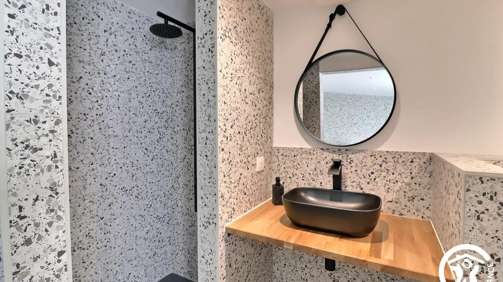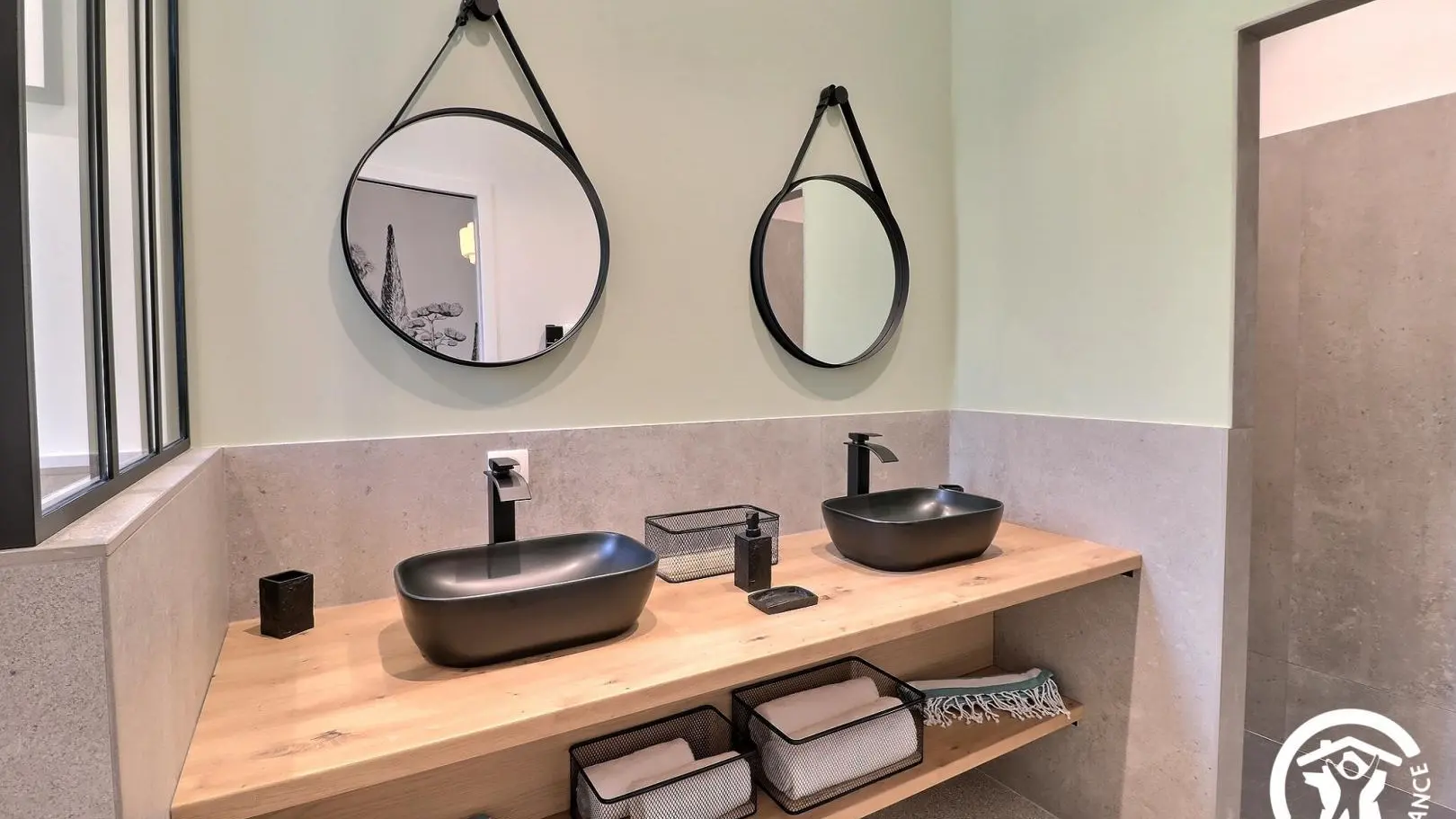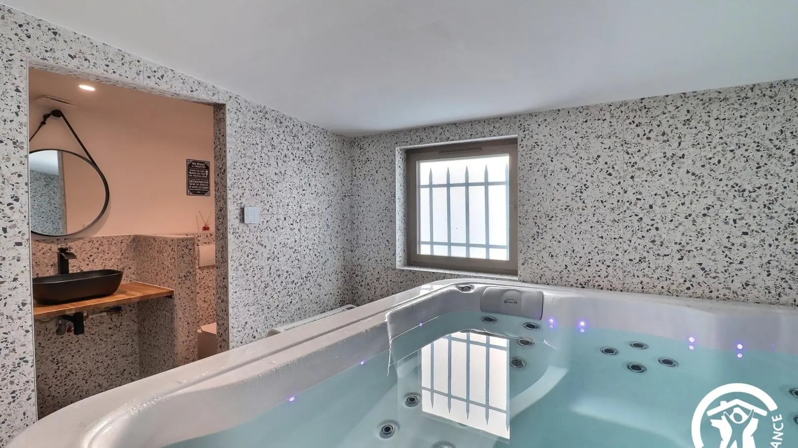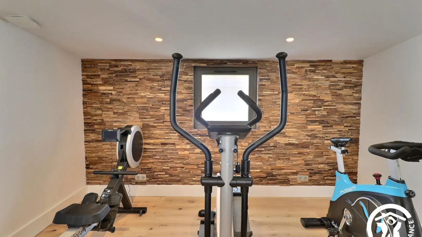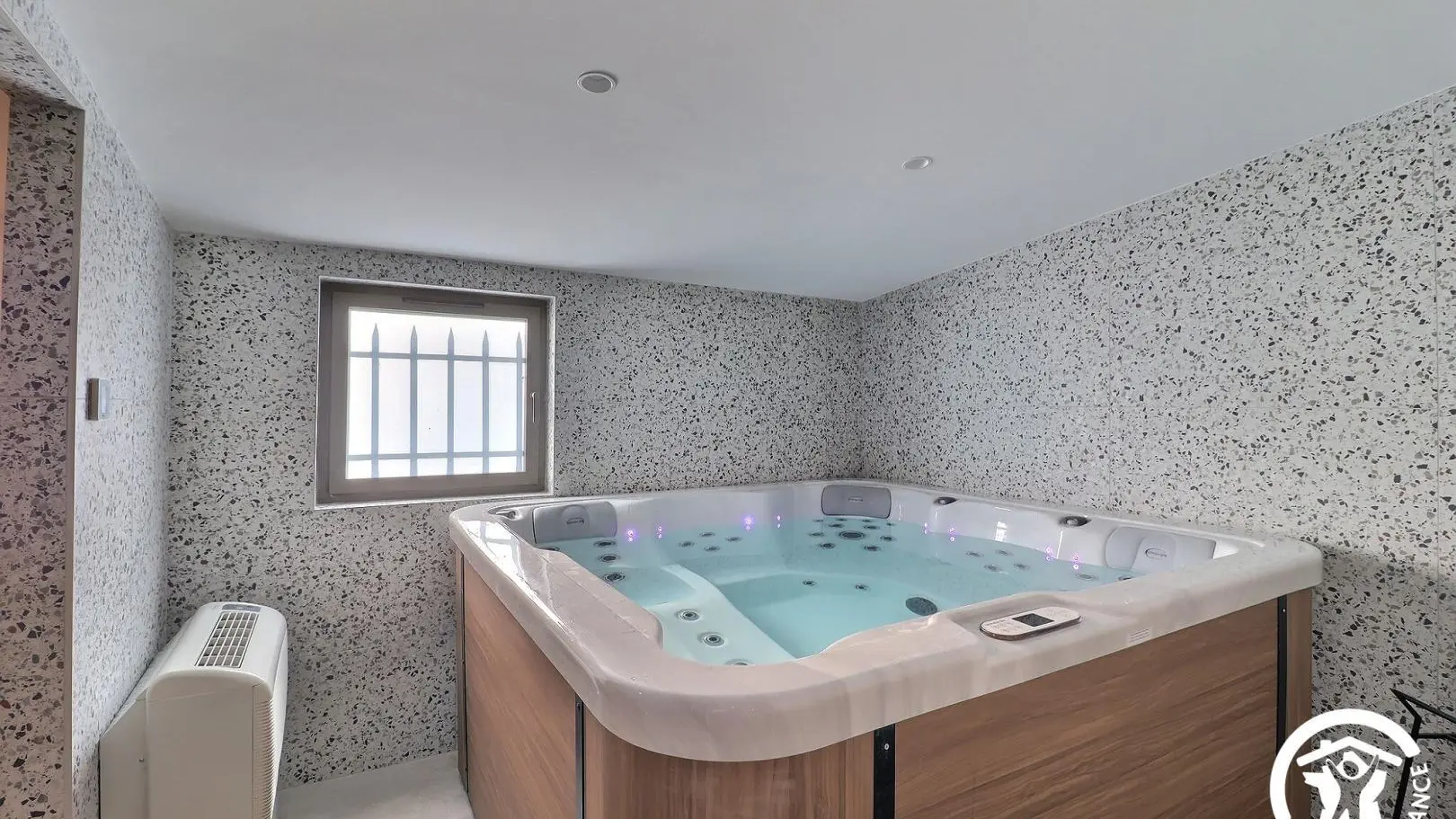Le rez-de-chaussée vous accueille avec un grand espace de vie lumineux comprenant une cuisine entièrement équipée, un salon avec bar, babyfoot, fléchettes, ainsi qu'un espace bien-être avec spa et une salle de sport.