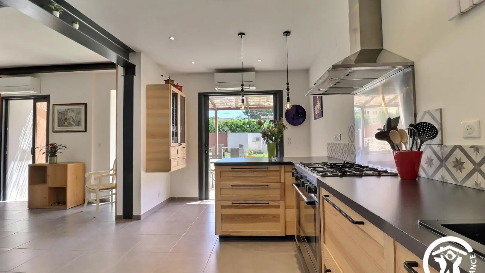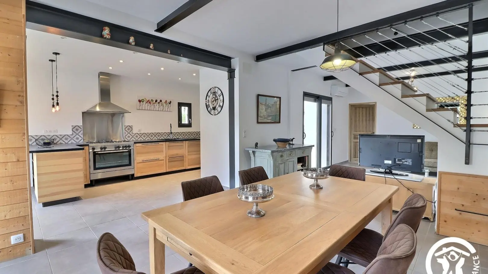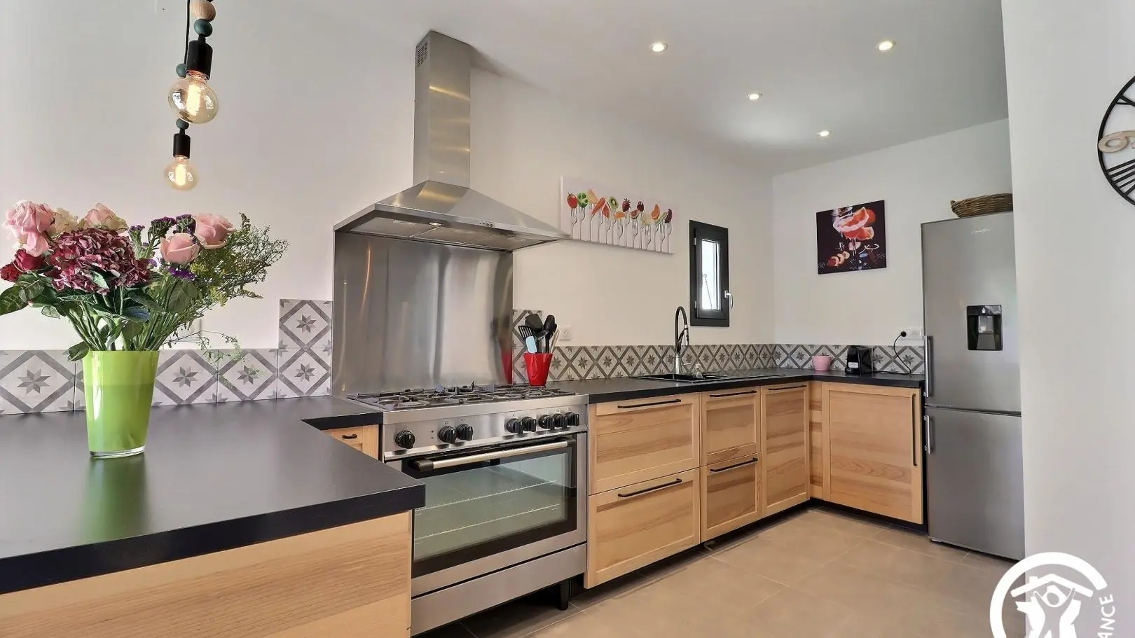 - Une cuisine avec piano 5 feux gaz, four grande capacité, hotte, évier avec douchette, lave-vaisselle, micro-ondes,