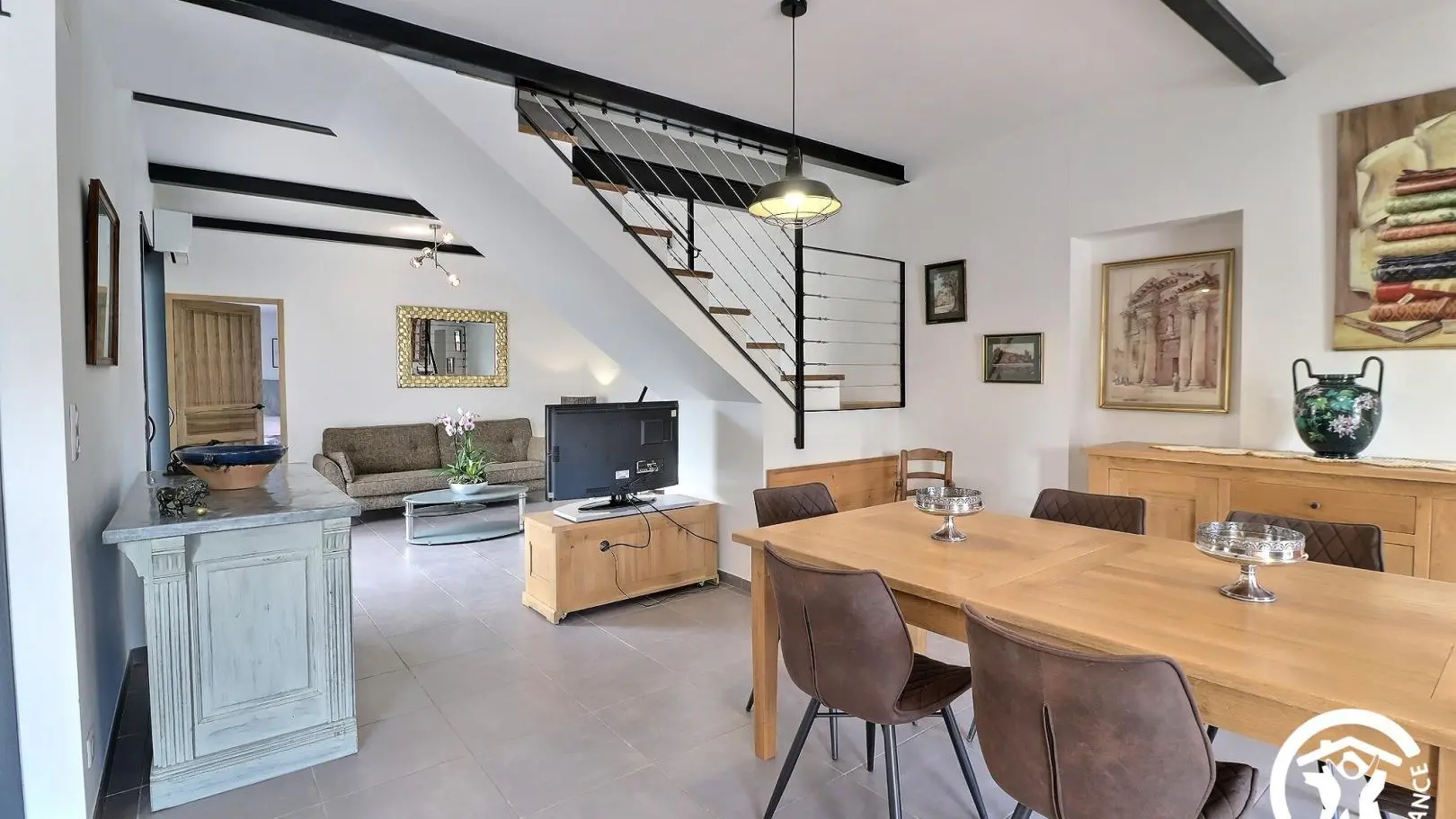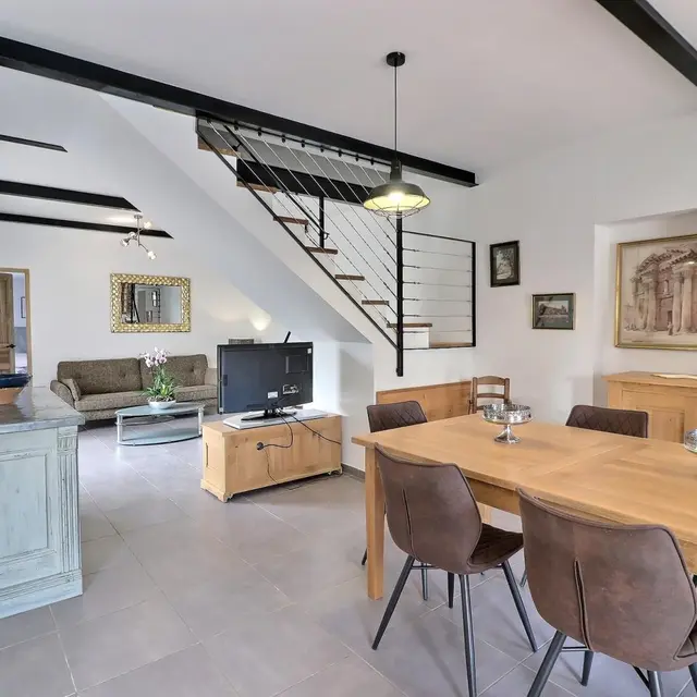 - Un salon ouvert sur la salle à manger avec espace repas pour 6. Il comprend un canapé et une TV écran plat 80cm (chaînes box