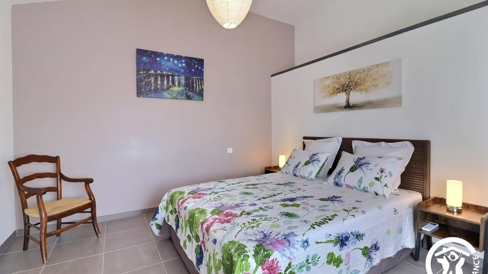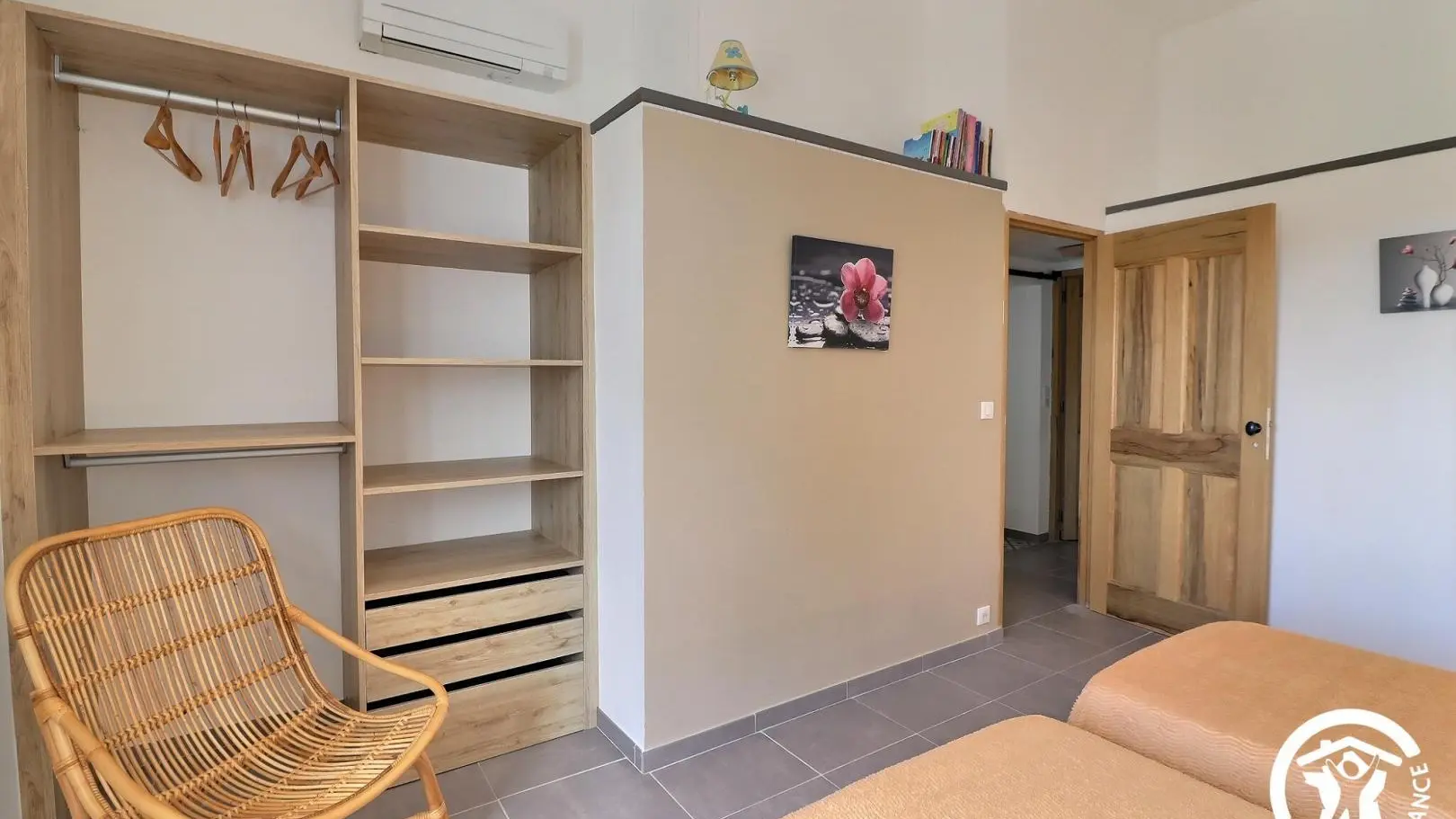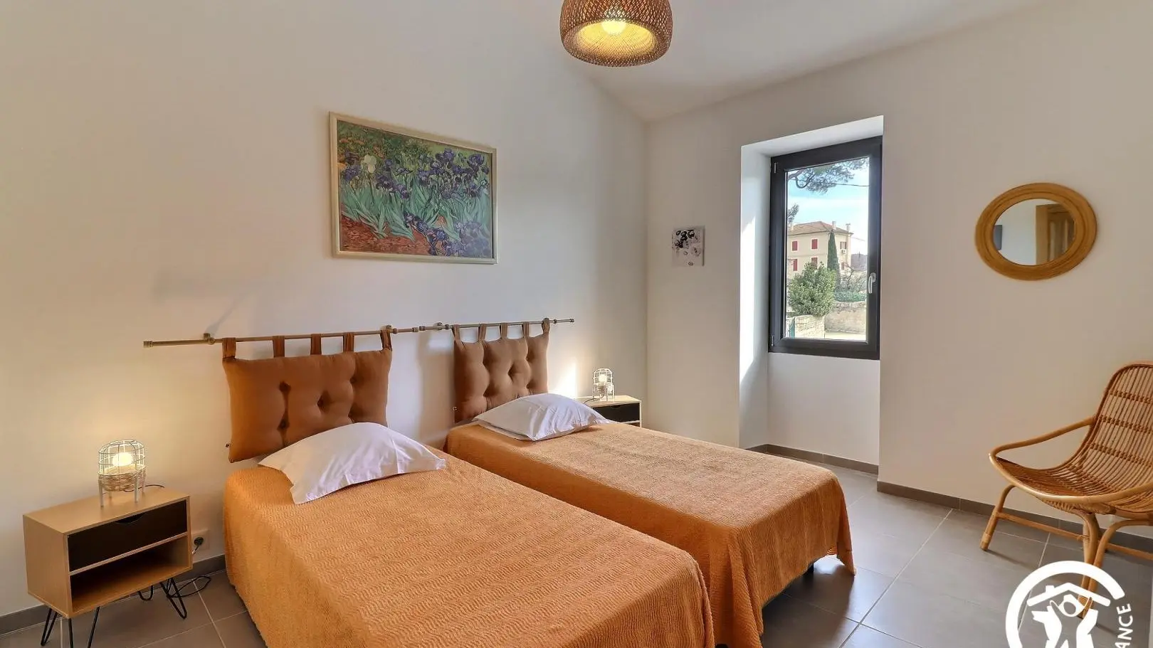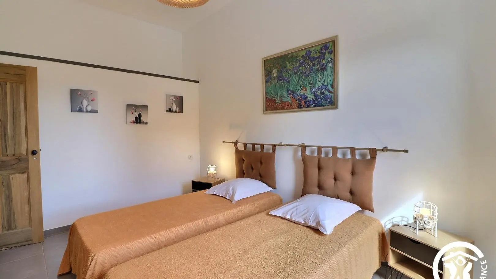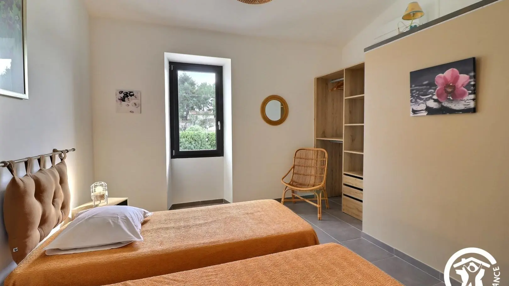 - Une 2ème chambre avec 2 lits 1 personne 90x200cm, penderie dressing et fauteuil en osier.