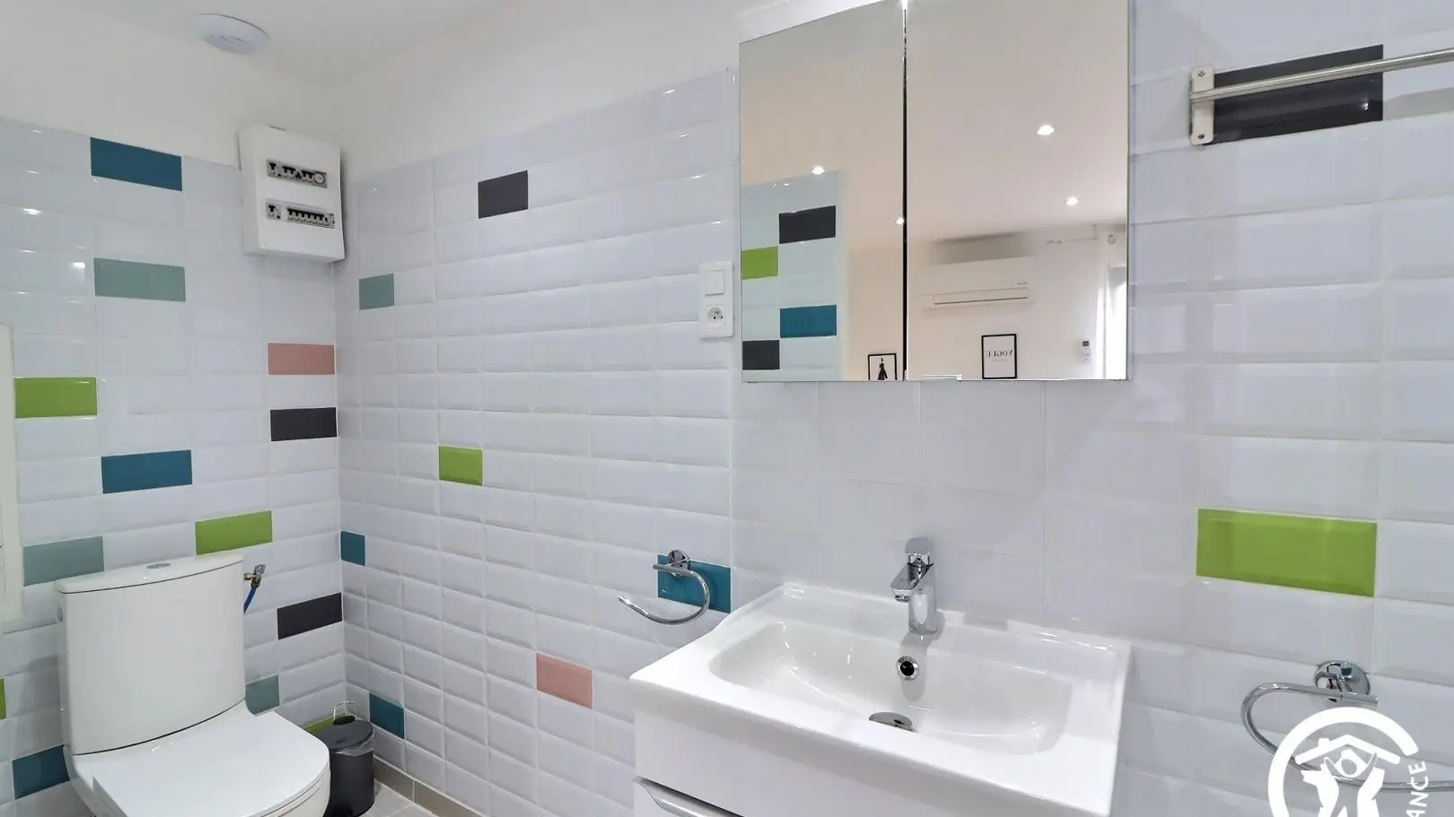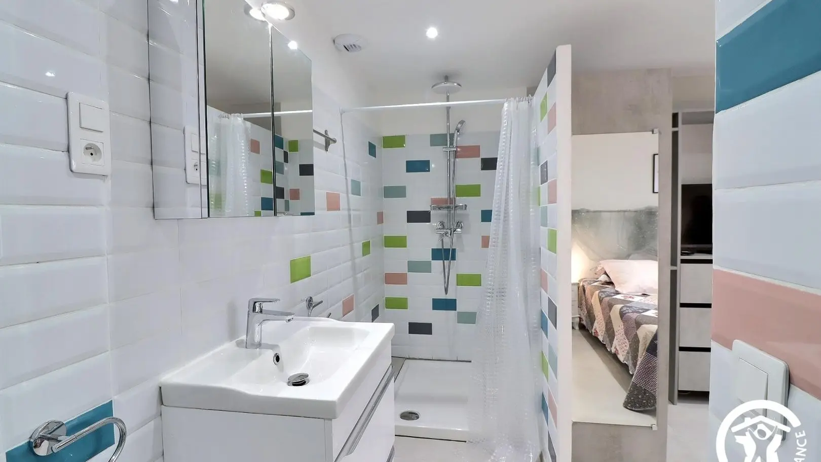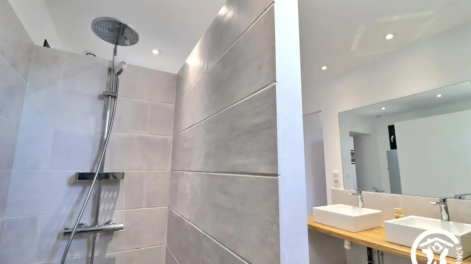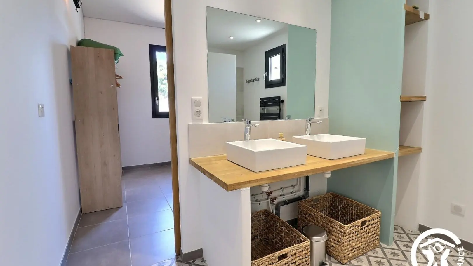 - Salle d'eau avec douche à l'italienne 90x120cm, double vasque, porte-serviettes chauffant, étagères, miroir en pied et bac à linge.