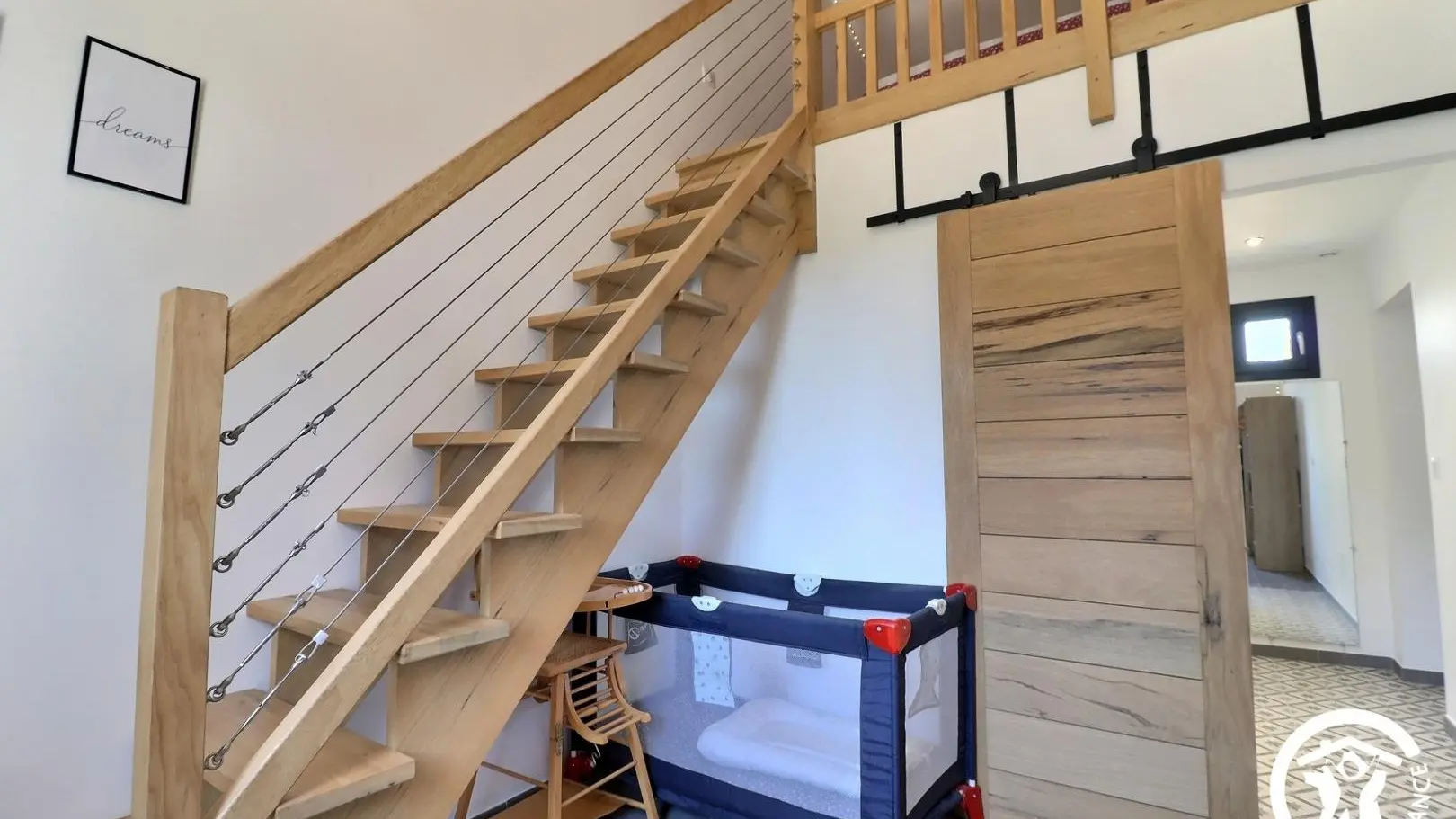 - Une chambre enfant avec une salle de jeux sur mezzanine, penderie dressing et système de lumière d'ambiance. Cette chambre est accessible via la salle d'eau.