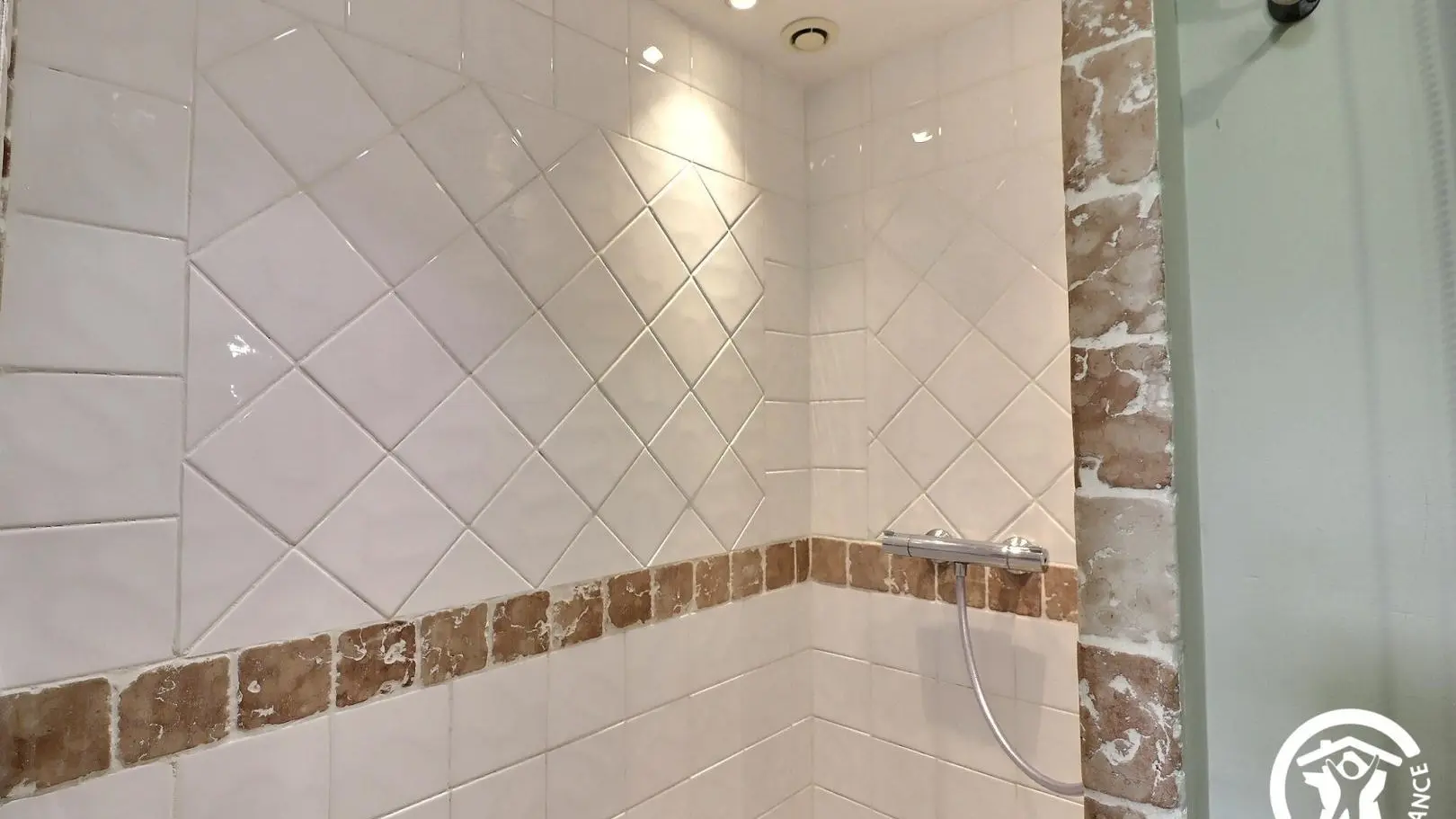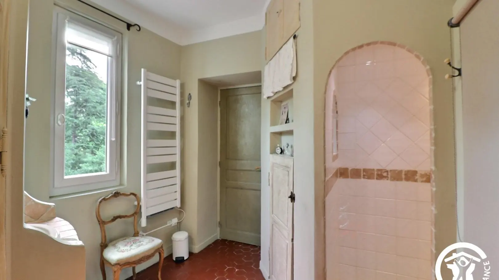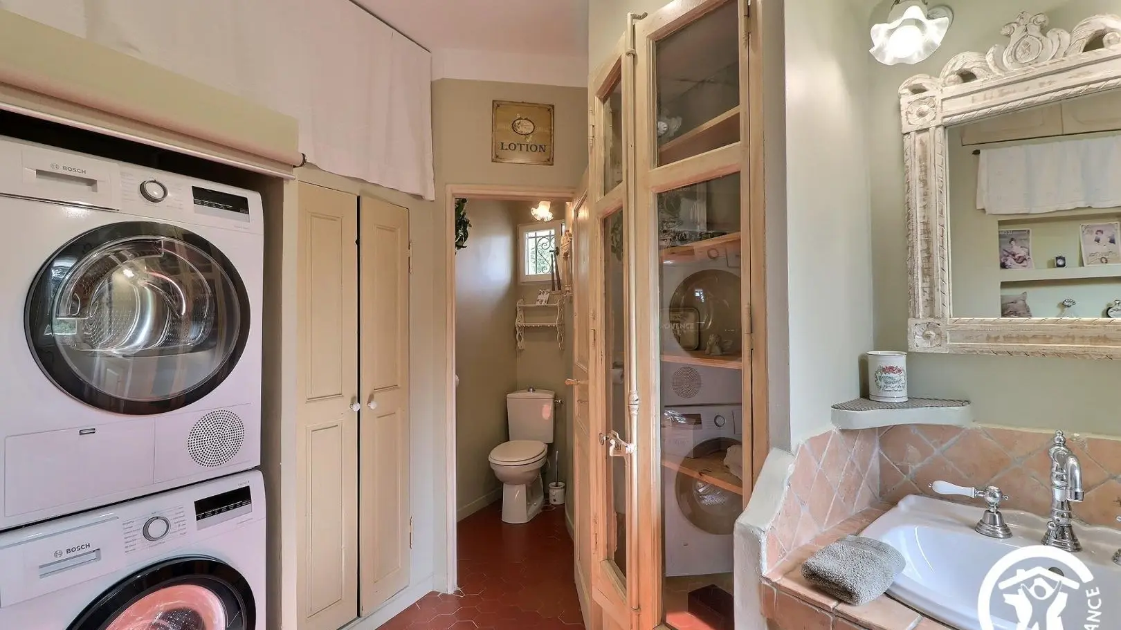 - Salle d'eau avec douche (thermostatique), lavabo avec rangements, sèche-serviettes soufflant, lave-linge, sèche-linge et WC fermé.